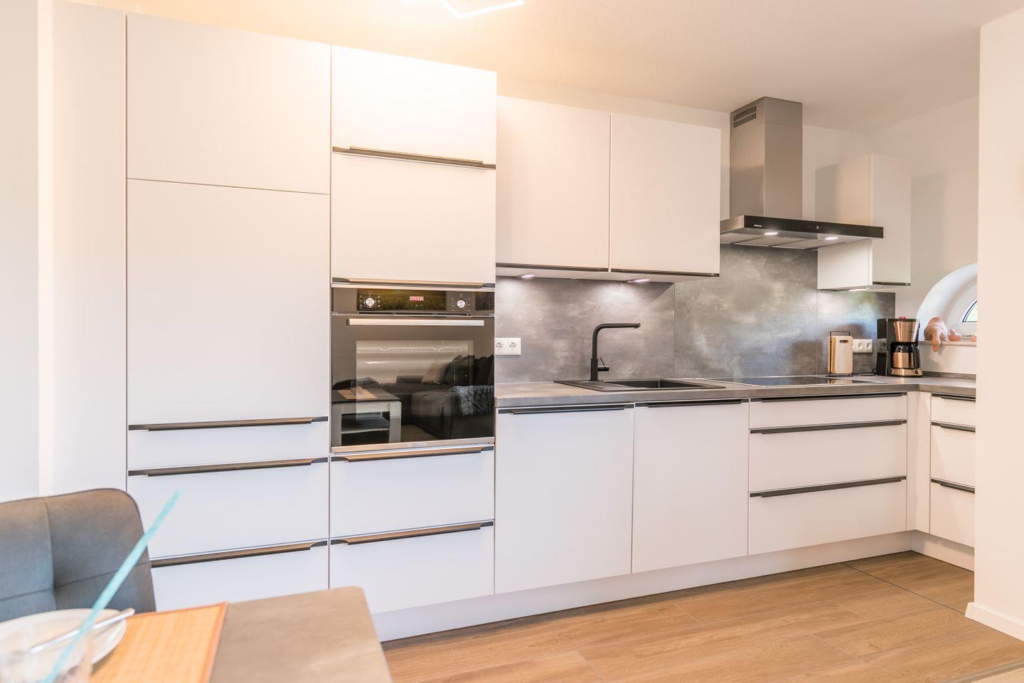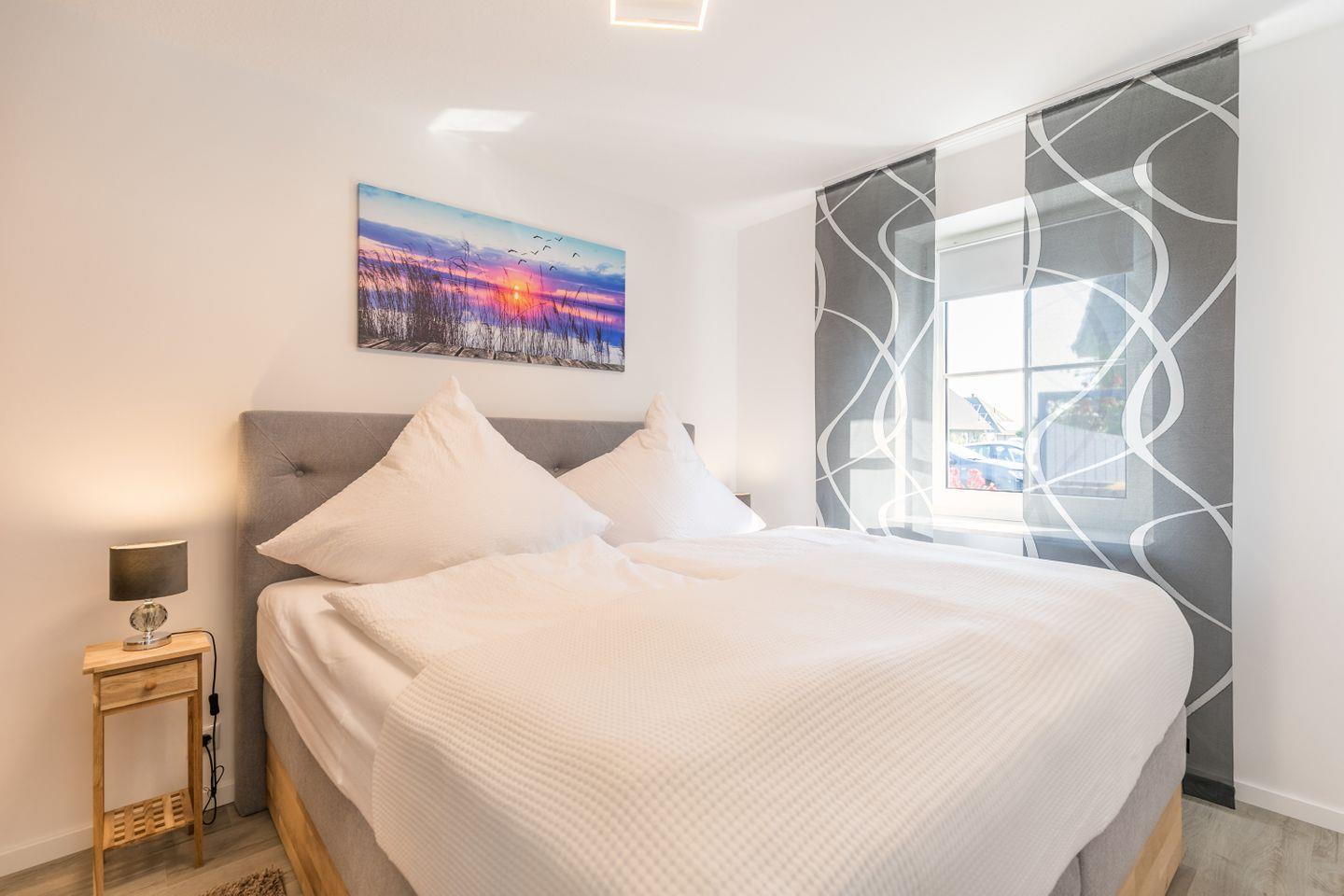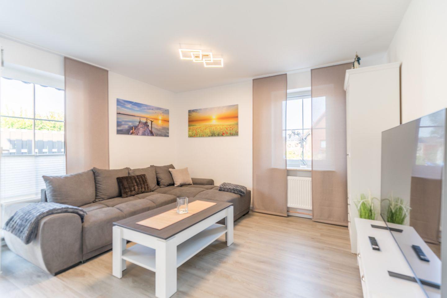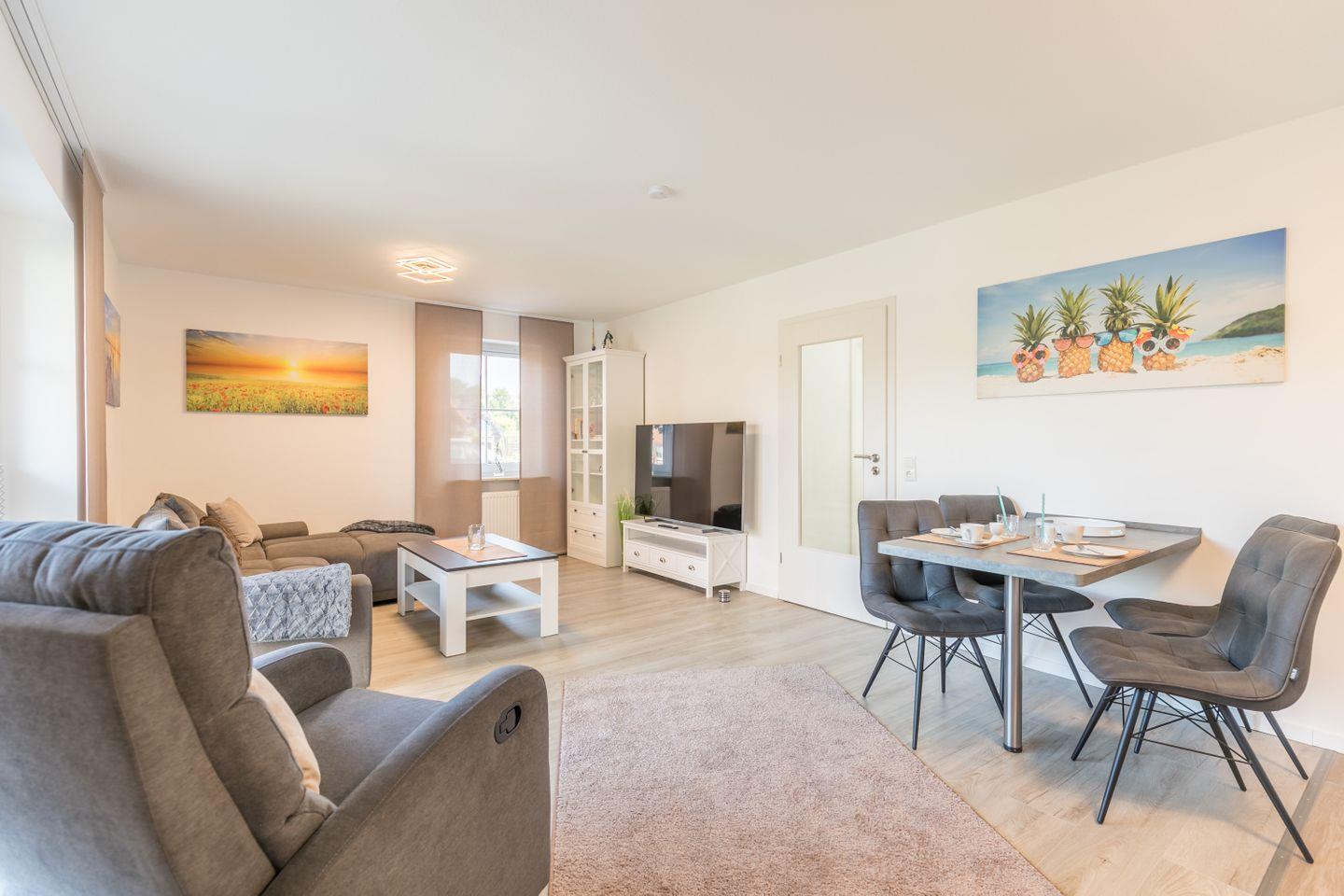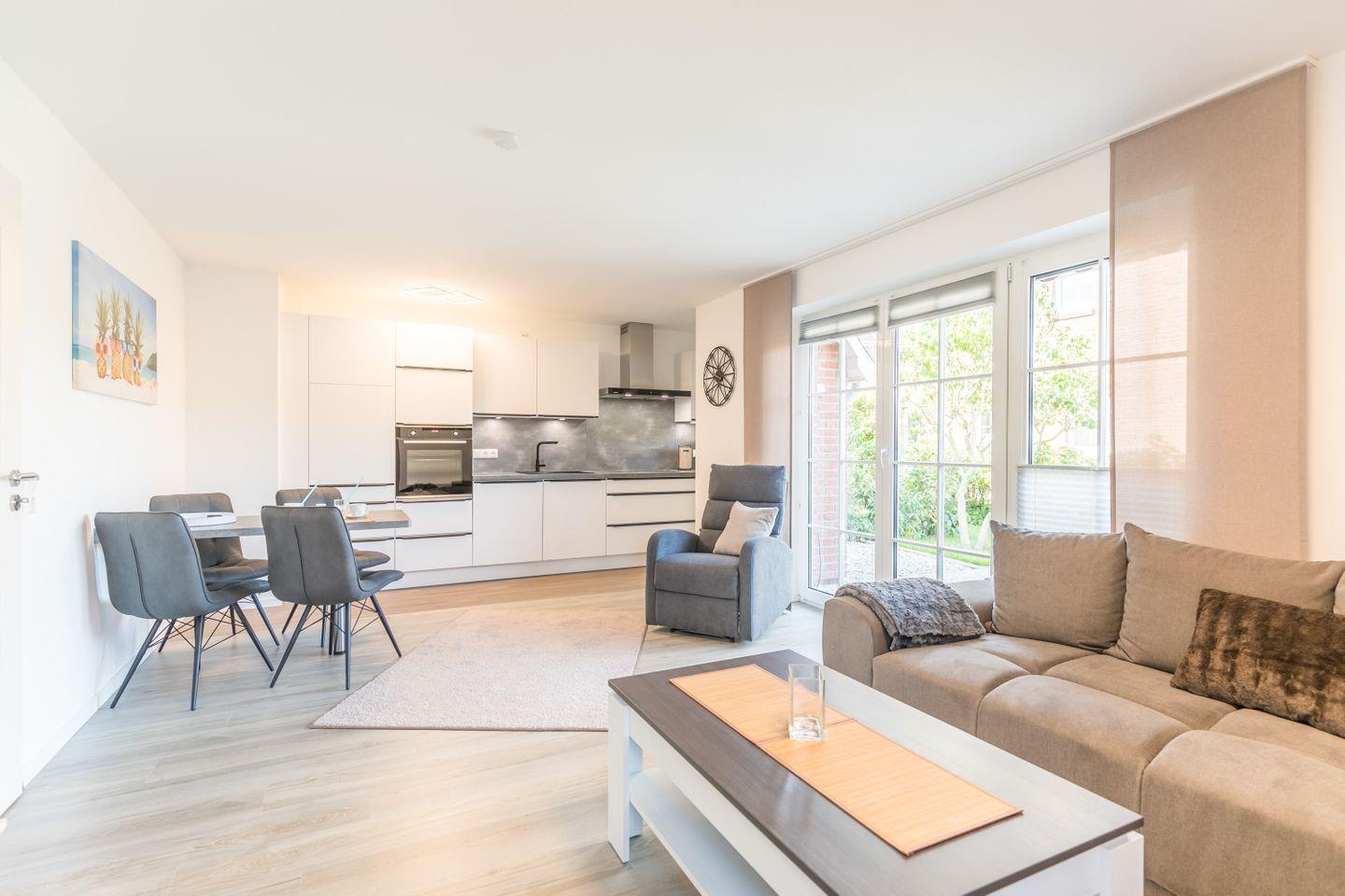 Ein Wohnzimmer mit Schlafcouch, eine vollständig ausgestattete Küche mit Geschirrspülmaschine, Bad mit ebenerdiger Dusche und WC und ein gemütliches Boxspringbett im Schlafzimmer sorgen für den Wohlfühlfaktor.