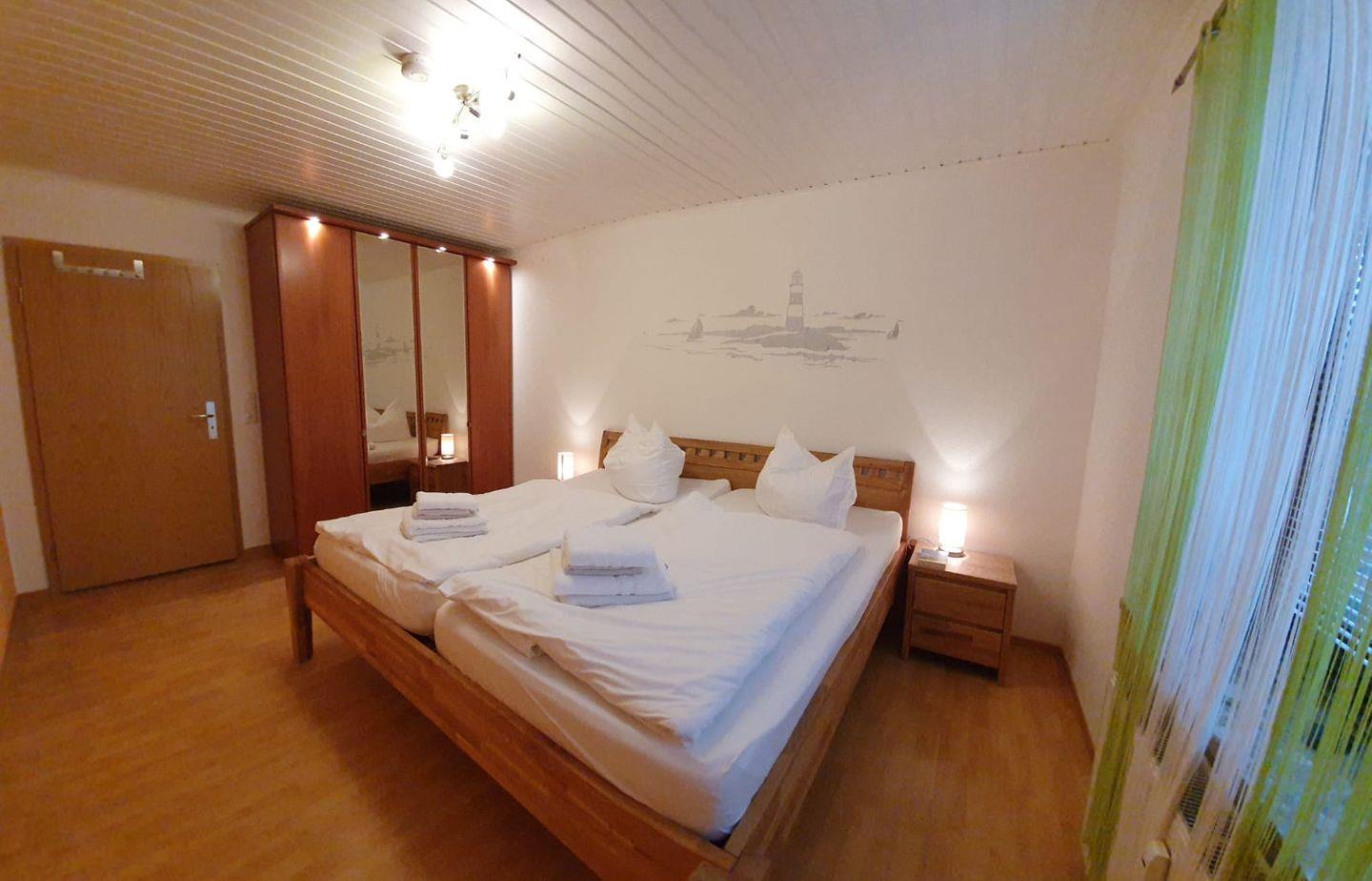 Das geräumige Schlafzimmer ist mit einem Doppelbett (2m x 2m mit Einzelmatratzen), einem Kleiderschrank und Verdunklungsmöglichkeiten ausgestattet, auch ein Babyreisebett findet hier genügend Platz.