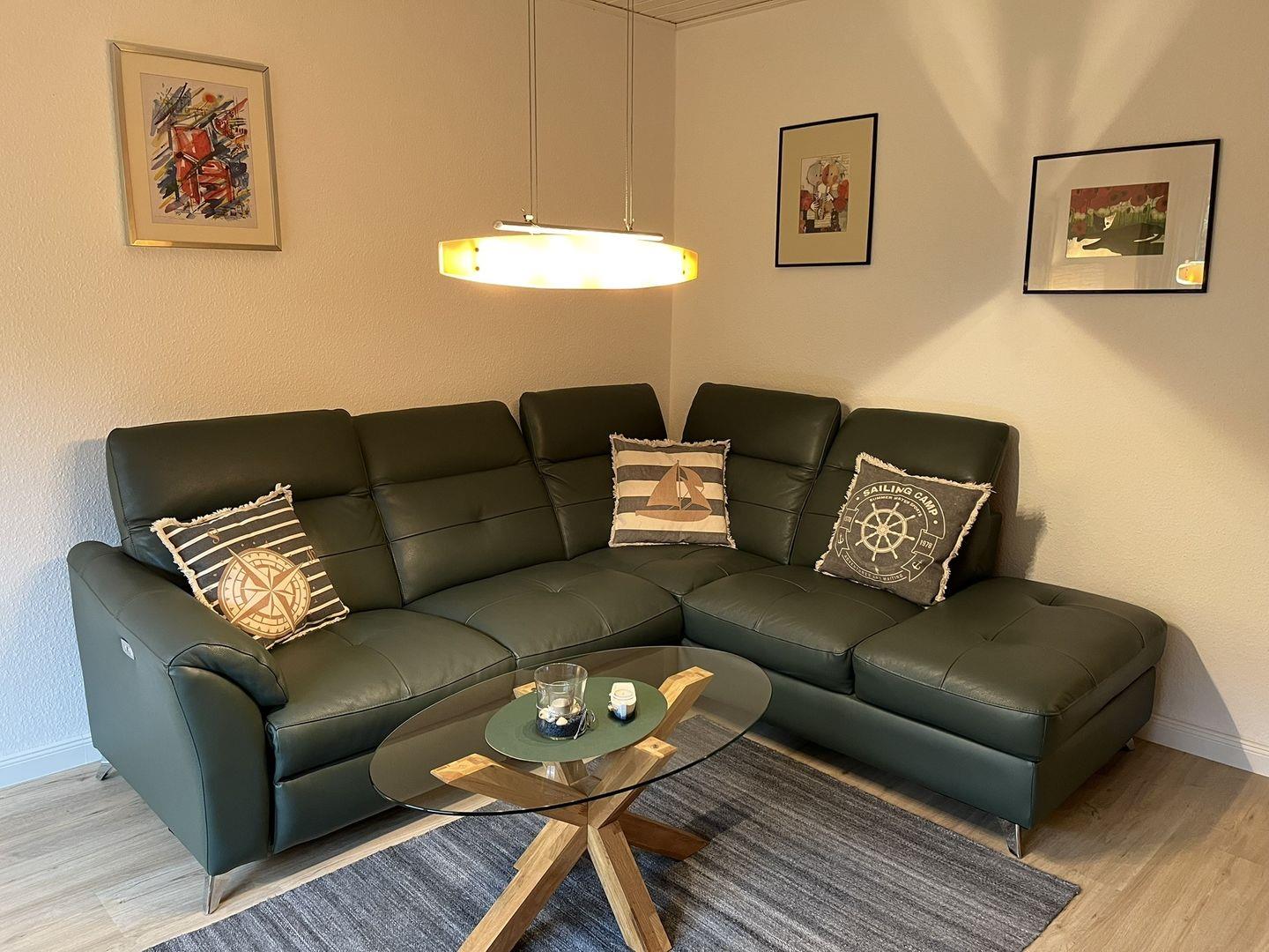Das gemütliche Wohnzimmer ist mit einer bequemen Ledercouch ausgestattet, die genug Platz zum Faulenzen bietet. Von dort erreicht man die große Terrasse auf der man herrliche Stunden verbringen kann.