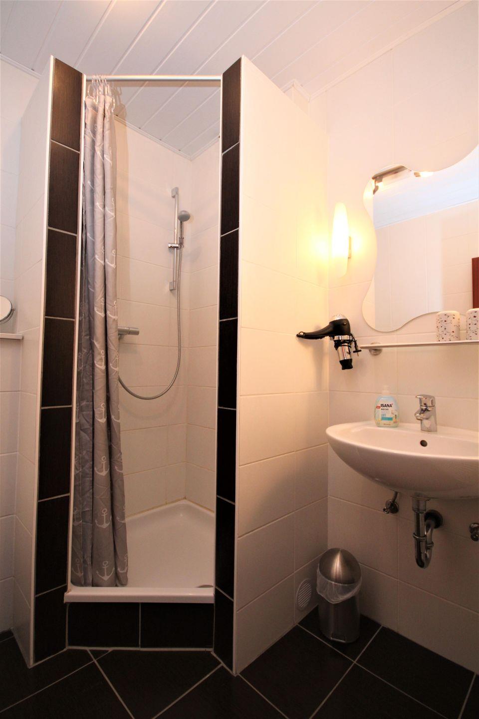 Das Badezimmer mit Dusche, Handtuchwärmer und Föhn ist, wie der Rest der Wohnung, schick und modern.