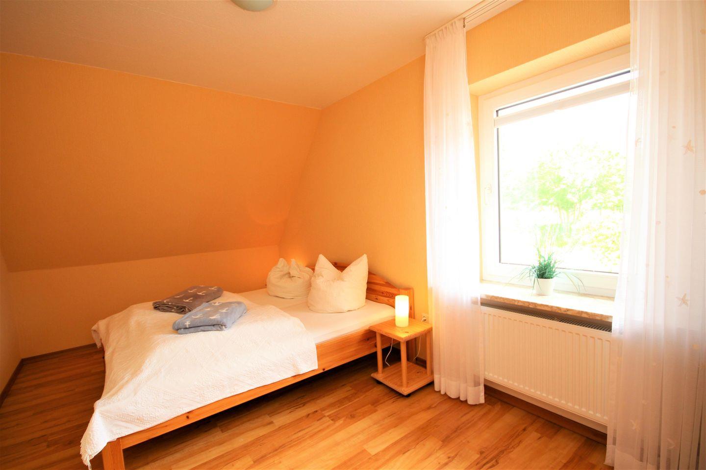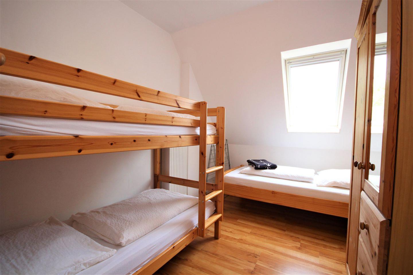 Von den 2 Schlafräumen ist eines mit einem Doppelbett ( 2 Einzelmatratzen) und das andere mit einem Einzelbetten und einem Etagenbett eingerichtet. Platz für ihre Urlaubsgarderobe gibt es ausreichend. Ein Kinderbett für kleine Gäste (bis 2 Jahre) steht kostenfrei zusätzlich bereit.
