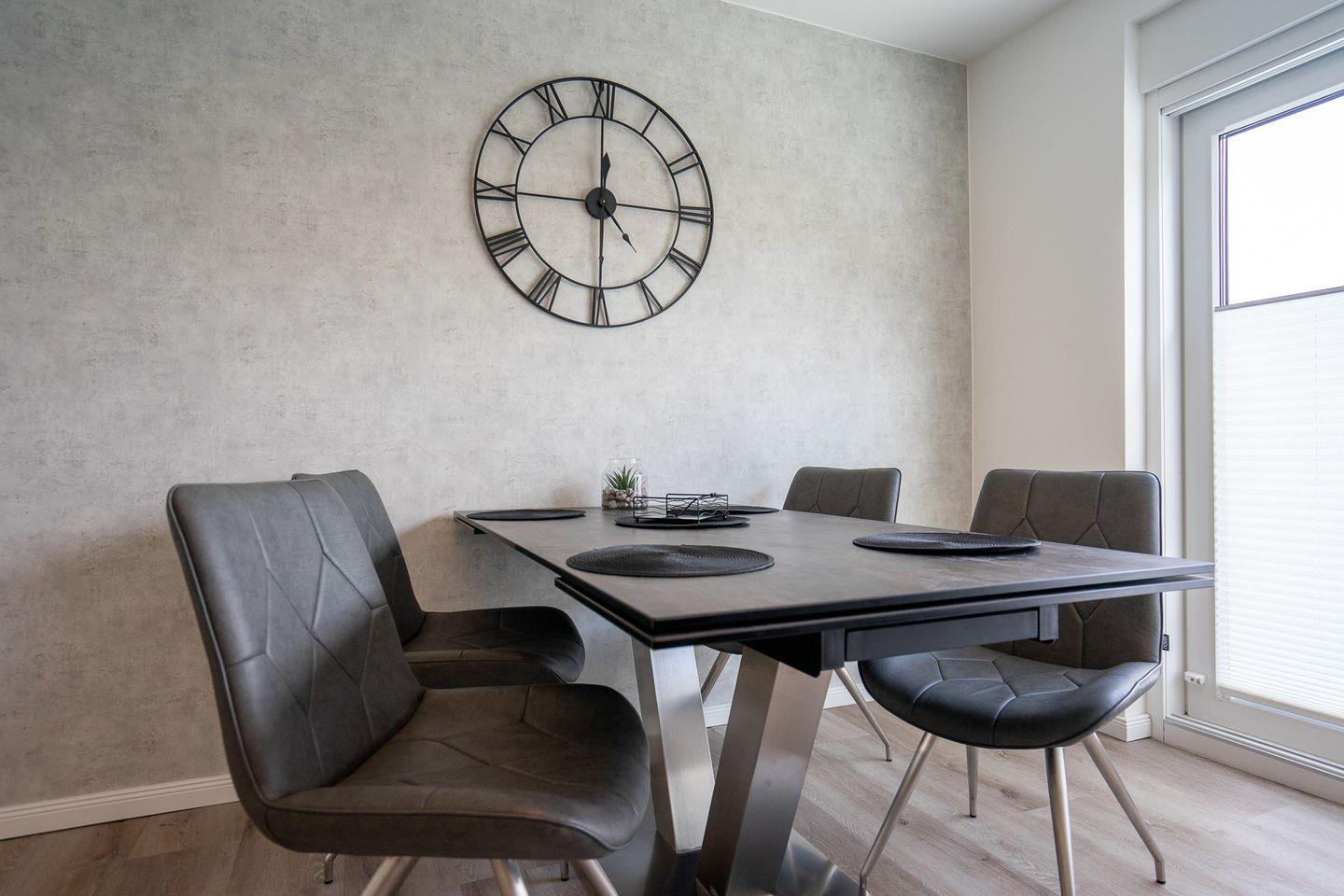 In der hochmodernen Designerküche erwartet Sie ein Induktionskochfeld, ein smarter Backofen mit Mikrowellenfunktion und eine großzügige Spülmaschine. Ein Toaster, ein Wasserkocher, eine Kaffeemaschine und ein Kühlschrank mit integriertem Tiefkühlfach sind selbstverständlich auch Bestandteil der schönen Küche.