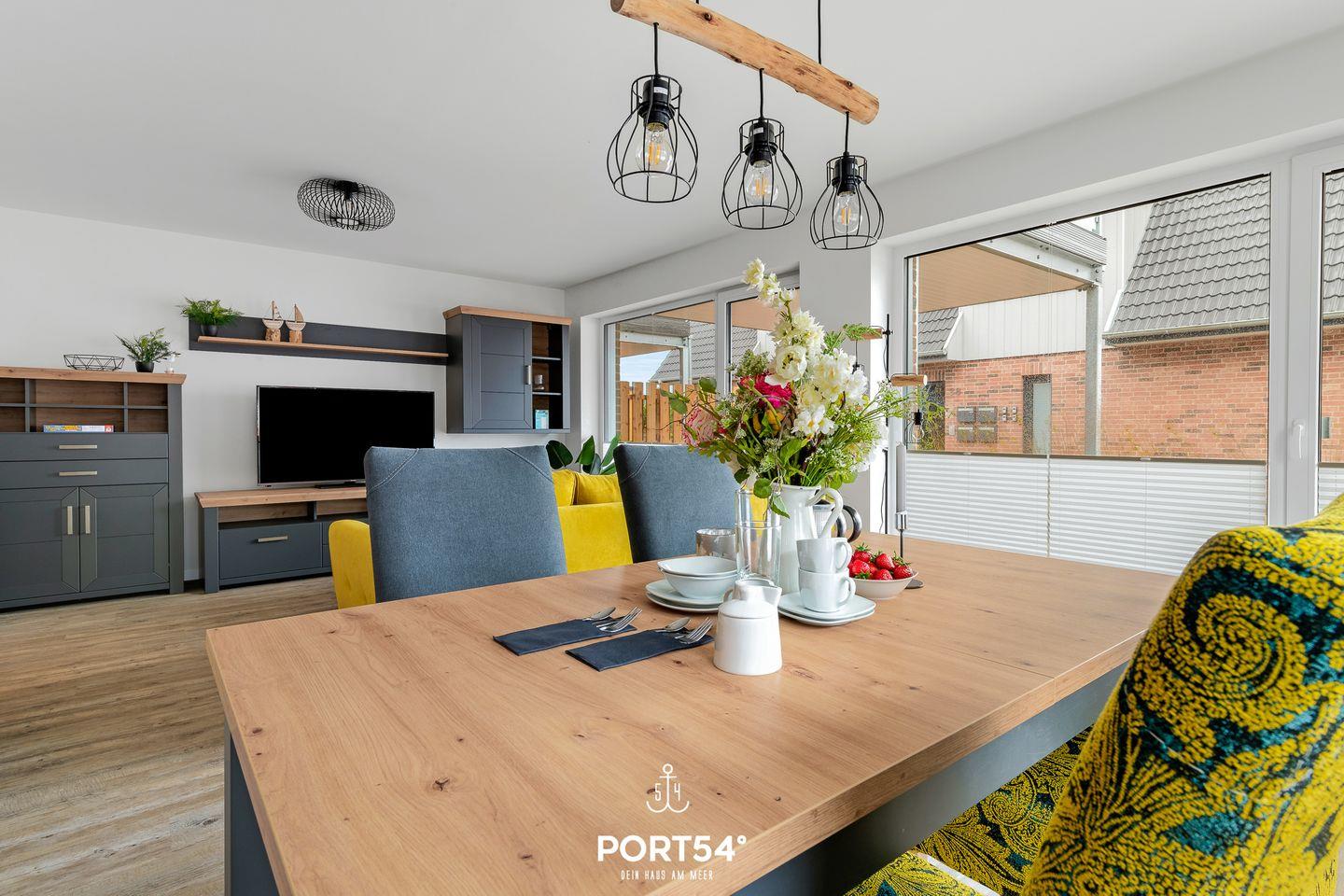 In gehobener und exklusiver Holzständerwerk-Bauweise erwartet Sie die im Erdgeschoss gelegene Ferienwohnung "Küste 5" auf etwa 64m². Der lichtdurchflutete Wohnbereich ist mit einer gemütlichen Wohnlandschaft inklusive Schlaffunktion (250x160cm) und einem Flachbild-TV ausgestattet. Die angrenzende Küche ist offen gestaltet und bietet alle Annehmlichkeiten, die für einen geselligen Kochabend benötigt werden. Am Esstisch mit gemütlichen Stühlen können Sie bequem gemeinsam essen oder einen Spieleabend verbringen. Bodentiefe Fenster lassen viel Licht herein und ermöglichen den Zutritt zur vollmöblierten Terrasse. Im Schlafzimmer erwarten Sie ein großes Doppelbett (180x200cm), sowie Verdunklungsmöglichkeiten für die Fenster. Das Badezimmer ist mit einer ebenerdigen Dusche, einem WC sowie einem Waschbecken ausgestattet. Zudem steht auch ein Fahrradschuppen für die Gäste zu Verfügung.