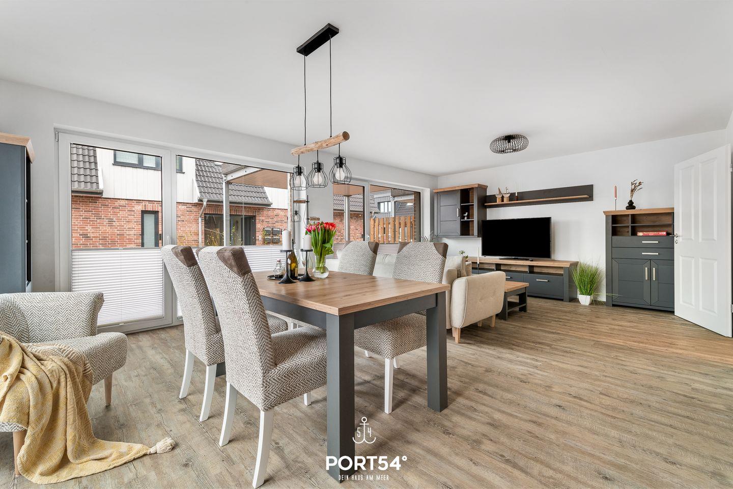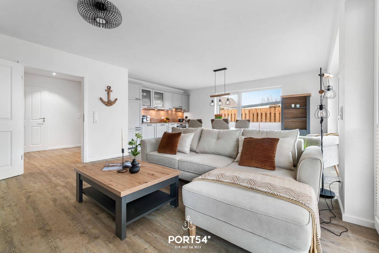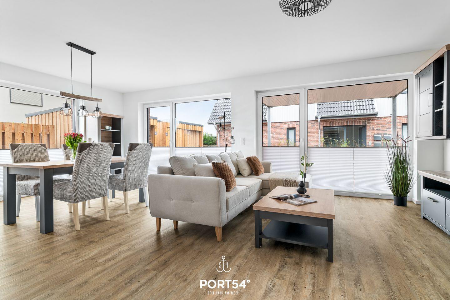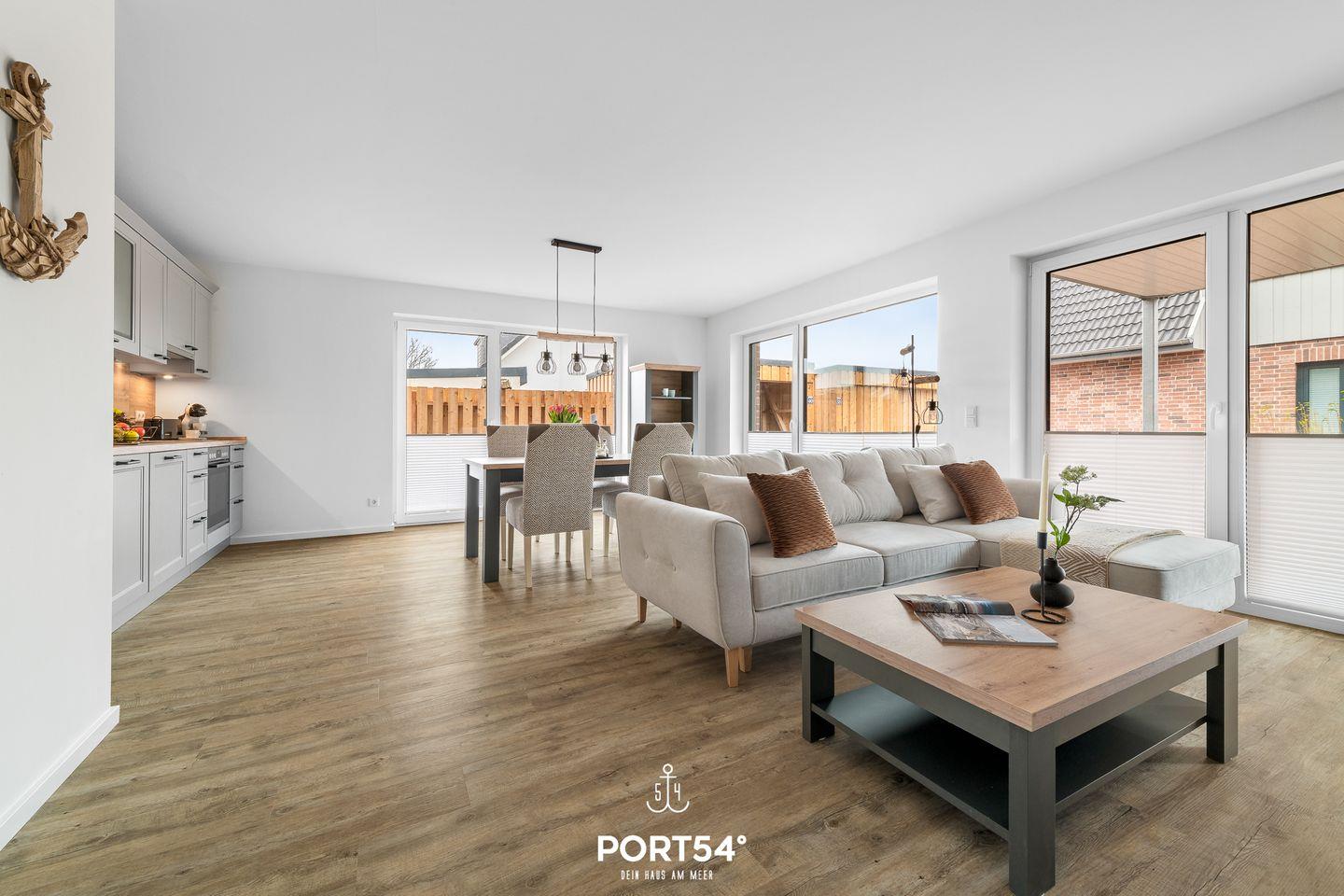 In gehobener und exklusiver Holzständerwerk-Bauweise erwartet Sie die im Erdgeschoss gelegene Ferienwohnung "Küste 6" auf etwa 64m². Der lichtdurchflutete Wohnbereich ist mit einer gemütlichen Wohnlandschaft inklusive Schlaffunktion (250x160cm) und einem Flachbild-TV ausgestattet. Die angrenzende Küche ist offen gestaltet und bietet alle Annehmlichkeiten, die für einen geselligen Kochabend benötigt werden. Am Esstisch mit gemütlichen Stühlen können Sie bequem gemeinsam essen oder einen Spieleabend verbringen. Bodentiefe Fenster lassen viel Licht herein und ermöglichen den Zutritt zur vollmöblierten Terrasse. Im Schlafzimmer erwarten Sie ein großes Doppelbett (180x200cm), sowie Verdunklungsmöglichkeiten für die Fenster. Das Badezimmer ist mit einer ebenerdigen Dusche, einem WC sowie einem Waschbecken ausgestattet. Zudem steht ein Fahrradschuppen für die Gäste zur Verfügung.