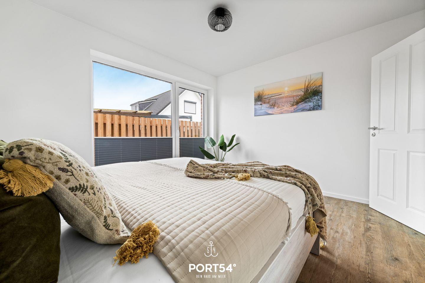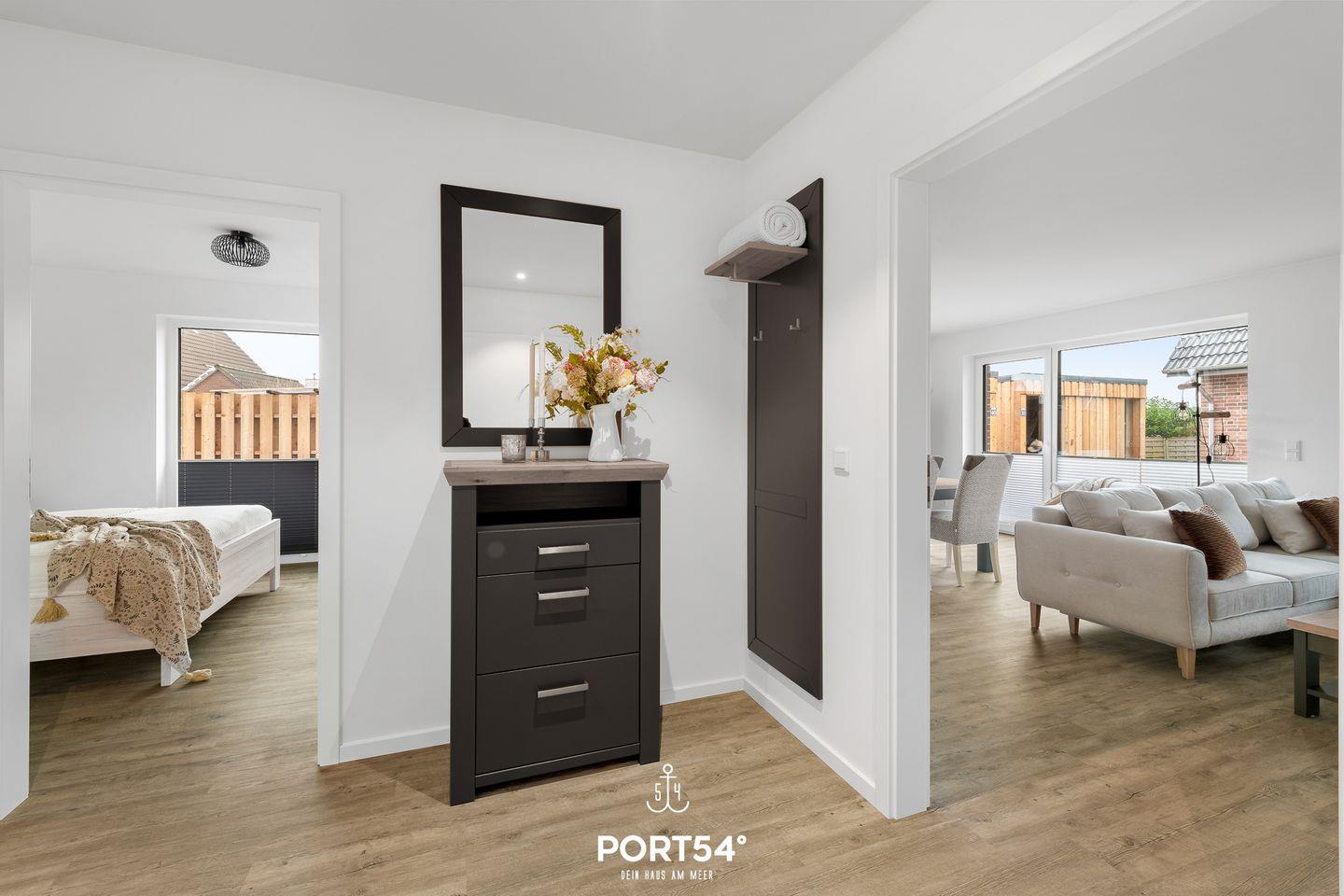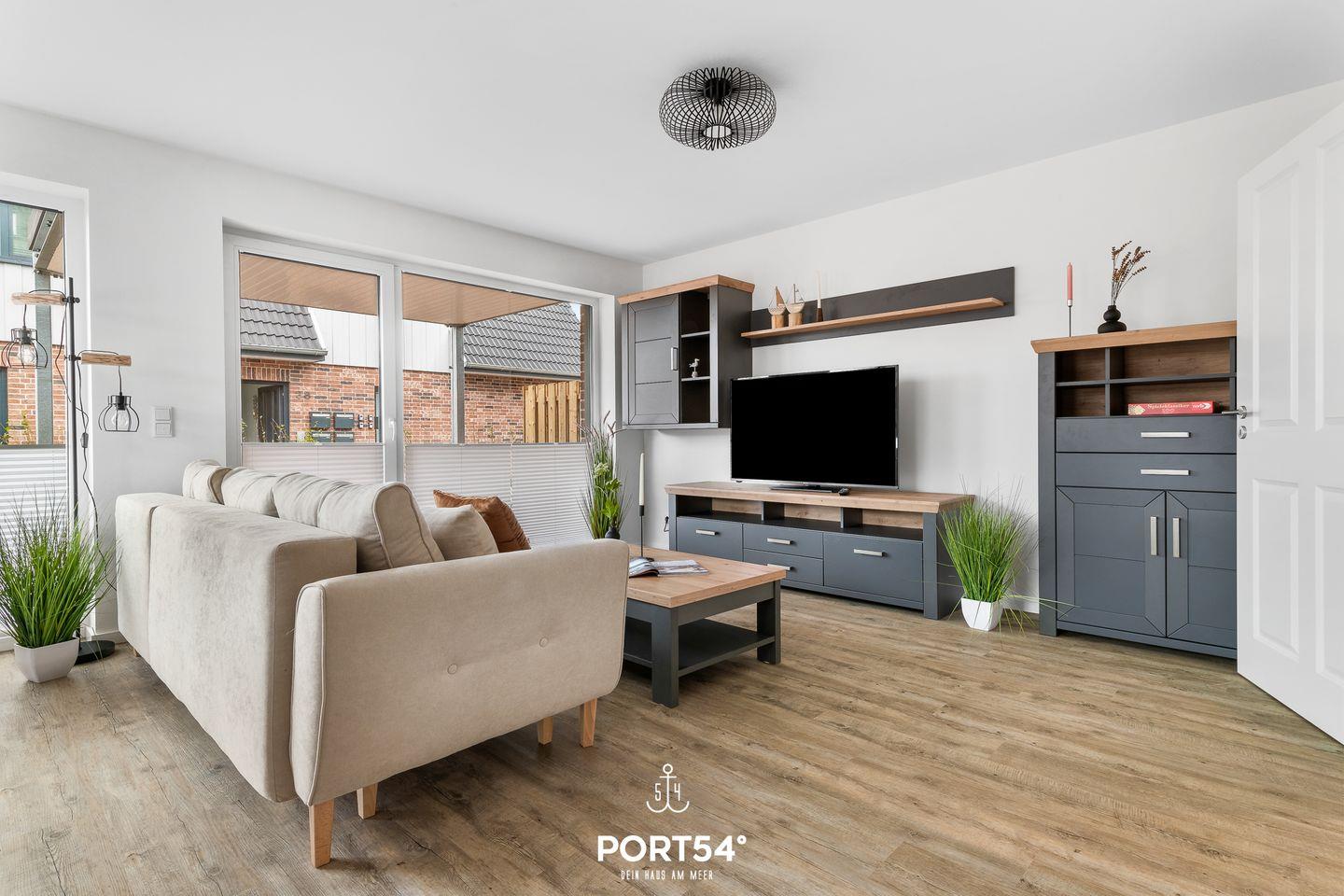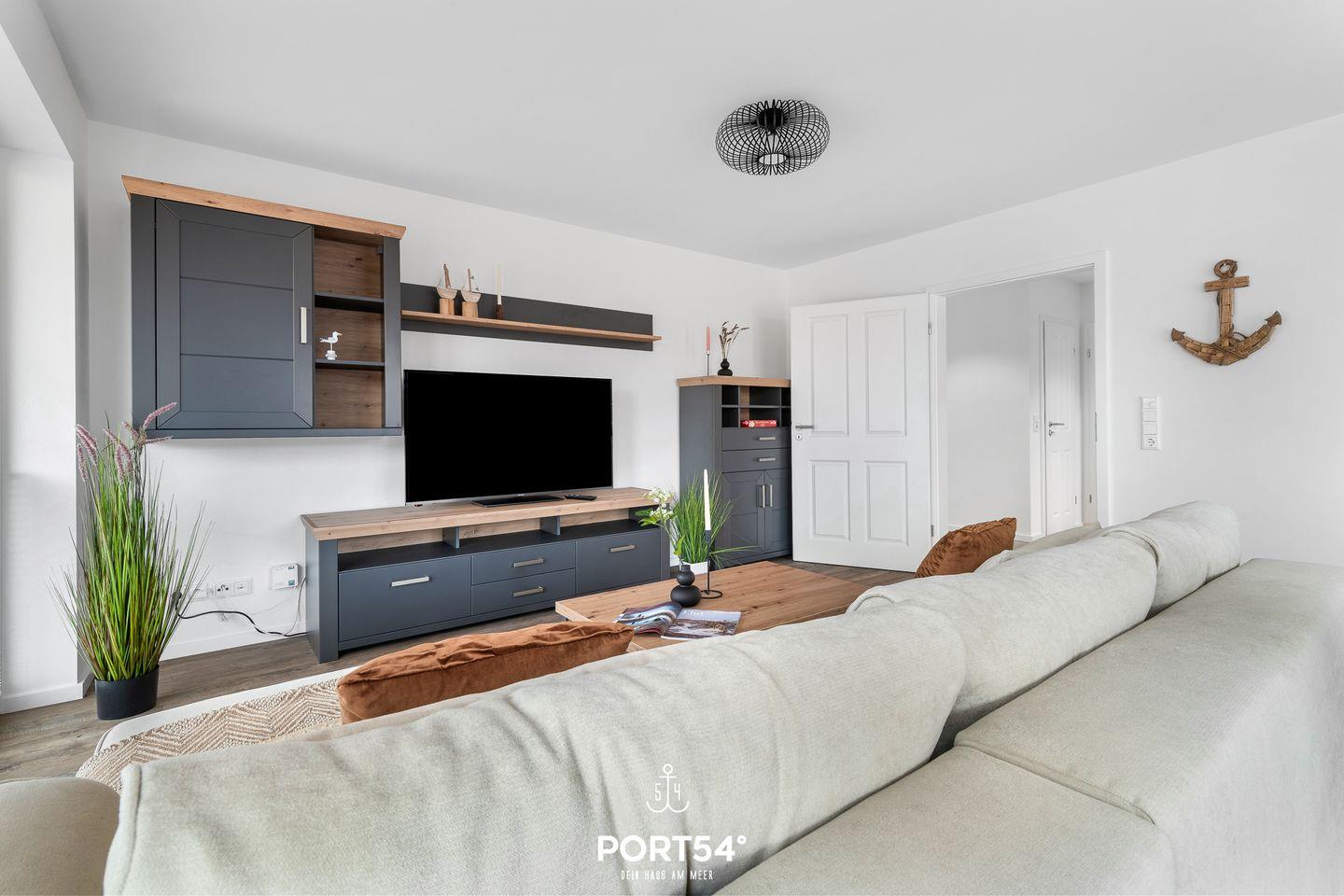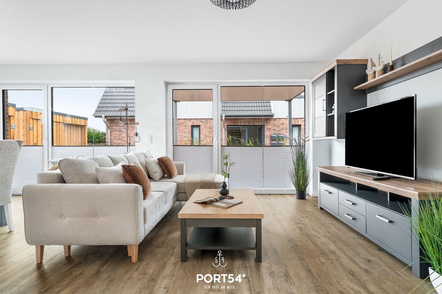 In gehobener und exklusiver Holzständerwerk-Bauweise erwartet Sie die im Erdgeschoss gelegene Ferienwohnung "Küste 6" auf etwa 64m². Der lichtdurchflutete Wohnbereich ist mit einer gemütlichen Wohnlandschaft inklusive Schlaffunktion (250x160cm) und einem Flachbild-TV ausgestattet. Die angrenzende Küche ist offen gestaltet und bietet alle Annehmlichkeiten, die für einen geselligen Kochabend benötigt werden. Am Esstisch mit gemütlichen Stühlen können Sie bequem gemeinsam essen oder einen Spieleabend verbringen. Bodentiefe Fenster lassen viel Licht herein und ermöglichen den Zutritt zur vollmöblierten Terrasse. Im Schlafzimmer erwarten Sie ein großes Doppelbett (180x200cm), sowie Verdunklungsmöglichkeiten für die Fenster. Das Badezimmer ist mit einer ebenerdigen Dusche, einem WC sowie einem Waschbecken ausgestattet. Zudem steht ein Fahrradschuppen für die Gäste zur Verfügung.