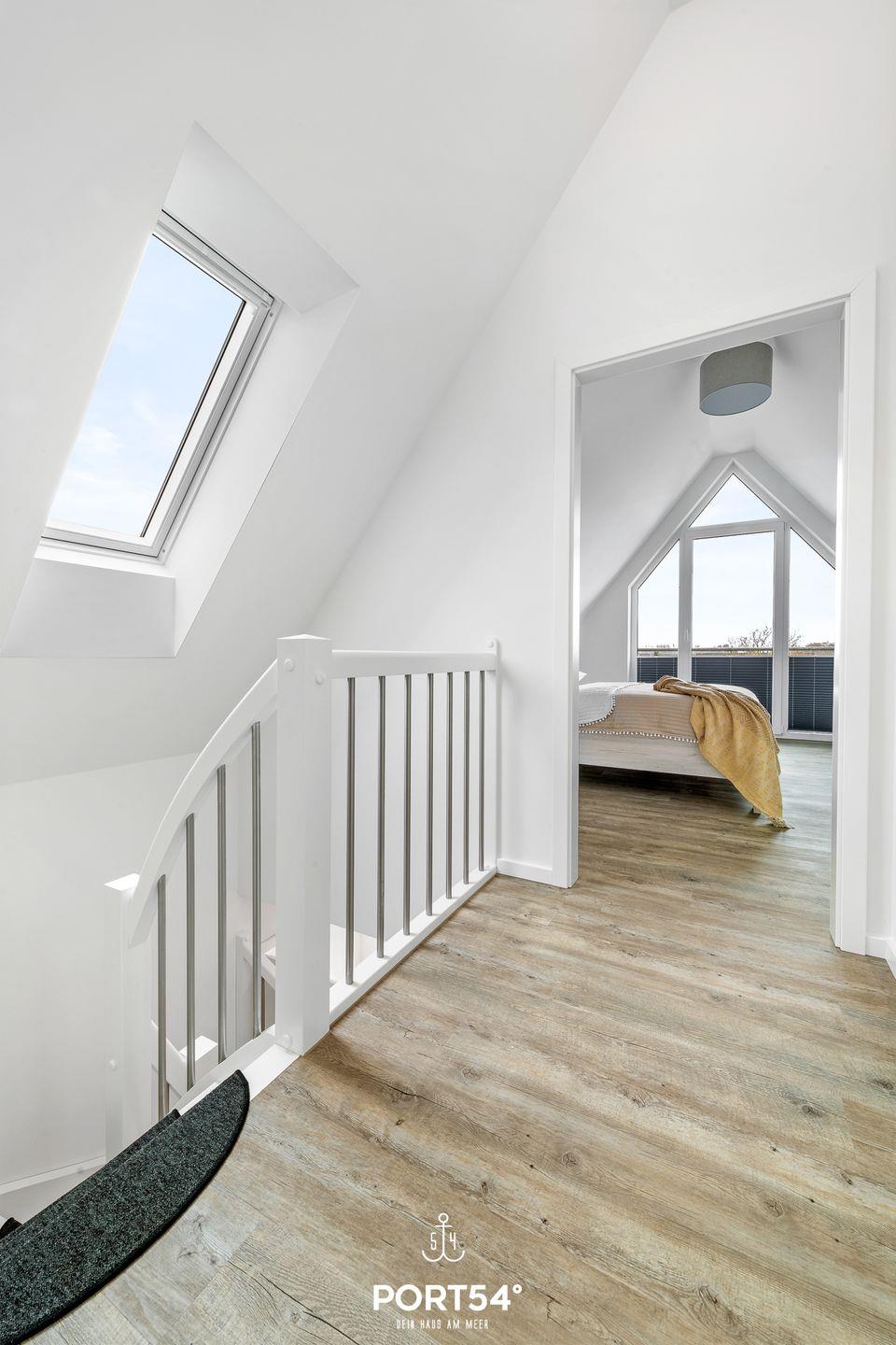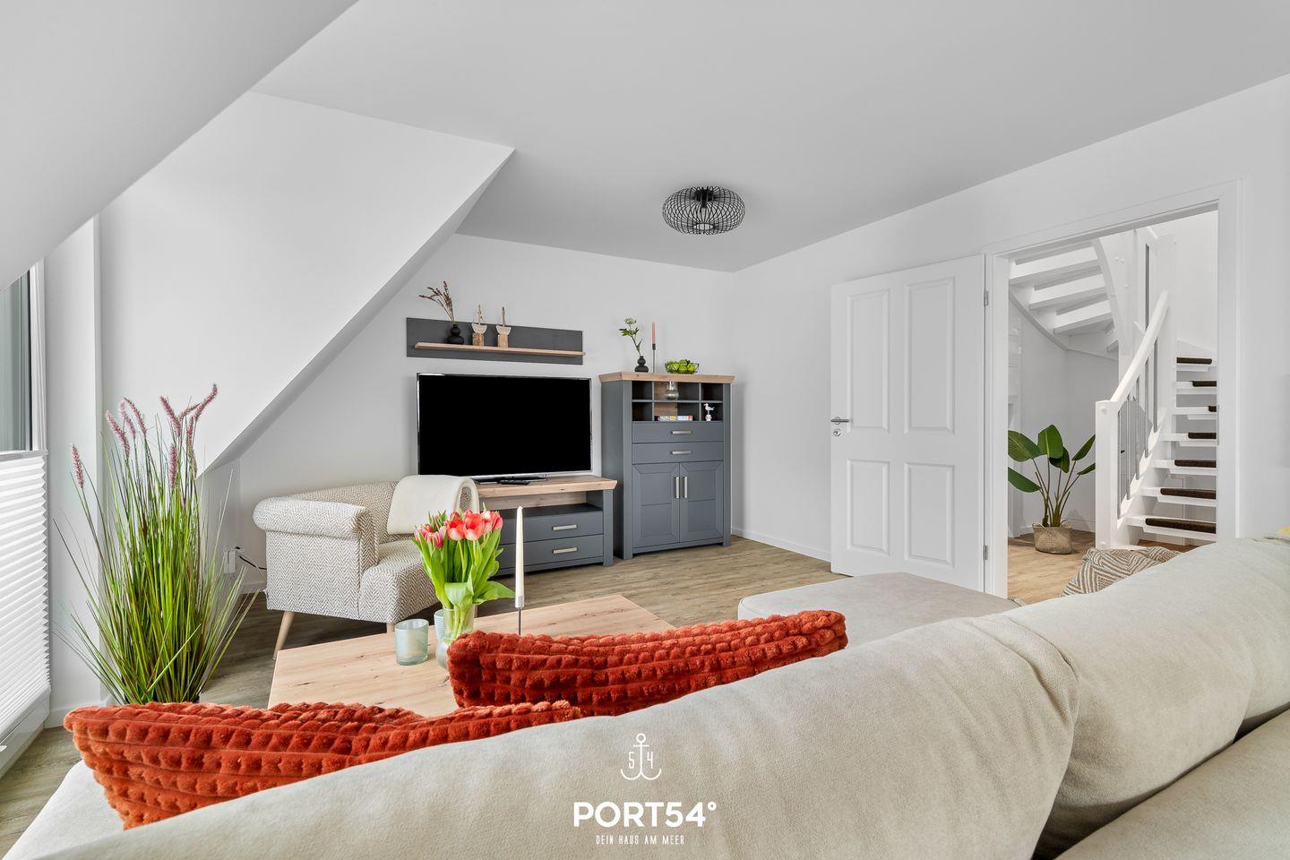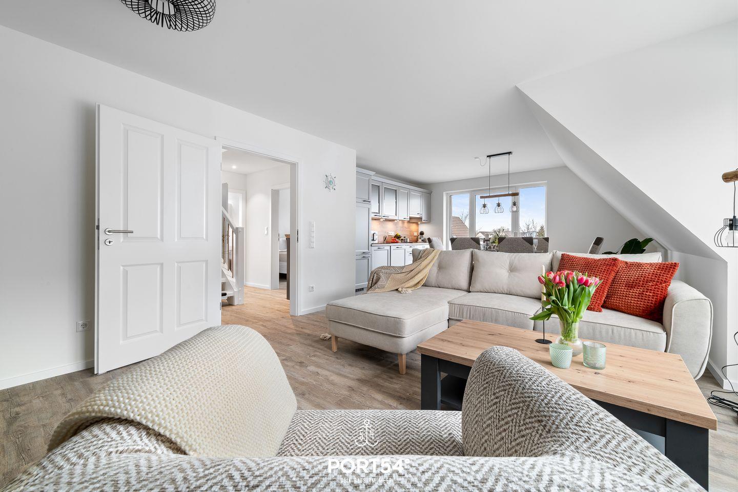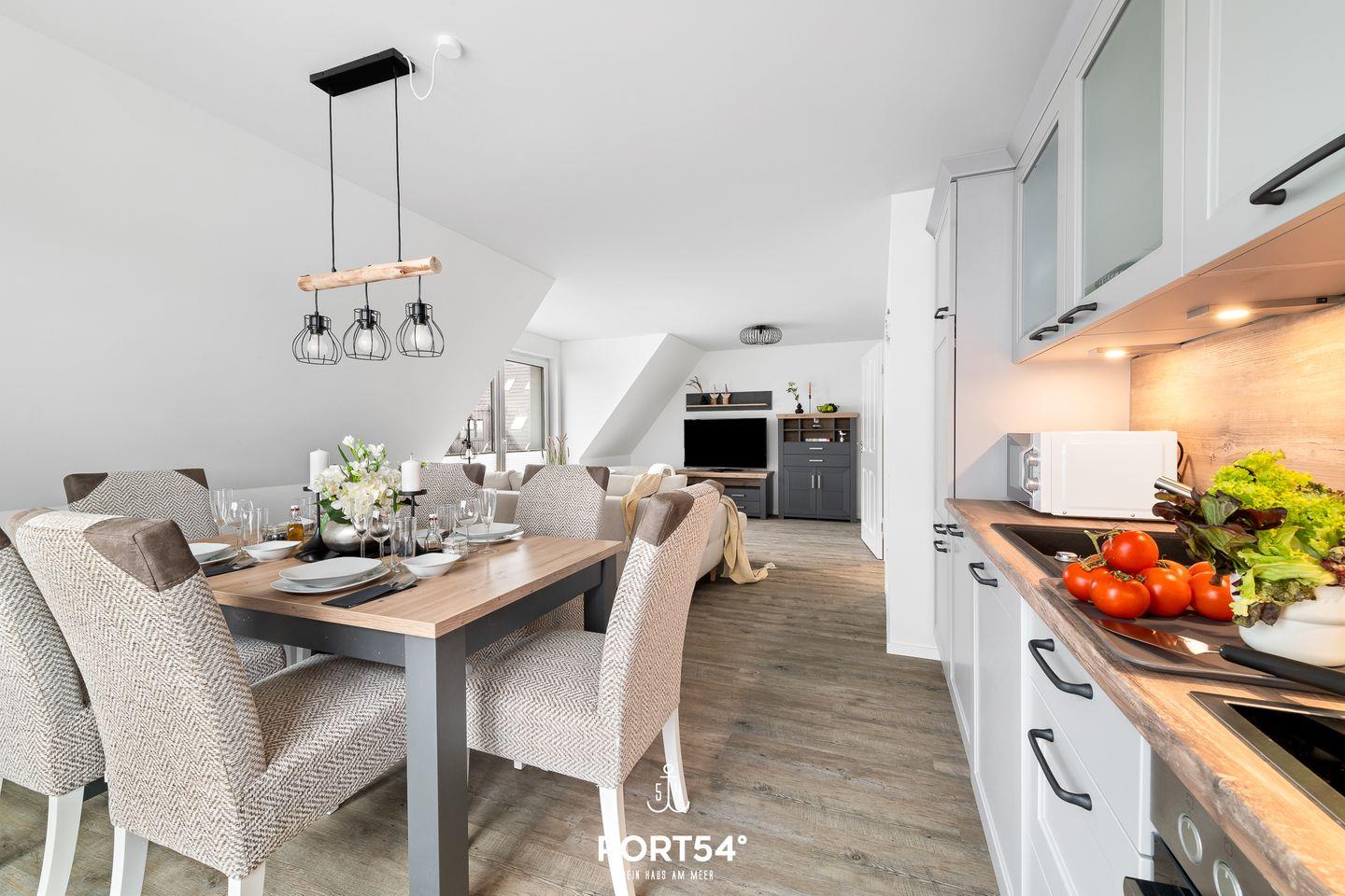 In gehobener und exklusiver Holzständerwerk-Bauweise erwartet Sie die im Dachgeschoss und Spitzboden gelegene Ferienwohnung "Küste 7" auf etwa 85m². Der lichtdurchflutete Wohnbereich ist mit einer gemütlichen Wohnlandschaft inklusive Schlaffunktion (250x160cm) und einem Flachbild-TV ausgestattet. Die angrenzende Küche ist offen gestaltet und bietet alle Annehmlichkeiten, die für einen geselligen Kochabend benötigt