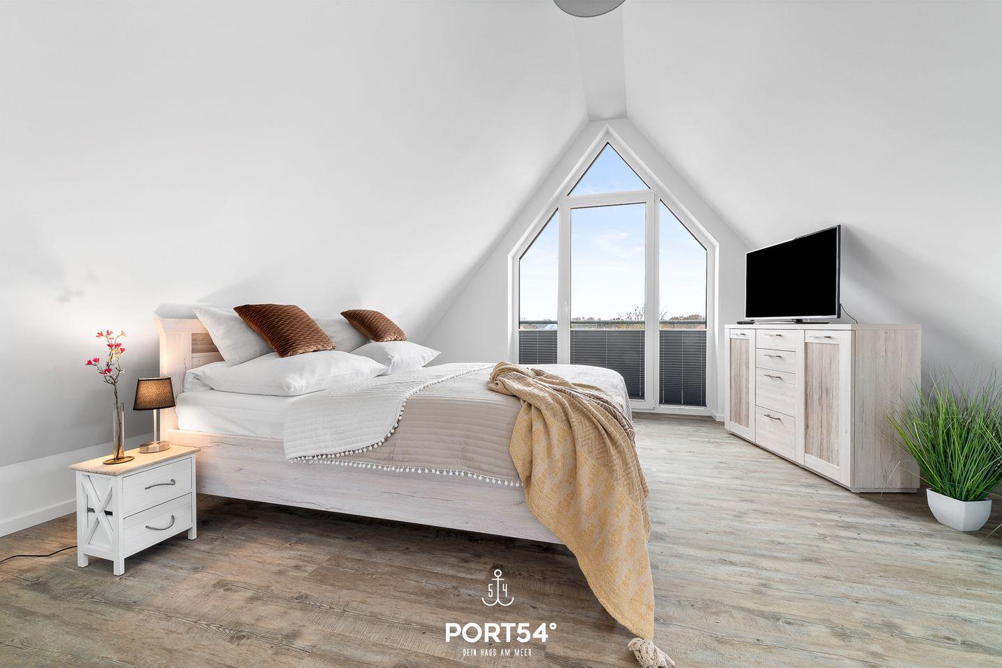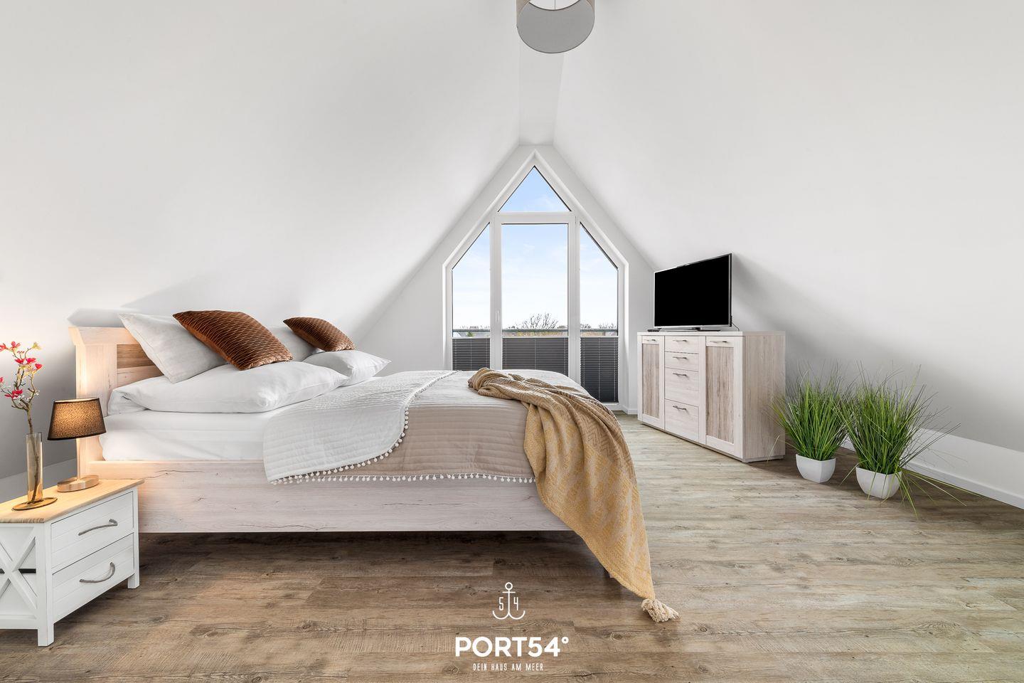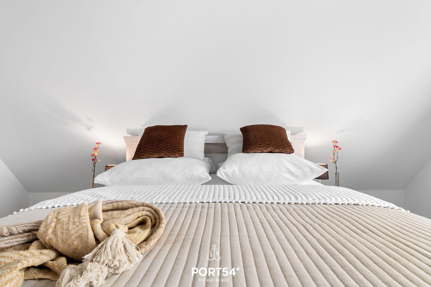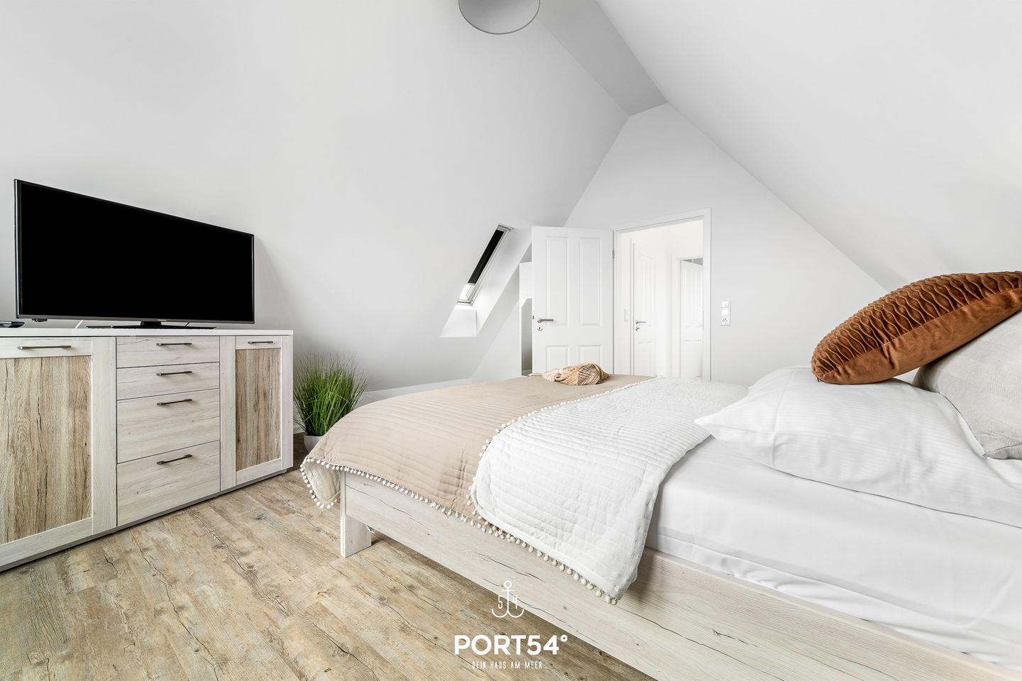 werden. Am Esstisch mit gemütlichen Stühlen können Sie bequem gemeinsam essen oder einen Spieleabend verbringen. Bodentiefe Fenster lassen viel Licht herein und ermöglichen den Zutritt zum vollmöblierten Balkon. In einem der beiden Schlafzimmer erwartet Sie ein großes Doppelbett (180x200cm), sowie verdunkelbare Fenster. Das andere Schlafzimmer befindet sich im ausgebauten Spitzboden und bietet ein Doppelbett (160x200cm) und einen weiteren Flachbild-TVr fürs nächtliche Entertainment und Verdunkelungsmöglichkeiten für erholsame Nächte. Das Badezimmer ist mit einer ebenerdigen Dusche, einem WC sowie einem Waschbecken ausgestattet. Im Spitzboden ist ein weiteres Bad mit einem WC sowie einem Waschbecken untergebracht.