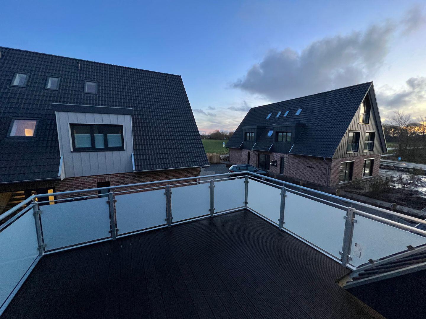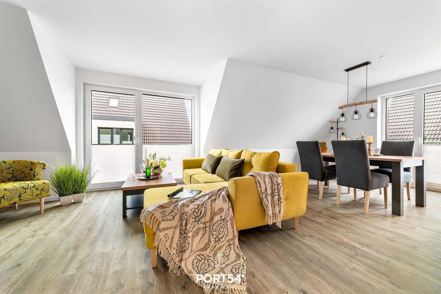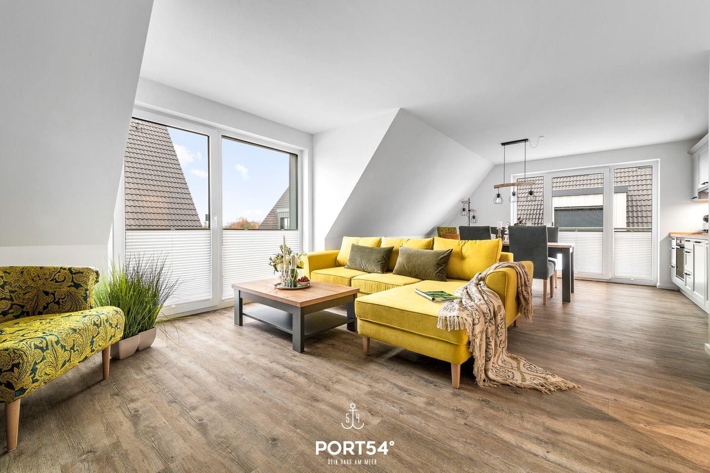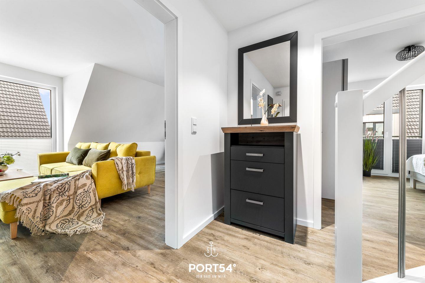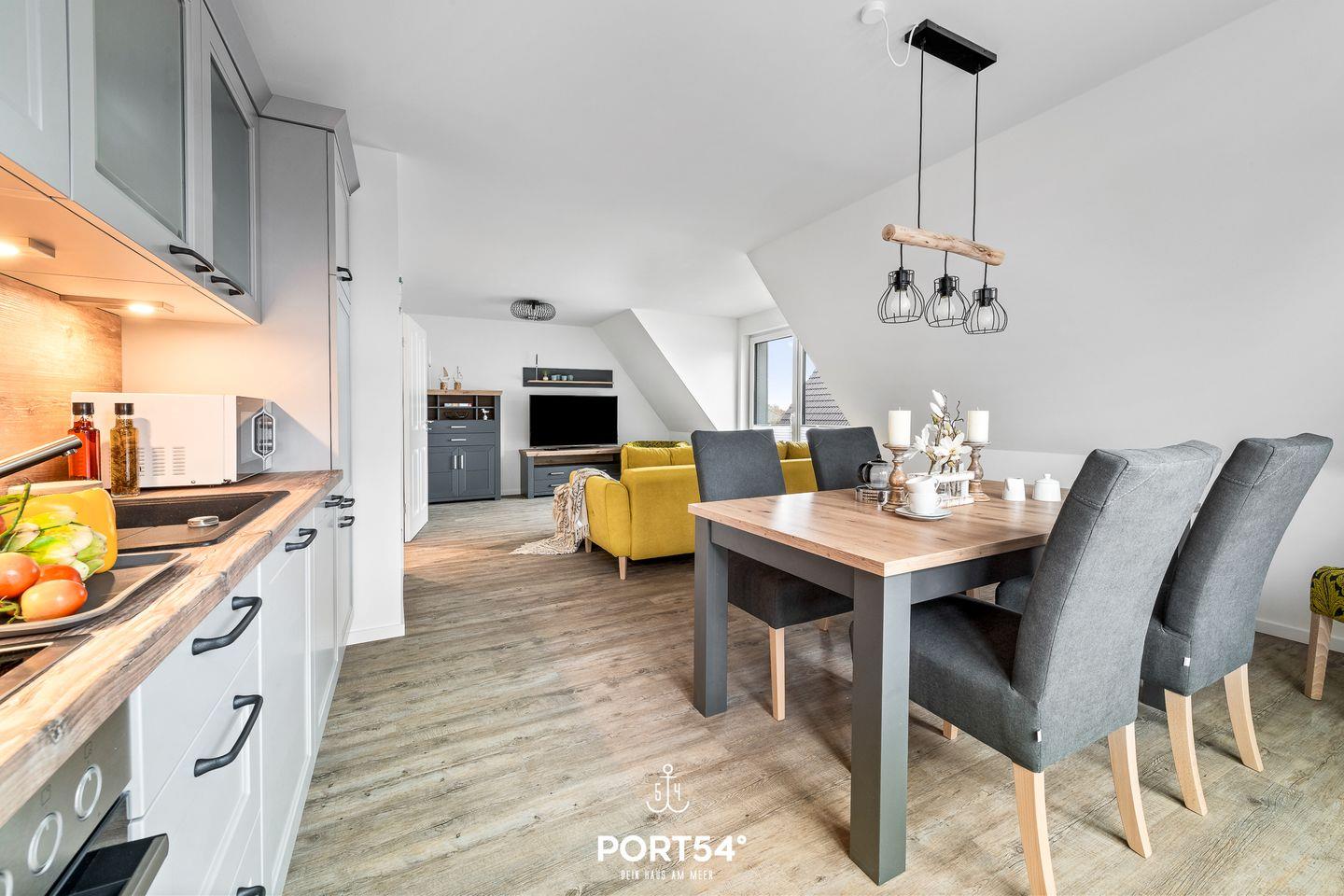 In gehobener und exklusiver Holzständerwerk-Bauweise erwartet Sie die im Dachgeschoss und Spitzboden gelegene Ferienwohnung "Küste 8" auf etwa 85m². Der lichtdurchflutete Wohnbereich ist mit einer gemütlichen Wohnlandschaft inklusive Schlaffunktion (250x160cm) und einem Flachbild-TV ausgestattet. Die angrenzende Küche ist offen gestaltet und bietet alle Annehmlichkeiten, die für einen geselligen Kochabend benötigt werden. Am Esstisch mit gemütlichen Stühlen können Sie bequem gemeinsam essen oder einen Spieleabend verbringen. Bodentiefe Fenster lassen viel Licht herein und ermöglichen den Zutritt zum vollmöblierten Balkon. In einem der beiden Schlafzimmer erwartet Sie ein großes Doppelbett (180x200cm), sowie verdunkelbare Fenster. Das andere Schlafzimmer befindet sich im ausgebauten Spitzboden und bietet ein Doppelbett (160x200cm) und einen weiteren Flachbild-TV fürs nächtliche Entertainment und Verdunkelungsmöglichkeiten für erholsame Nächte. Das Badezimmer ist mit einer ebenerdigen Dusche, einem WC sowie einem Waschbecken ausgestattet. Im Spitzboden befindet sich ein Gäste Bad mit WC und Waschbecken. Mitgebrachte Fahrräder können im Fahrradschuppen untergestellt werden.