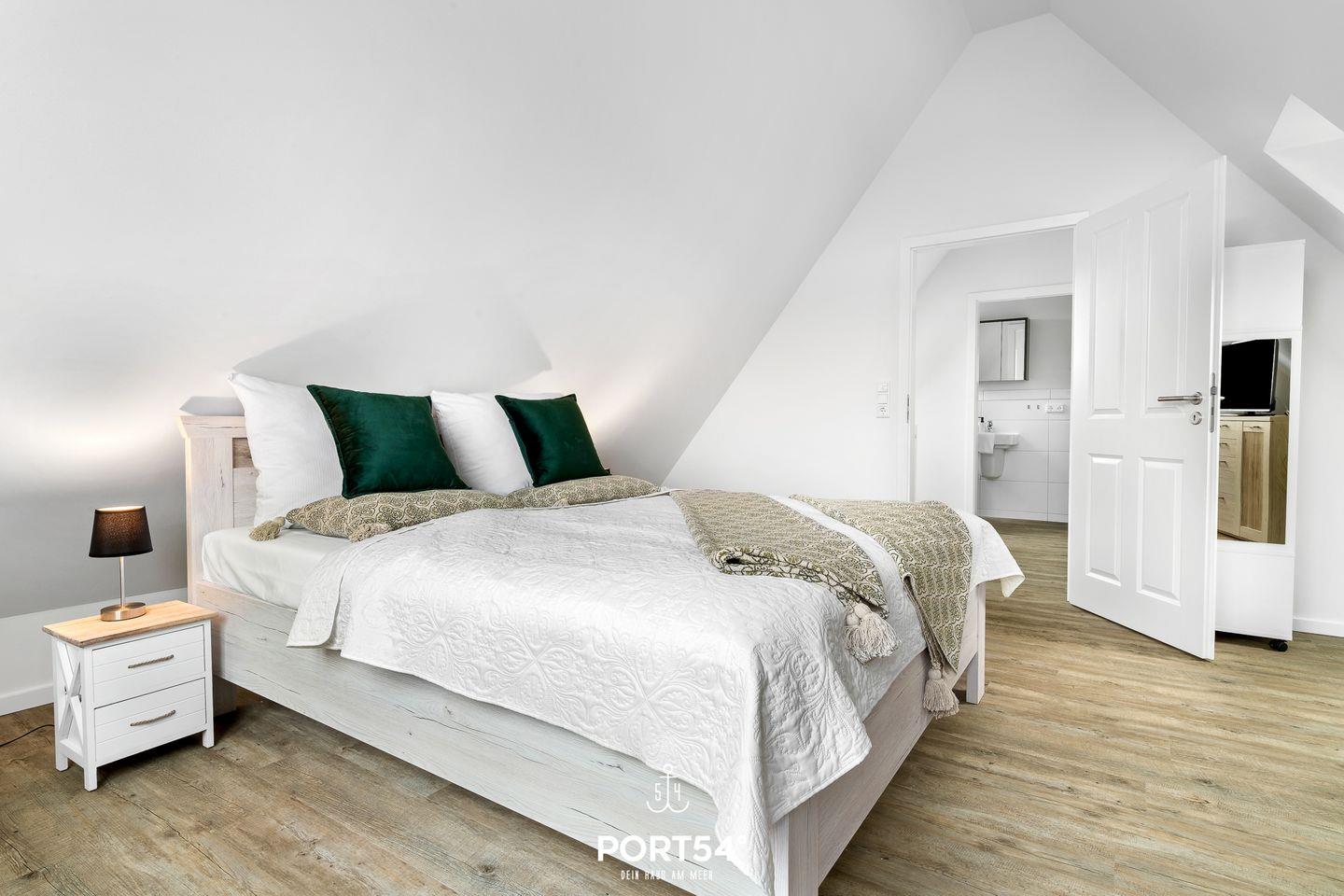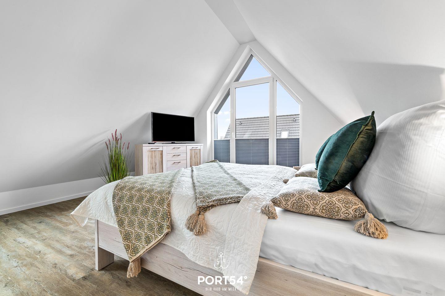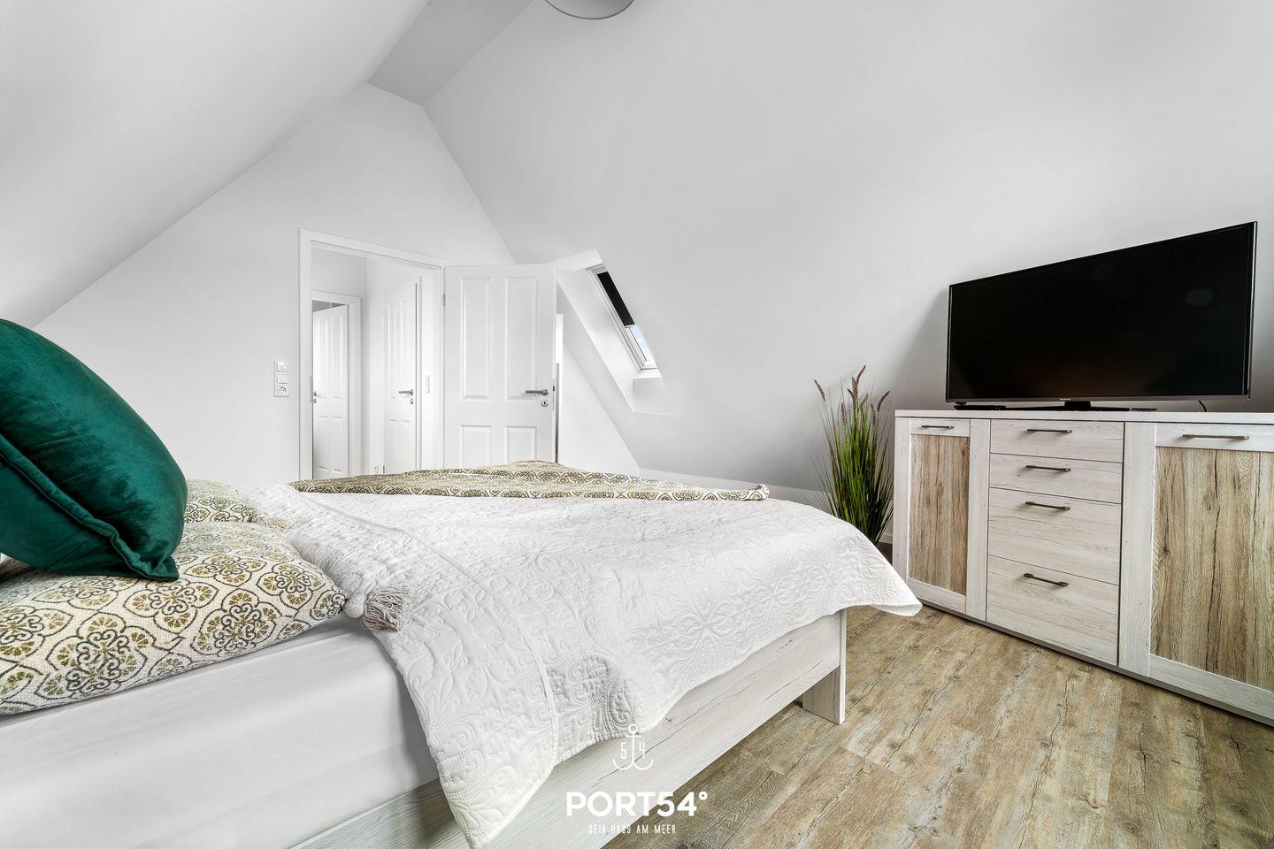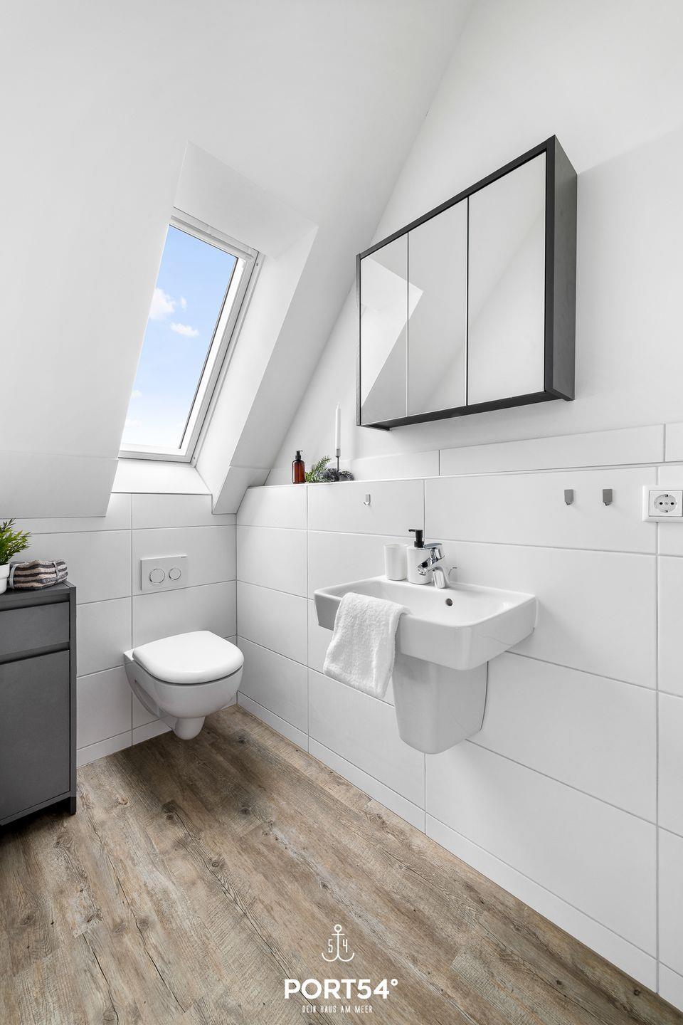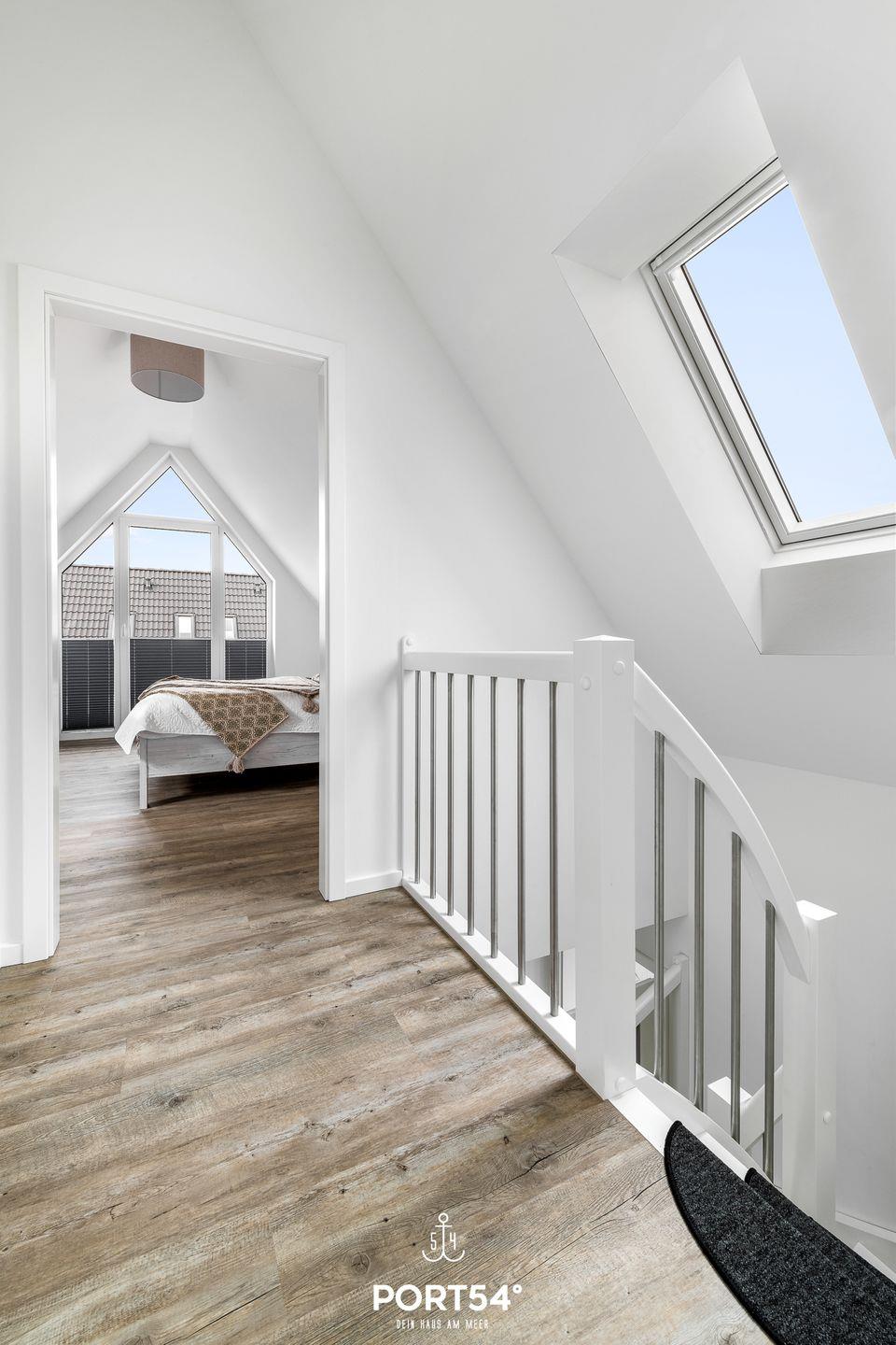 In gehobener und exklusiver Holzständerwerk-Bauweise erwartet Sie die im Dachgeschoss und Spitzboden gelegene Ferienwohnung "Küste 8" auf etwa 85m². Der lichtdurchflutete Wohnbereich ist mit einer gemütlichen Wohnlandschaft inklusive Schlaffunktion (250x160cm) und einem Flachbild-TV ausgestattet. Die angrenzende Küche ist offen gestaltet und bietet alle Annehmlichkeiten, die für einen geselligen Kochabend benötigt werden. Am Esstisch mit gemütlichen Stühlen können Sie bequem gemeinsam essen oder einen Spieleabend verbringen. Bodentiefe Fenster lassen viel Licht herein und ermöglichen den Zutritt zum vollmöblierten Balkon. In einem der beiden Schlafzimmer erwartet Sie ein großes Doppelbett (180x200cm), sowie verdunkelbare Fenster. Das andere Schlafzimmer befindet sich im ausgebauten Spitzboden und bietet ein Doppelbett (160x200cm) und einen weiteren Flachbild-TV fürs nächtliche Entertainment und Verdunkelungsmöglichkeiten für erholsame Nächte. Das Badezimmer ist mit einer ebenerdigen Dusche, einem WC sowie einem Waschbecken ausgestattet. Im Spitzboden befindet sich ein Gäste Bad mit WC und Waschbecken. Mitgebrachte Fahrräder können im Fahrradschuppen untergestellt werden.