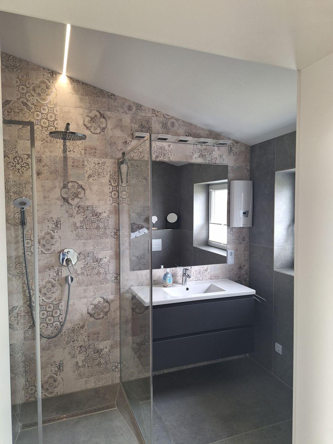 Ein weiteres Highlight ist das schicke Tageslichtbad mit bodengleicher Regendusche und Handtuchwärmer. Eine richtige kleine Wohlfühloase.