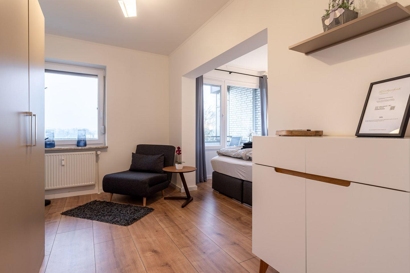 Das separate Schlafzimmer ist mit einem komfortablen Boxspringbett (160 x 200 cm) ausgestattet und bietet eine ruhige Oase für erholsame Nächte. Dieses Apartment eignet sich ideal für 2 Personen, kann jedoch auch mit bis zu 4 Personen belegt werden, da eine Schlafcouch (140 x 200 cm) im Wohnzimmer zur Verfügung steht.