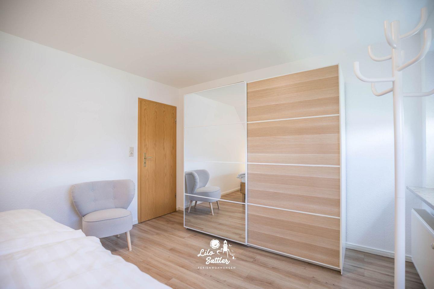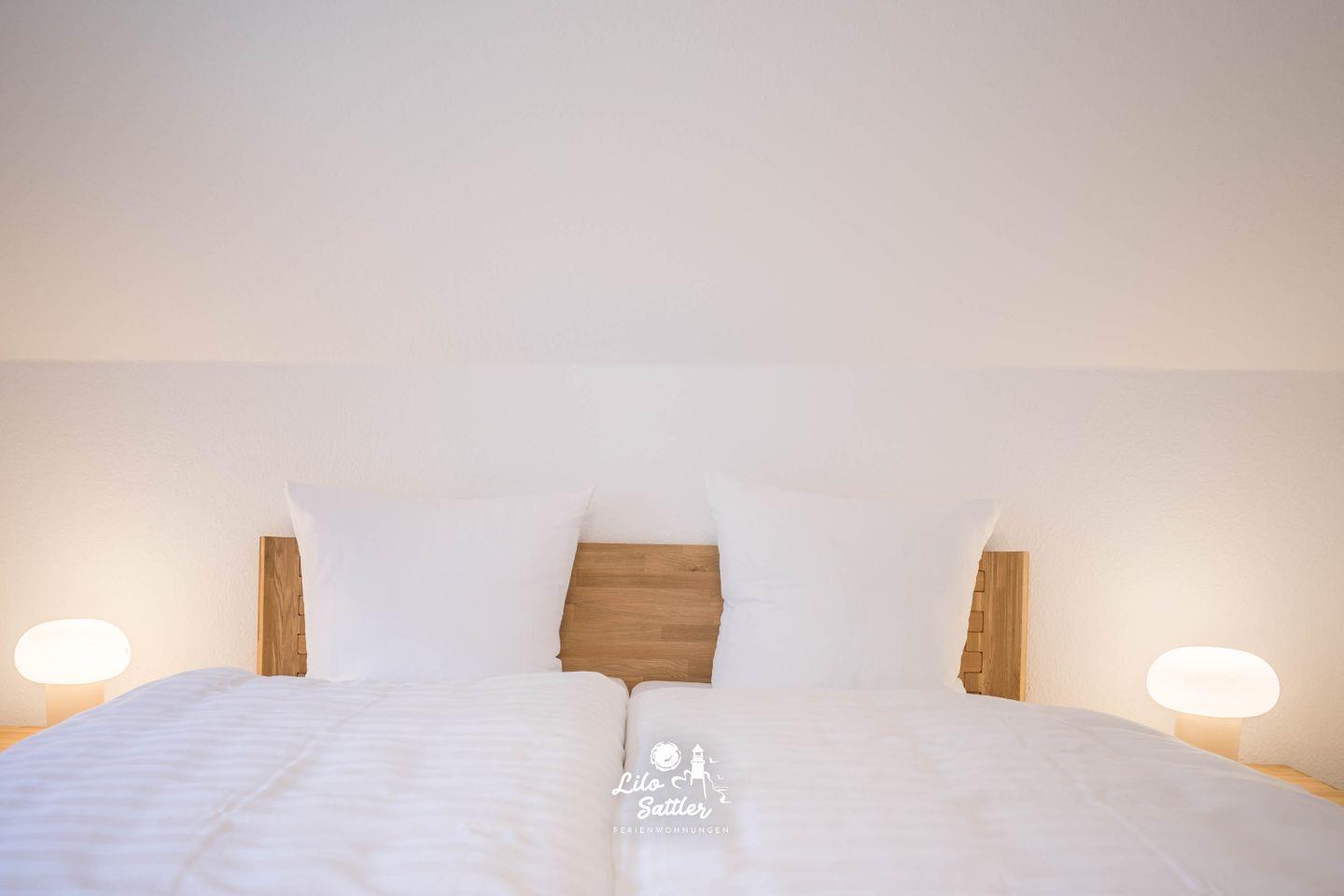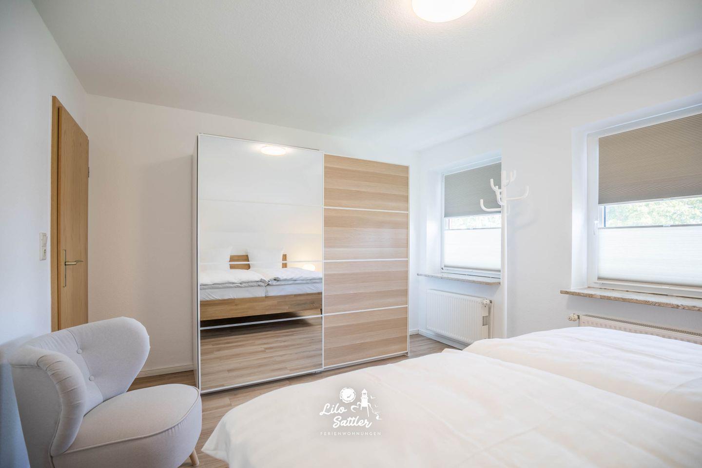 Erhöhtes Doppelbett (60cm) mit getrennten Matratzen (je 200cm x 90cm), Kleiderschrank 2-türig mit Schiebetüren und Ganzkörperspiegel, Sessel, Nachttisch und Nachtleuchten, Fenster mit Plissee, Verdunkelungsrollos und Fliegengitter