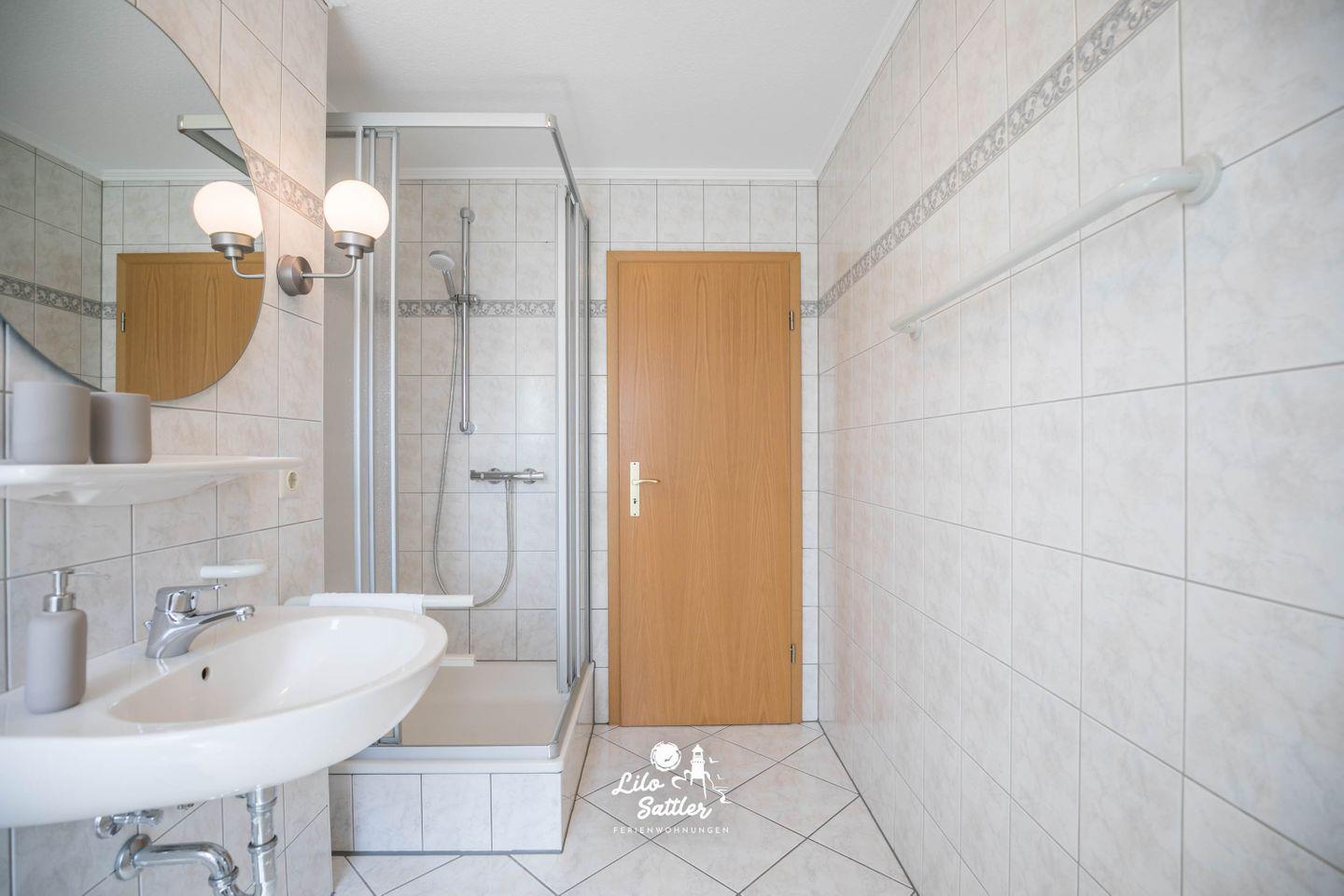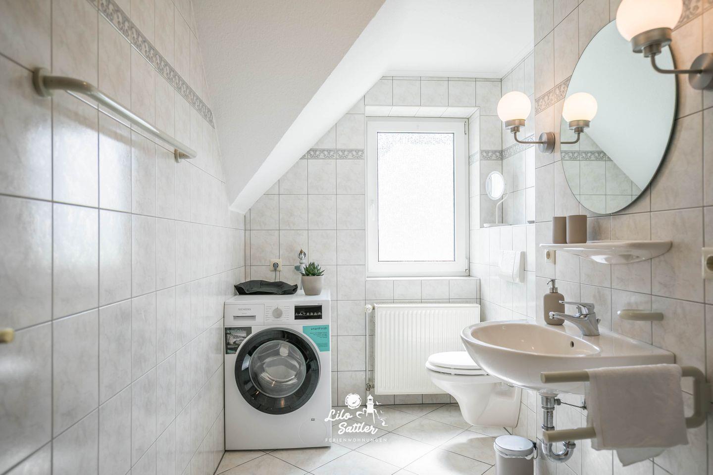 Dusche, Waschbecken, WC, Spiegel, Kosmetikspiegel, Waschmaschine, Föhn, Fenster mit Fliegengitter