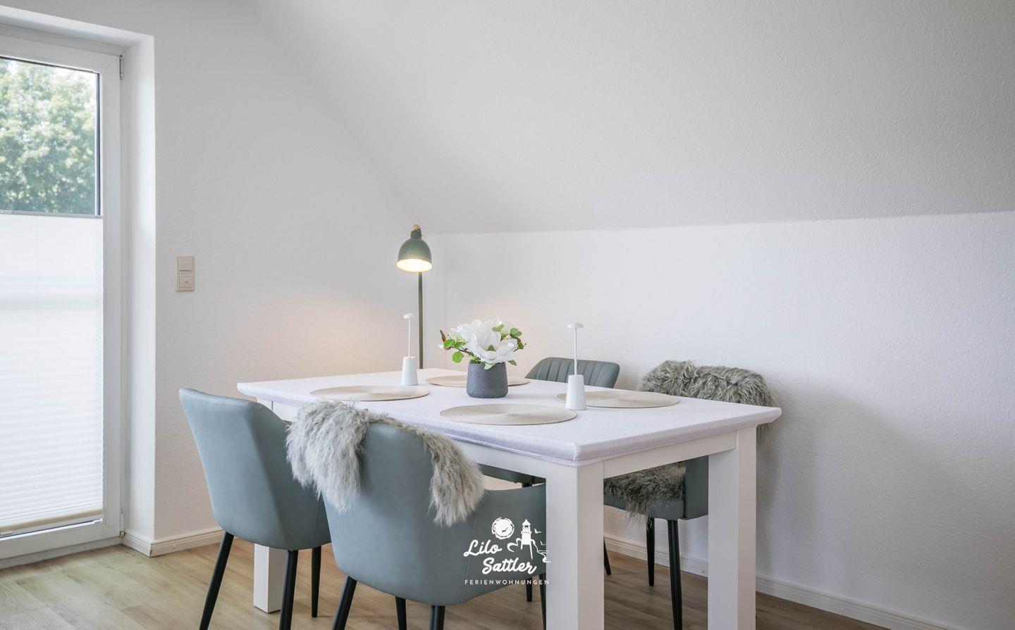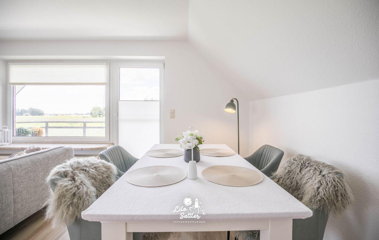 Der offene Wohn-Essbereich ist perfekt für gemeinsame Mahlzeiten und zum entspannen. Der Balkon in westlicher Lage bietet einen tollen Ausblick über die satten Felder Richtung Büsum und ermöglicht es, die Sonne am Abend zu genießen.