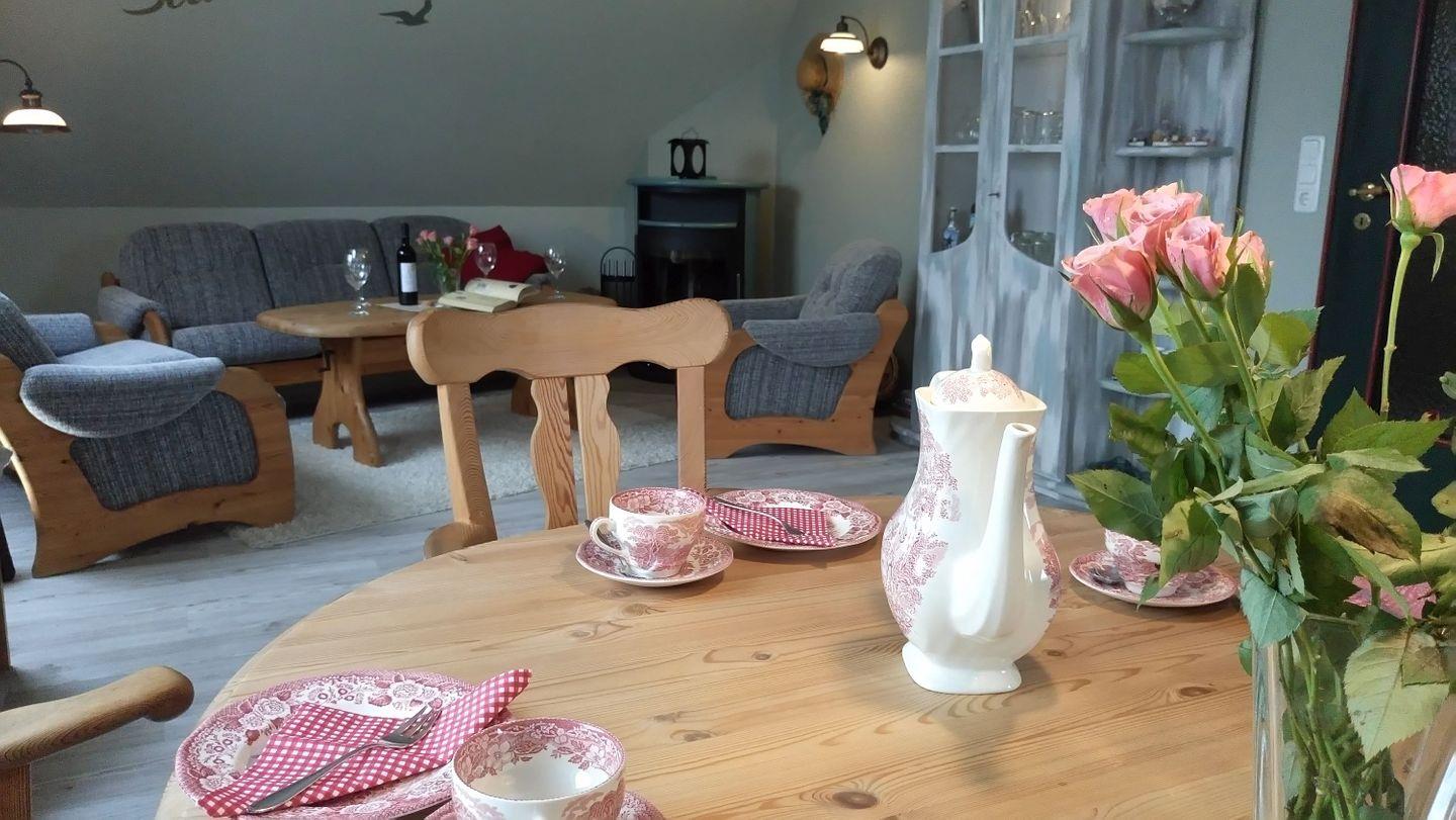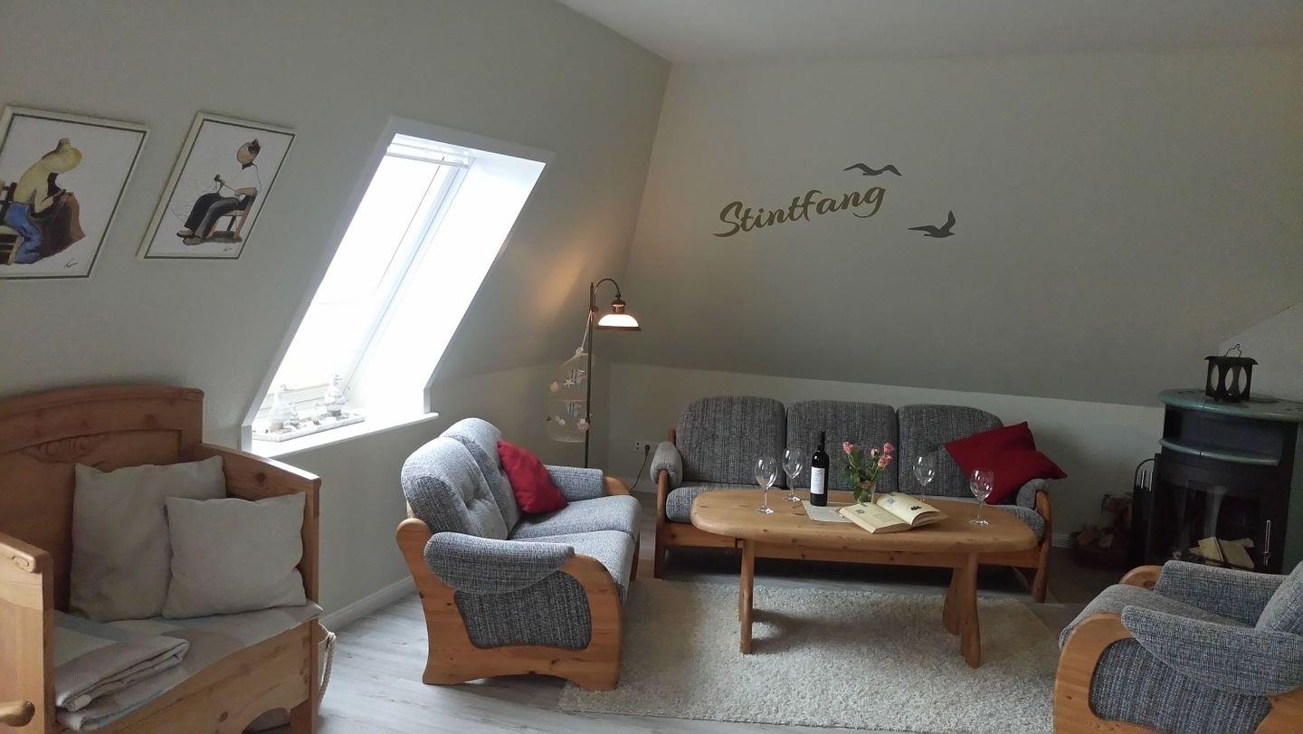 Im gemütlichen Wohnzimmer kann man den Abend, nach einem Strandtag ausklingen lassen, Zeit zum Lesen, für gute Gespräche oder ein Glas Wein am Kamin.