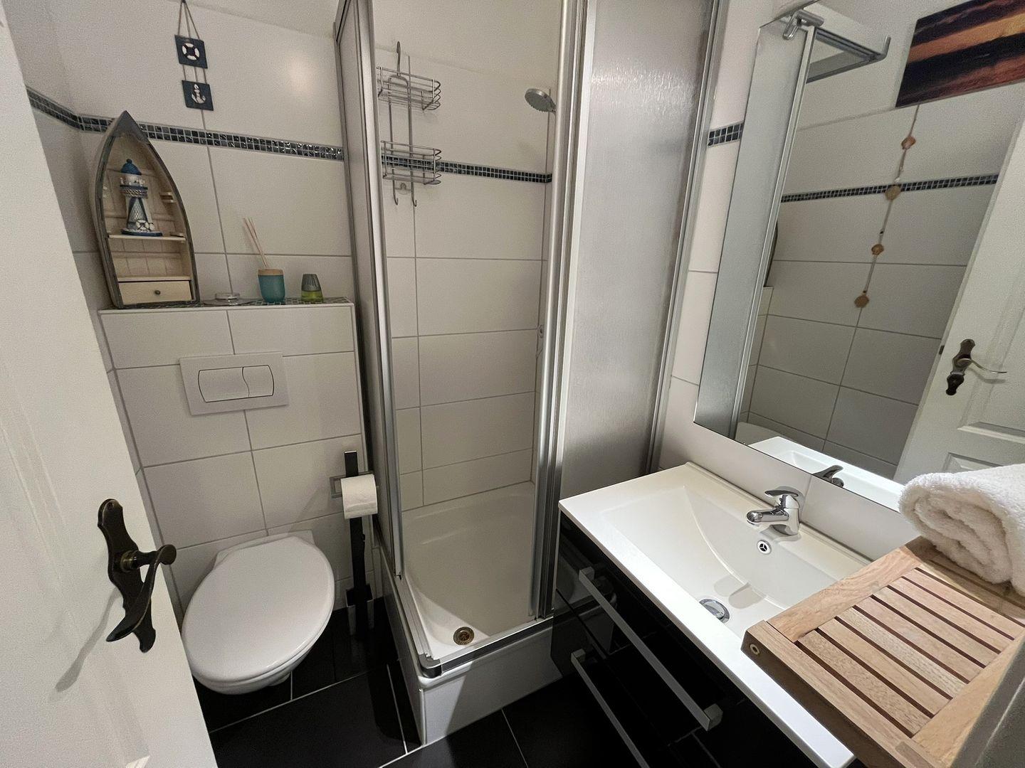 Ein kleines Badezimmer mit Dusche rundet diese Wohnung ab.