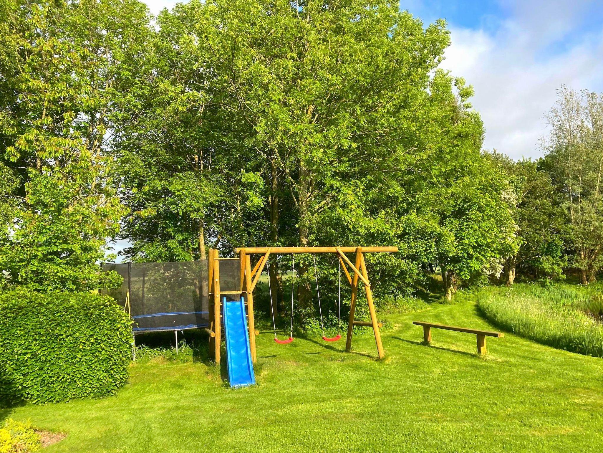 Im großen Garten mit Sitzecke und Strandkorb finden Sie Ruhe und Erholung. Für die Kinder haben wir ein Klettergerüst mit Schaukeln und Rutsche, einen Basketballkorb und sie können Ponyreiten.