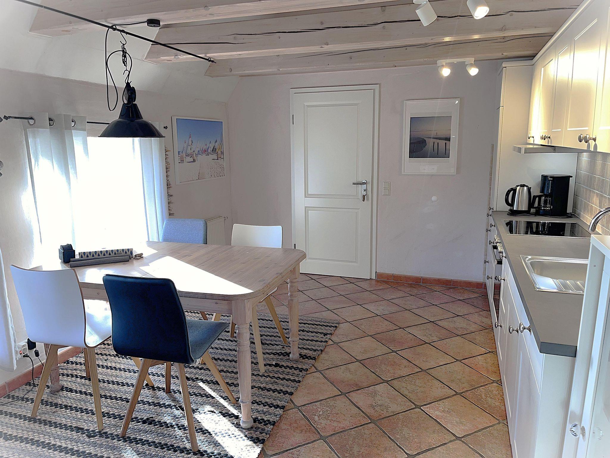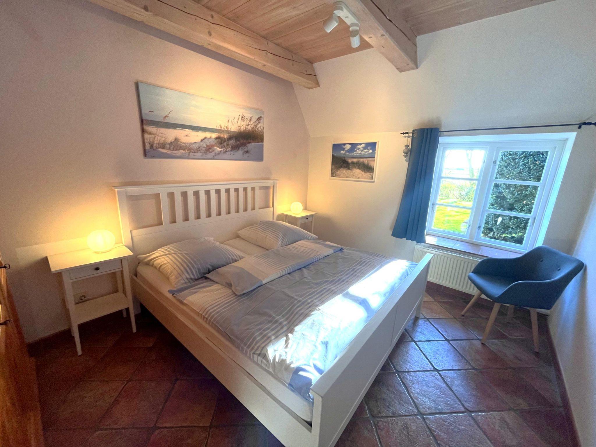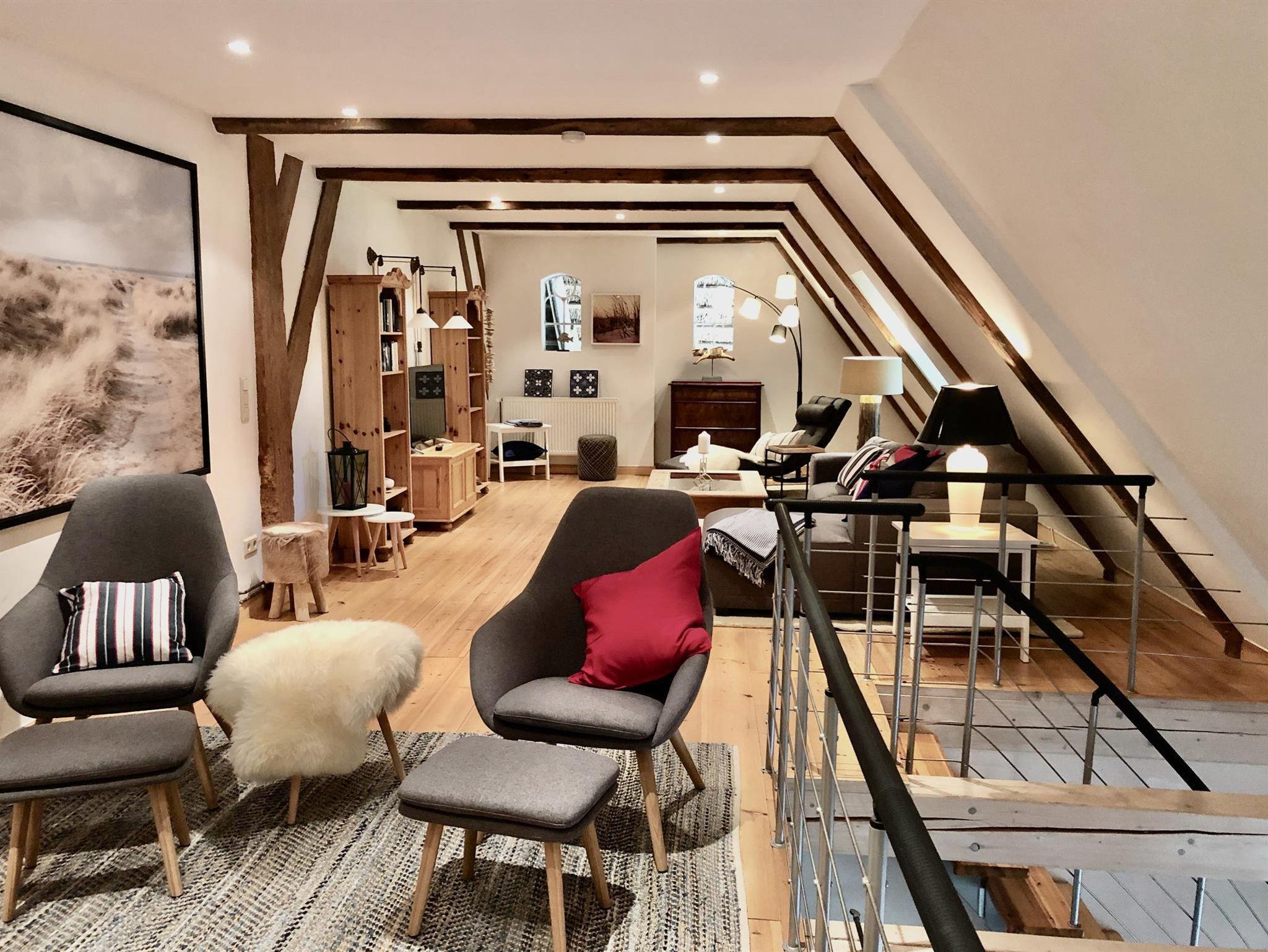 Der Wohnbereich im Obergeschoss bietet einen tollen Kaminofen, ist großzügig aufgeteilt und modern-behaglich ausgestattet. Im Erdgeschoss finden Sie einen schönen Essplatz für bis zu vier Personen in der lichtdurchfluteten Wohnküche. Die beiden Schlafzimmer sind komfortabel und maritim eingerichtet und haben jeweils ein eigenes Badezimmer. Auf unserem Anwesen können Sie sich im riesigen Garten erholen und die Ruhe zur Entspannung geniessen - die eigene Sonnenterasse samt Strandkorb, Brise und Weitblick sind inklusive.