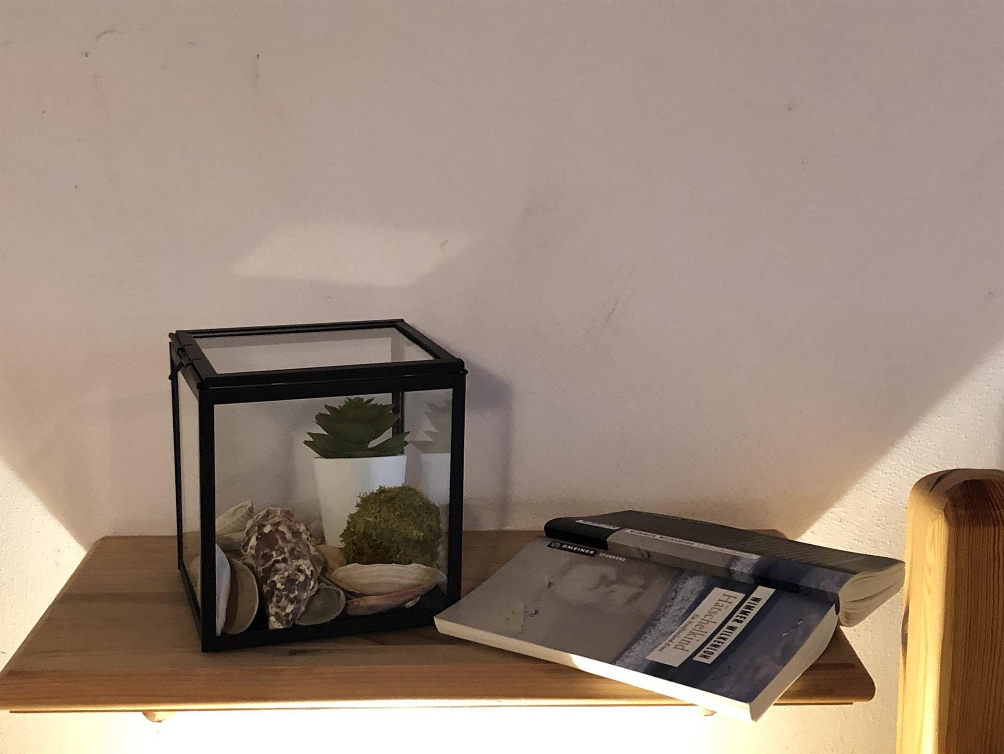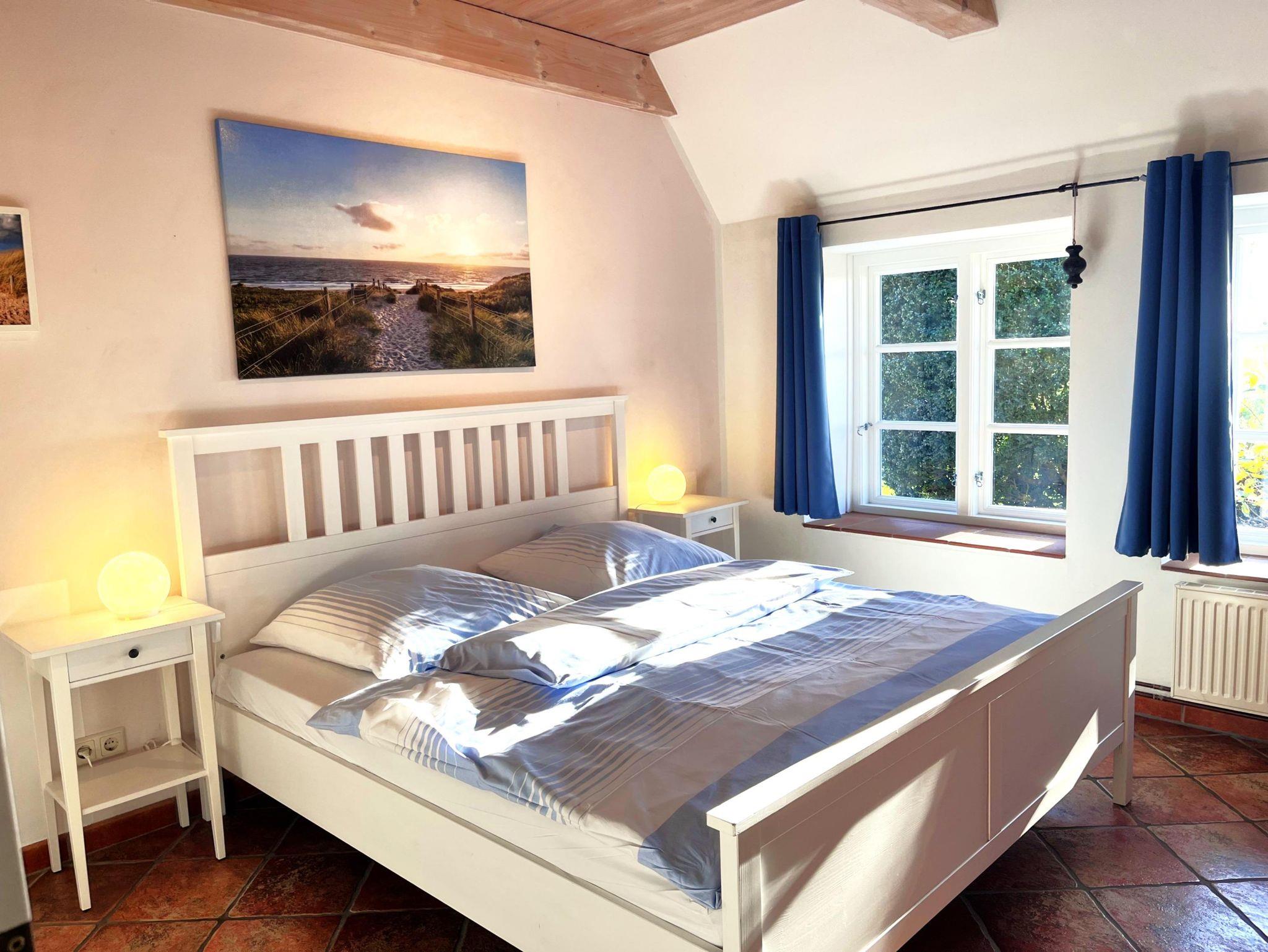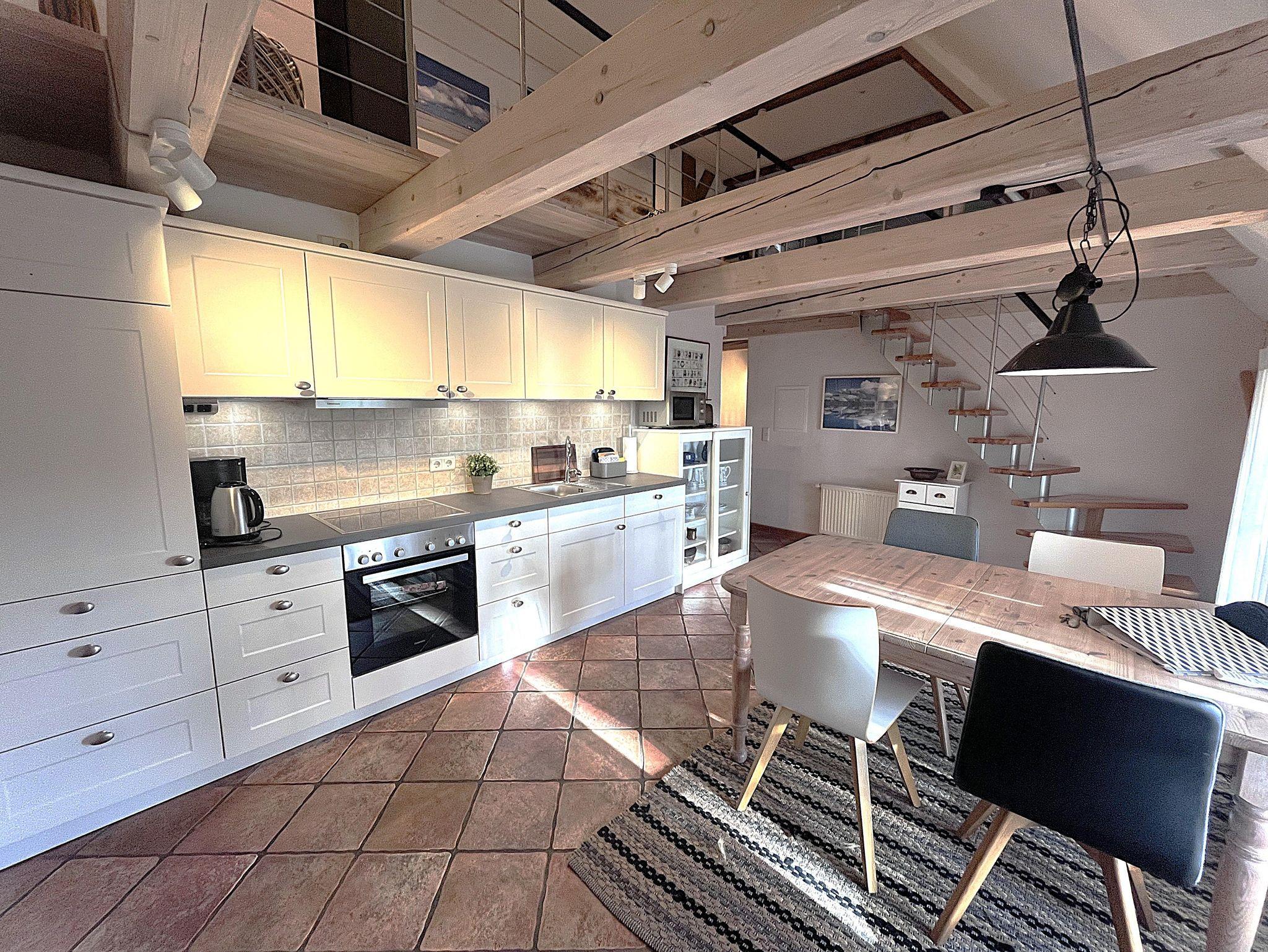 Der Wohnbereich im Obergeschoss bietet einen tollen Kaminofen, ist großzügig aufgeteilt und modern-behaglich ausgestattet. Im Erdgeschoss finden Sie einen schönen Essplatz für bis zu vier Personen in der lichtdurchfluteten Wohnküche. Die beiden Schlafzimmer sind komfortabel und maritim eingerichtet und haben jeweils ein eigenes Badezimmer. Auf unserem Anwesen können Sie sich im riesigen Garten erholen und die Ruhe zur Entspannung geniessen - die eigene Sonnenterasse samt Strandkorb, Brise und Weitblick sind inklusive.