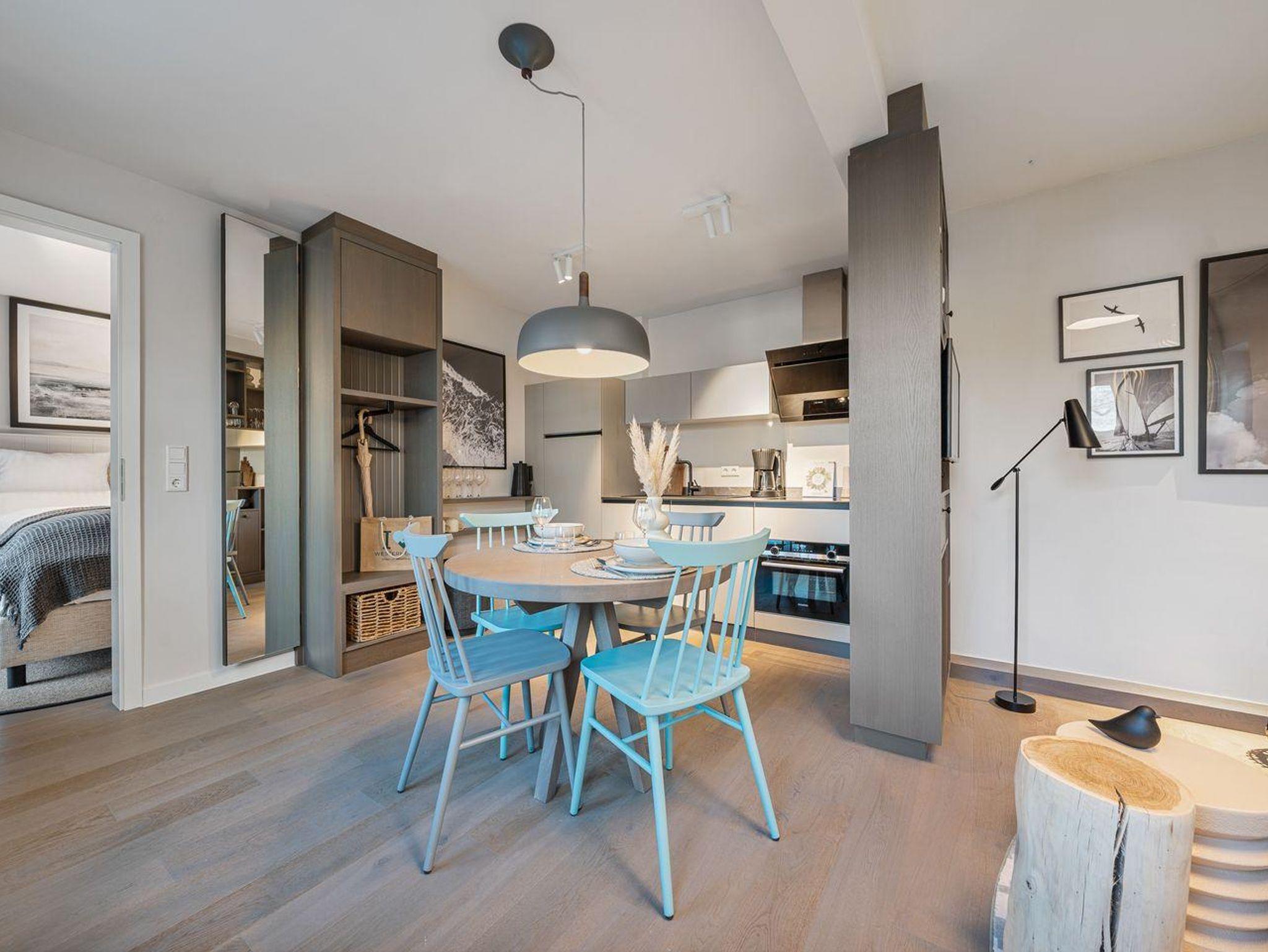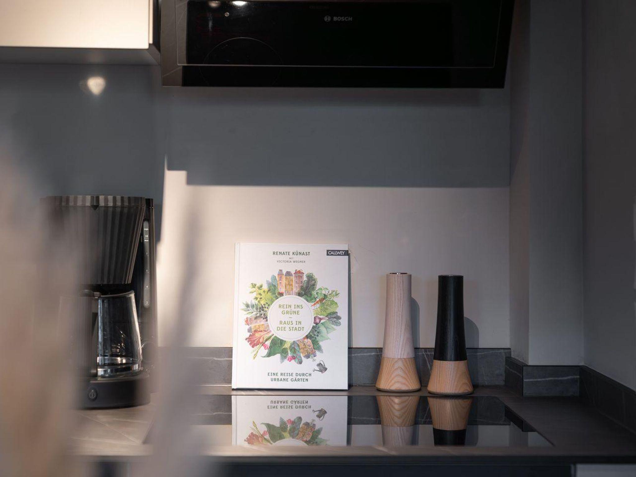 Die offene und exklusive Küche ist komplett ausgestattet und ideal für alle, die gerne selbst kochen. Hier finden Sie alle notwendigen Küchenutensilien sowie Hochwertige E-Geräte wie einen Induktionsherd, einen Backofen, eine Spülmaschine, eine Kaffeemaschine um Ihren Morgen mit einer Tasse frisch gebrühten Kaffee zu beginnen. Der eingerichtet Wohnbereich ist hell und exklusiv gestaltet und verbindet sich harmonisch mit der Küche. Gemütliche Abende können Sie beim Fernsehen verbringen; die Ferienwohnung ist mit zwei TV-Geräten ausgestattet, sodass Sie Ihre Lieblingssendungen in beiden Bereichen genießen können.
