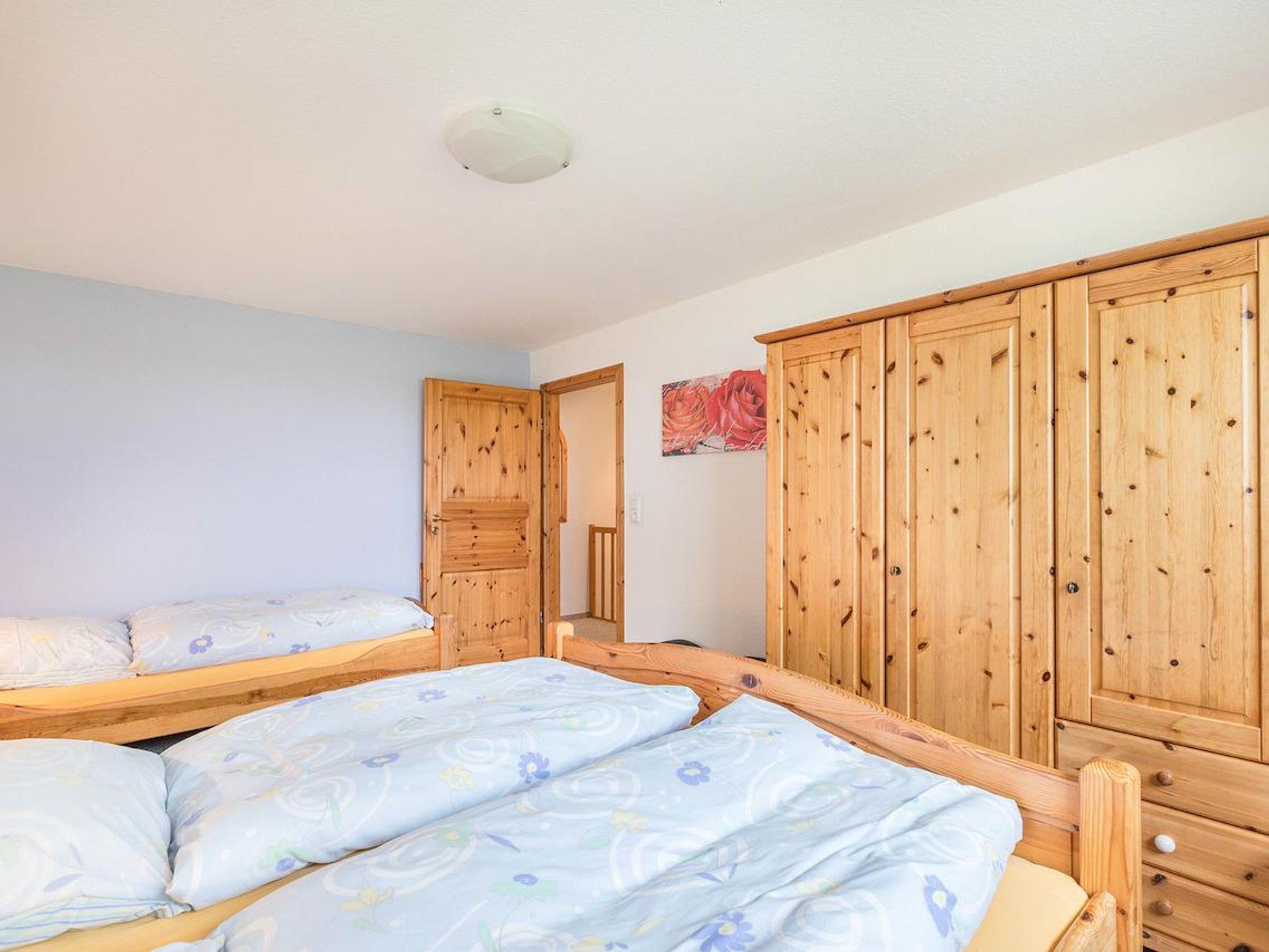 Im Obergeschoss befindet sich ein Schlafzimmer mit einem Doppelbett und einem Einzelbett. Das grosszügige Badezimmer mit Dusche und WC hat ein Aussenfenster.