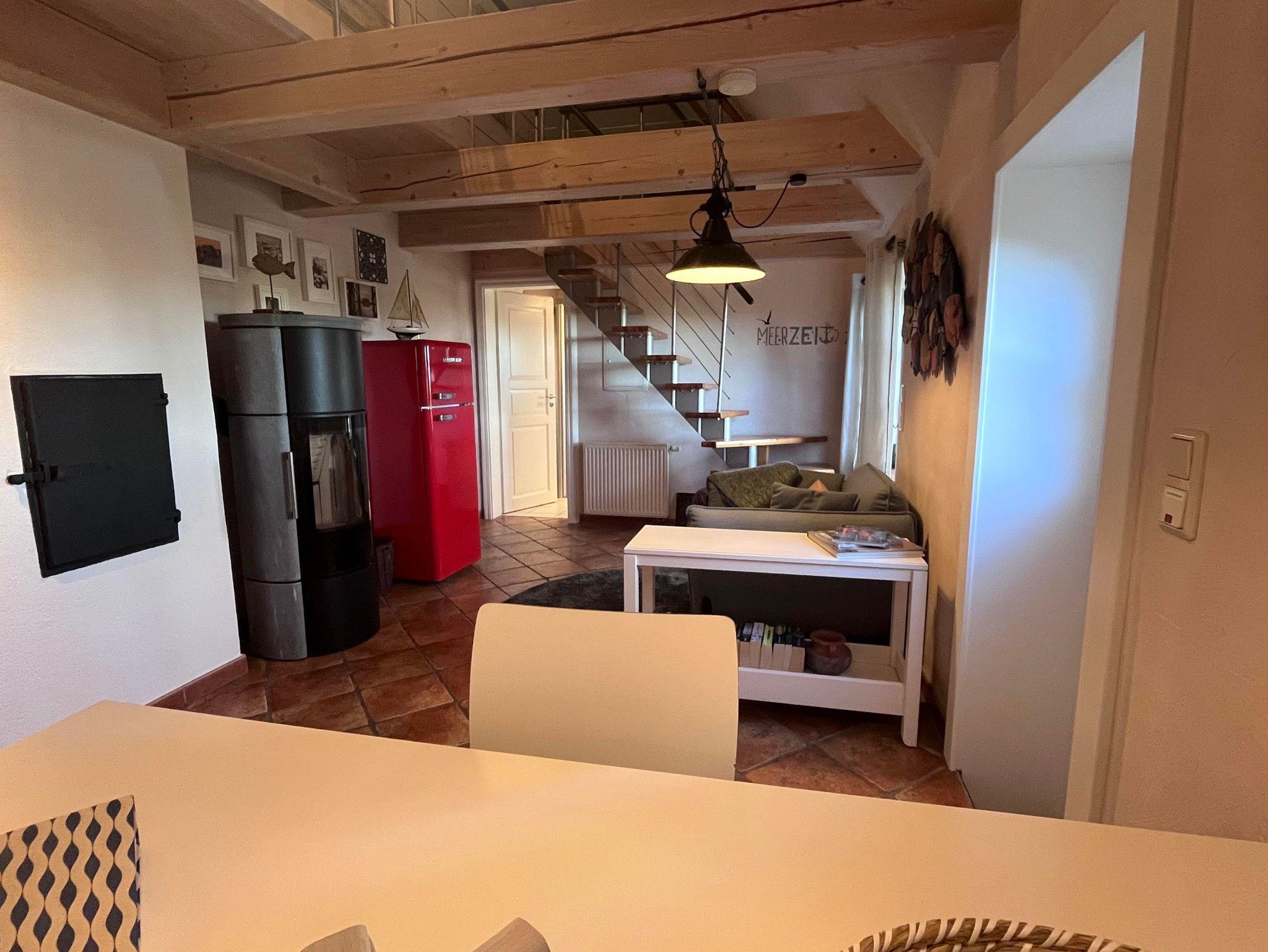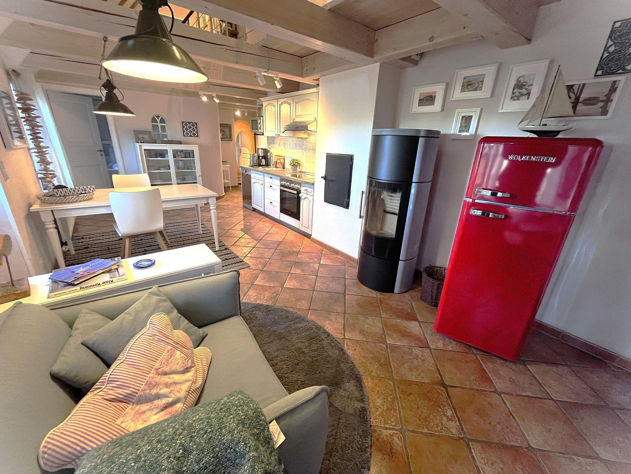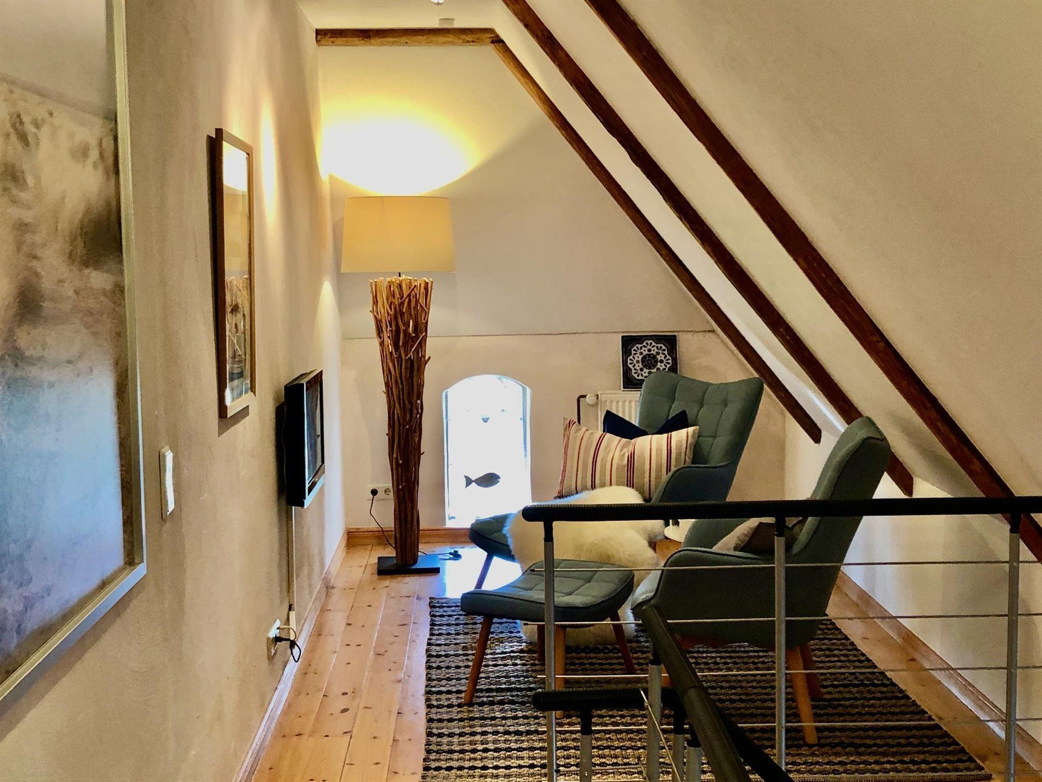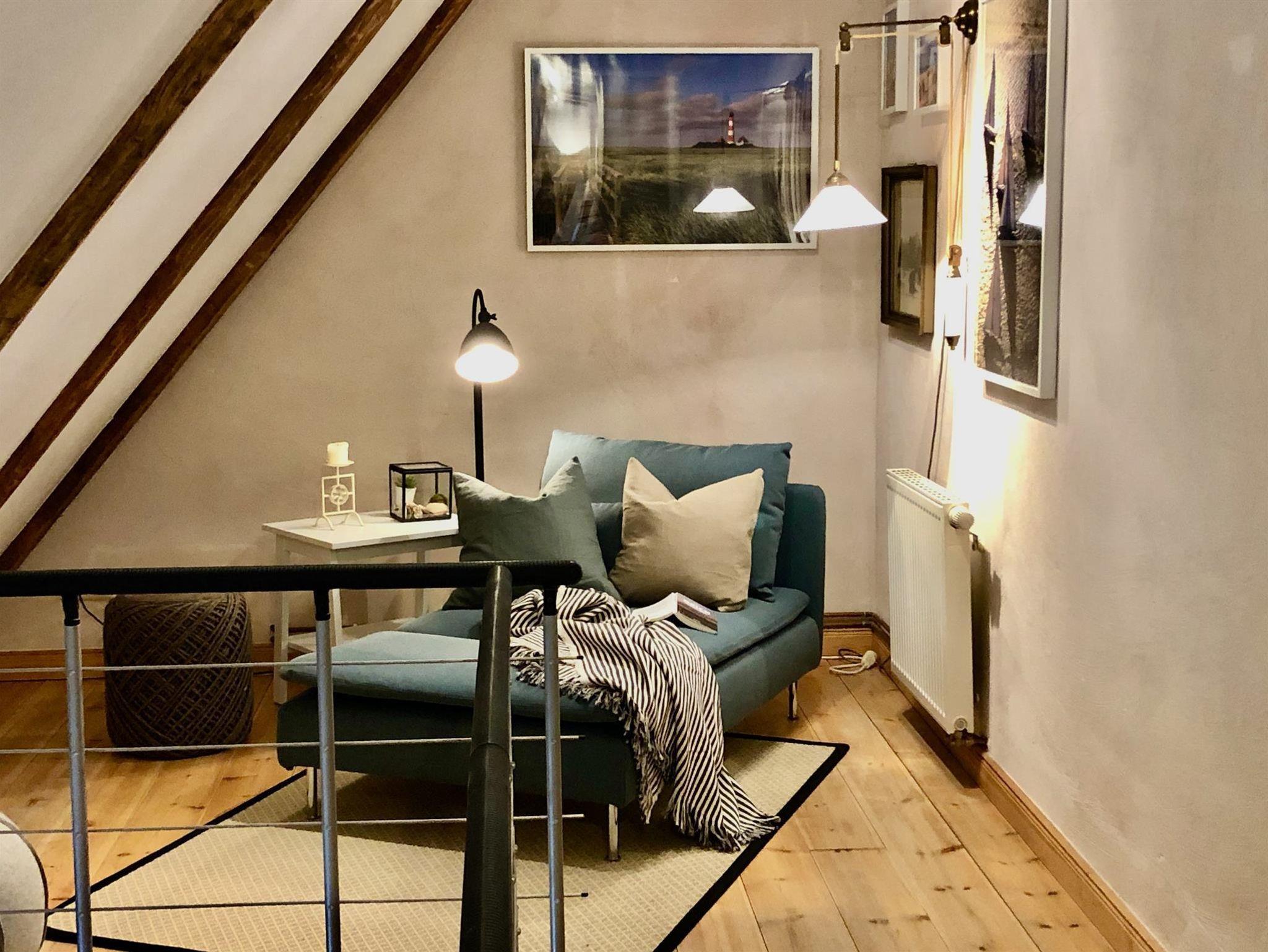 Der 25 m² große Wohn-/Essbereich im Erdgeschoss ist großzügig, modern und behaglich mit einer komplett ausgestatteten Wohnküche, einem schönen Essplatz für zwei Personen und dem lichtdurchfluteten Wohnzimmer konzipiert.. Genießen Sie vom Esstisch durch die Fenster oder die typische Klöntür den Blick in den Garten, über Felder und Wiesen bis zum Deich. Das 10qm grosse Bad ist als Wellnessbereich ausgelegt, bietet viel Platz und eine bodengleiche, große Dusche. Das Schlafzimmer mit grossem Bett und Kleiderschrank runden das Erdgeschoss ab. Im Obergeschoss erwartet Sie in unserer offenen Galerie am einen Ende ein separater Wohn-/TV-Bereich mit gemütlichen, hochwertigen Sesseln im skandinvisch-friesischen Stil. Zusätzlich finden Sie im Ruhe-/ Bibliotheksbereich eine schöne Recamiere zum erholen und auspannen...