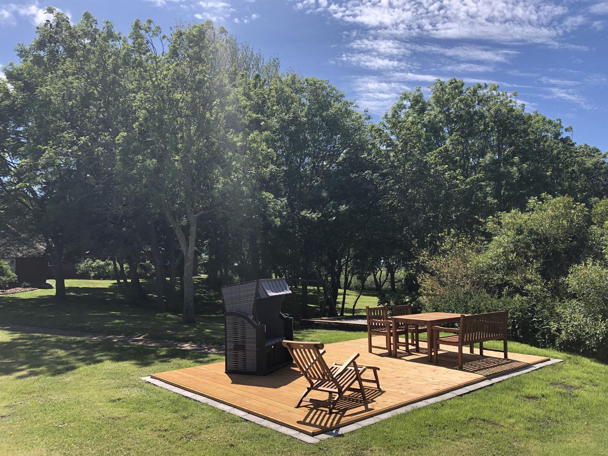Im Garten steht Ihnen Ihre eigene, private Sonnenterasse samt Strandkorb und Gartenmöbeln zur Verfügung. Neben viel Platz für Kinder und Hunde gibt er einen riesigen Sandkasten, Schaukeln, sowie einen Grillplatz - perfekt für einen schönen lauen Abend im Freien. Ab Sommer 2020 werden wir mit unserem Badefass/ Whirlpool noch mehr tolle Erlebnisse für Sie bereithalten. Mit unserer hauseigenen Sauna (ab Winter 2020) können Sie auch in der kalten Jahreszeit optimal ausspannen und sich nach einem anstrengenden Tag am Strand oder vom Wandern erholen. Die großzügigen Parkplätze zur exklusiven Nutzung direkt auf dem Grundstück vor der Tür runden das Bild ab. In der 120qm großen Loo-Diele können Fahrräder, etc. sicher abgestellt und E-Bikes geladen werden.