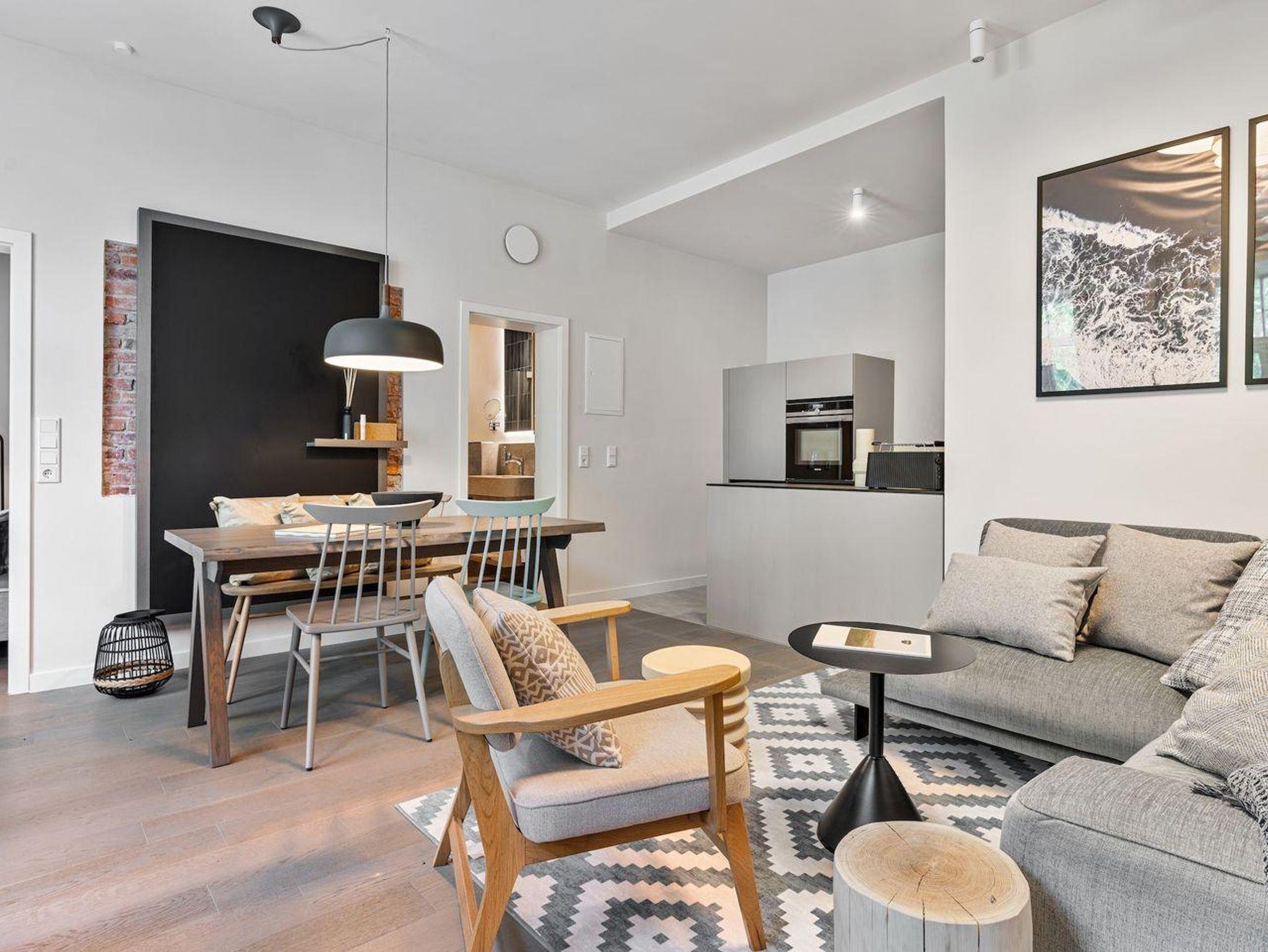 In der offenen Küche können Hobbyköche ihr Talent entfalten. Ausgestattet mit einem modernen Induktionsherd, Backofen, Geschirrspüler, Kühlschrank und Gefrierfach finden Sie hier alles, um köstliche Speisen zuzubereiten und das gemeinsame Essen zu zelebrieren. Der großzügige Wohnbereich mit Fernseher lädt zum Entspannen, Filmabende oder gemeinsamen Beisammensein ein.