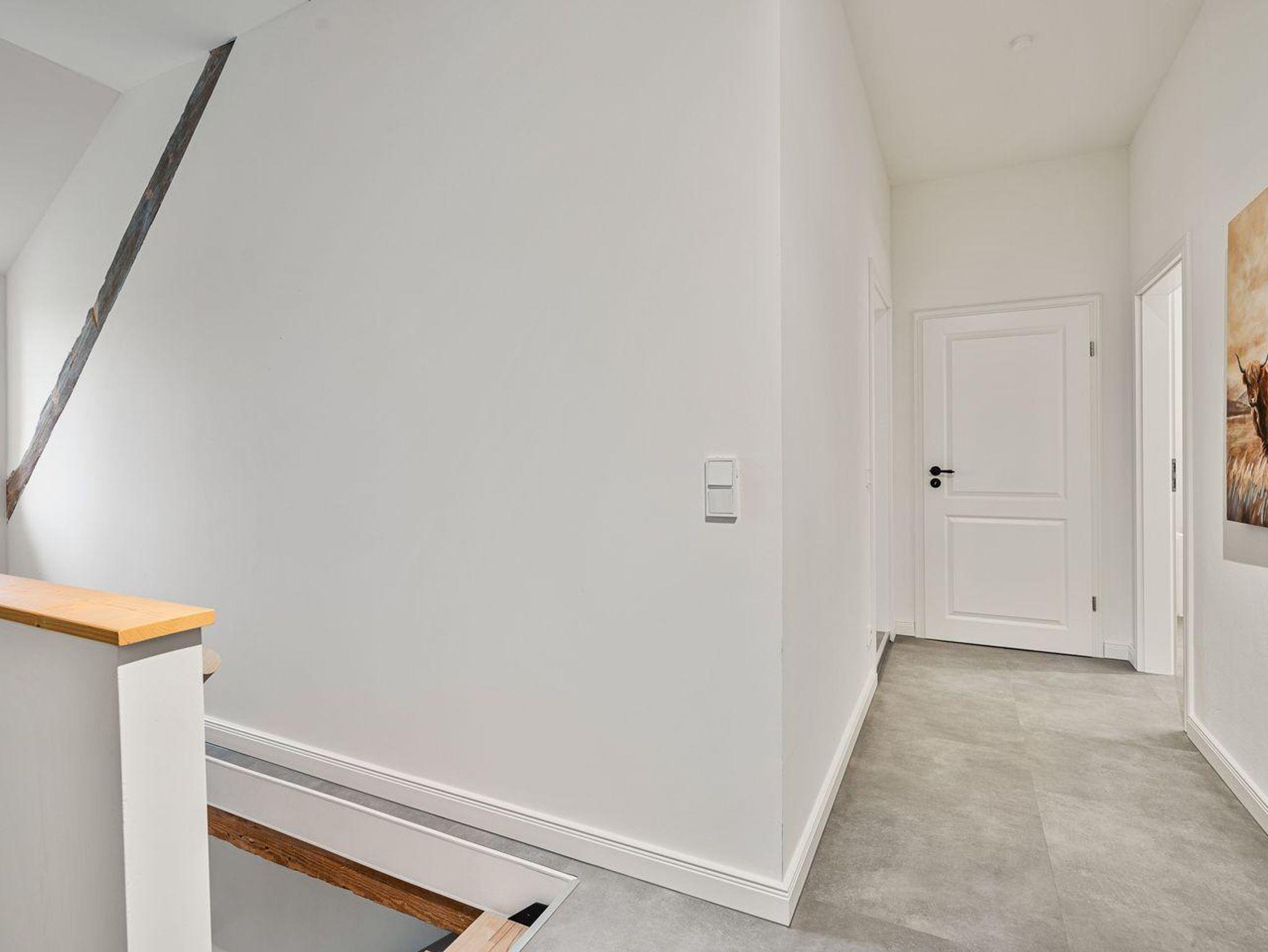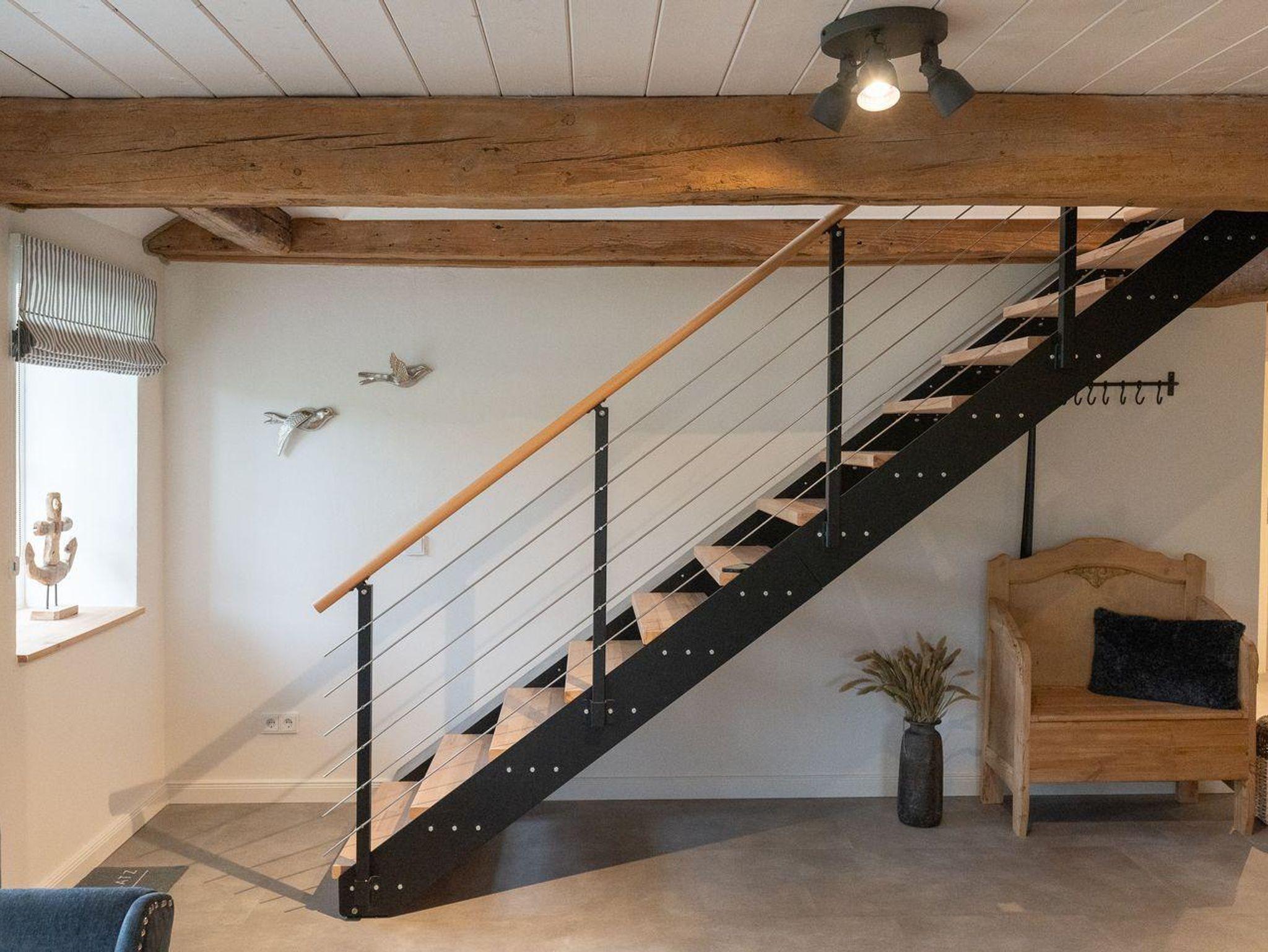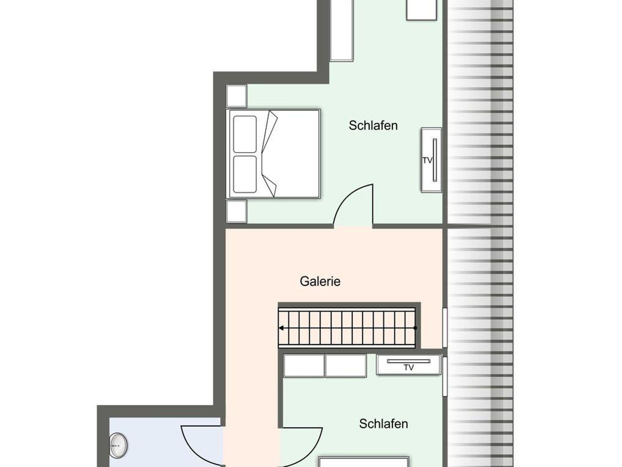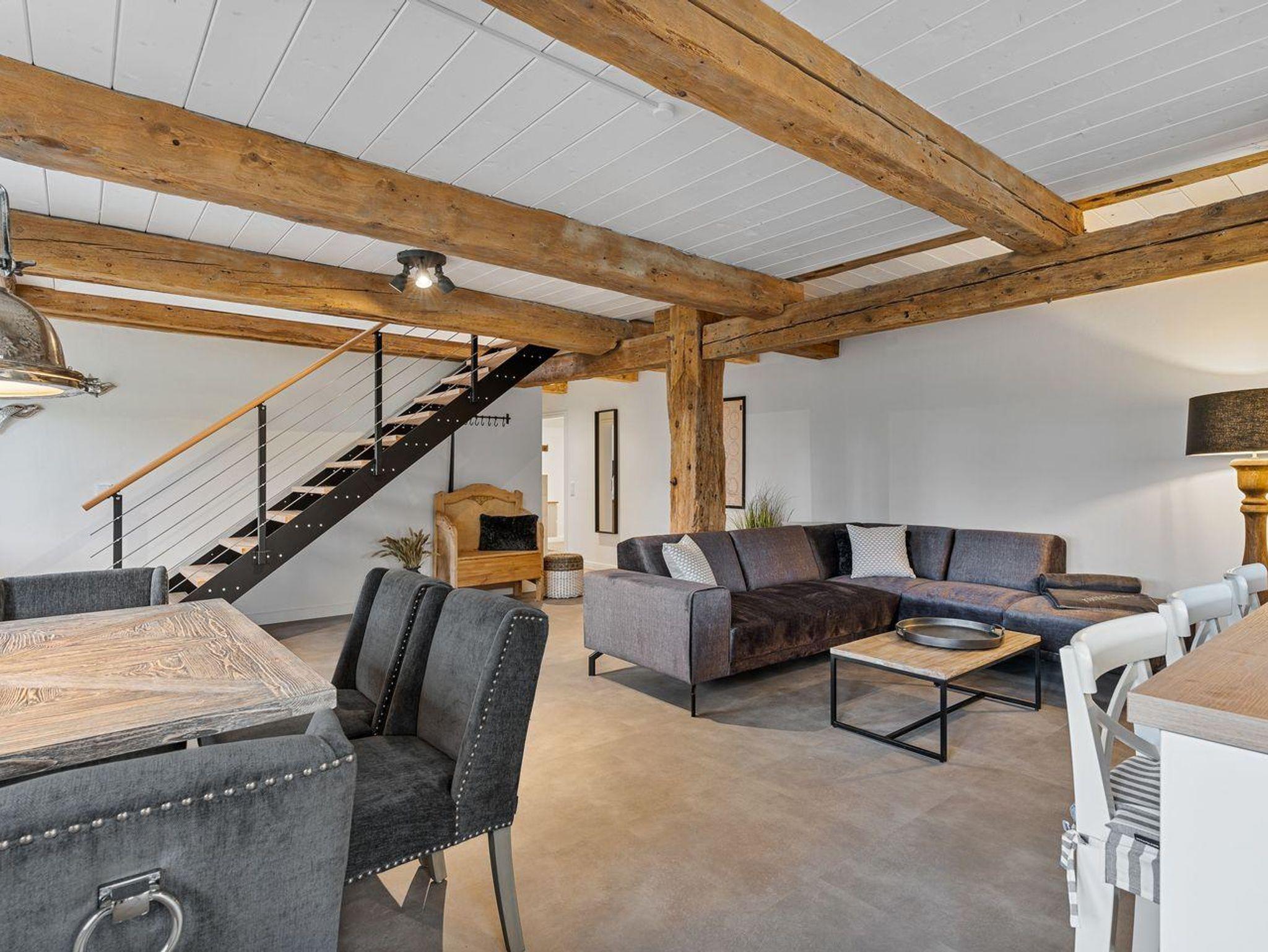 Vom Wohnbereich gelangen Sie über eine Lofttreppe ins Obergeschoss. Hier befinden sich zwei weitere Schlafzimmer, jeweils mit einem Boxspringbett (1,8 x 2,0 m) und je einem TV, sowie ein separates Duschbad mit zusätzlichem WC.