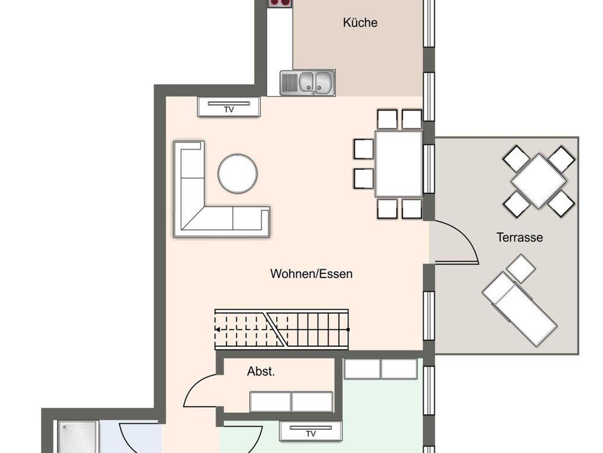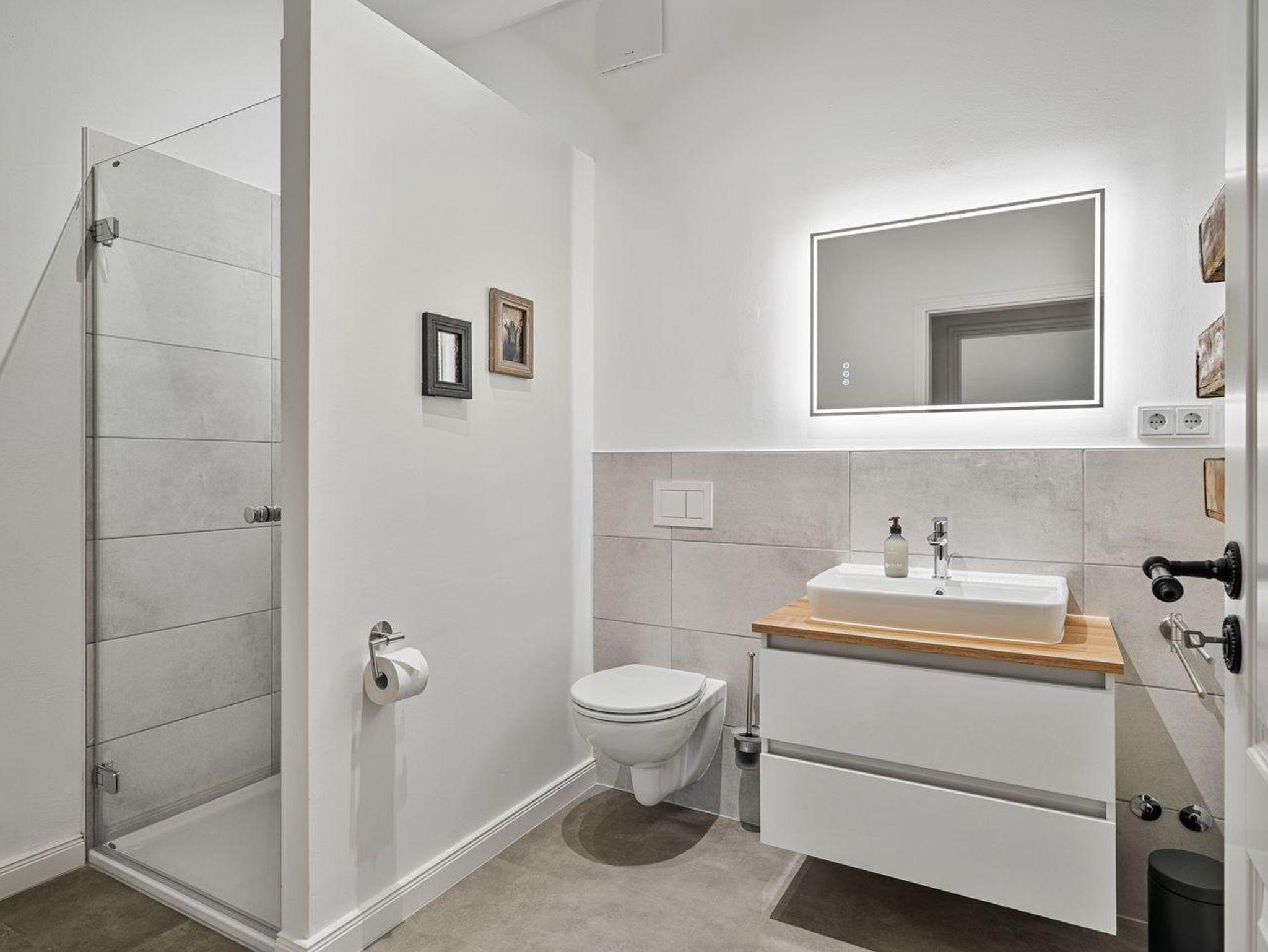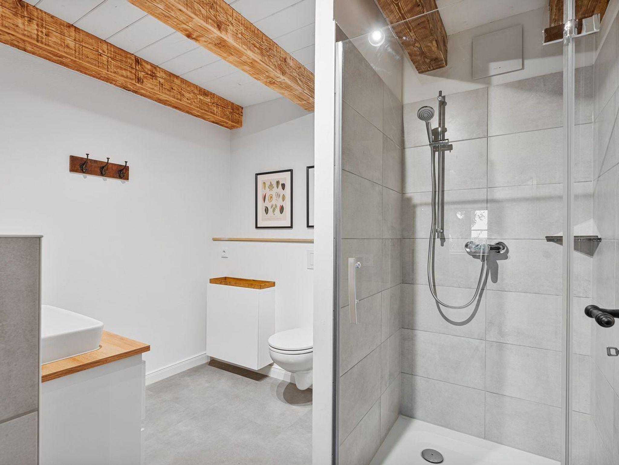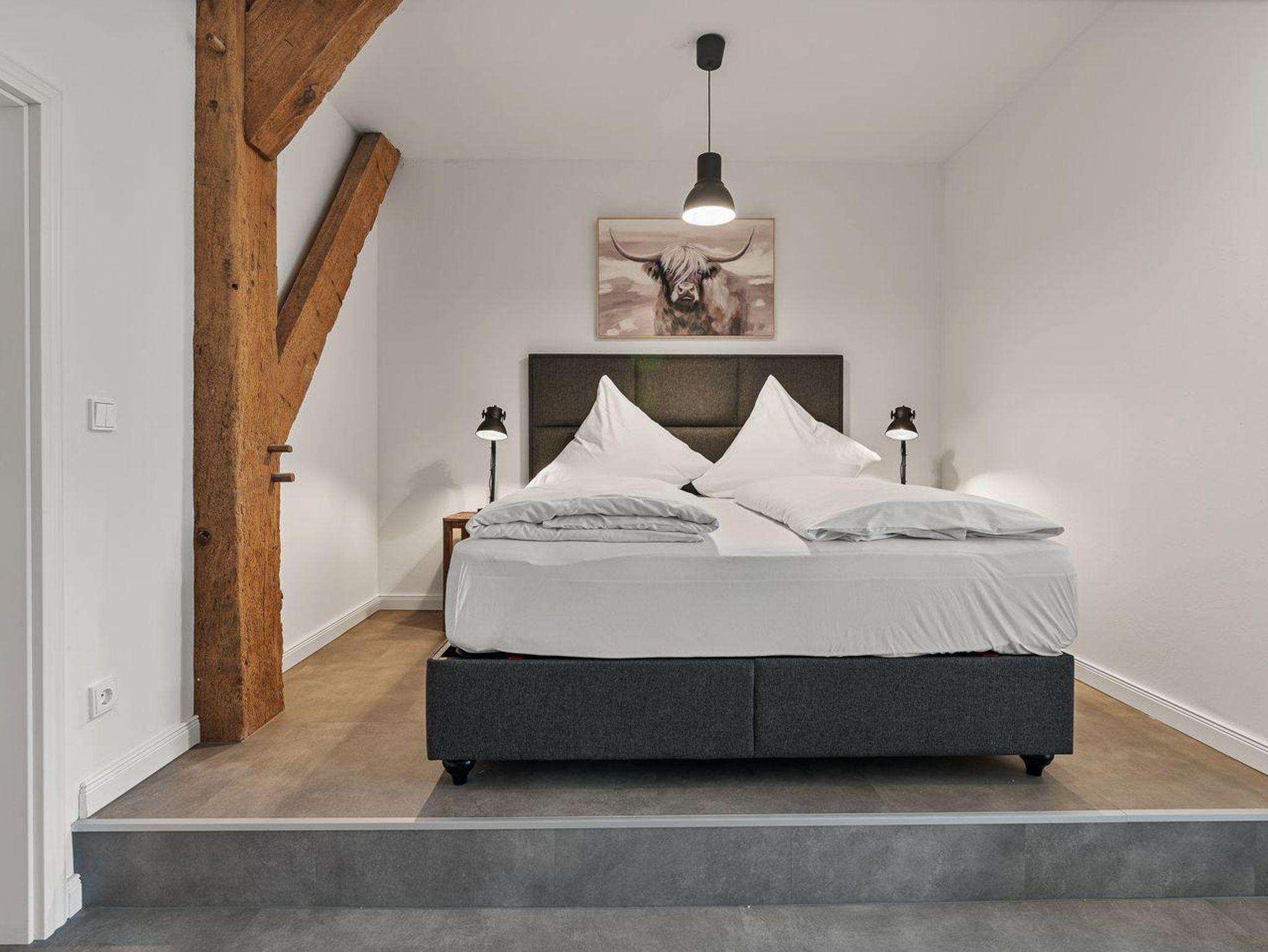 Vom Wohnbereich gelangen Sie über eine Lofttreppe ins Obergeschoss. Hier befinden sich zwei weitere Schlafzimmer, jeweils mit einem Boxspringbett (1,8 x 2,0 m) und je einem TV, sowie ein separates Duschbad mit zusätzlichem WC.