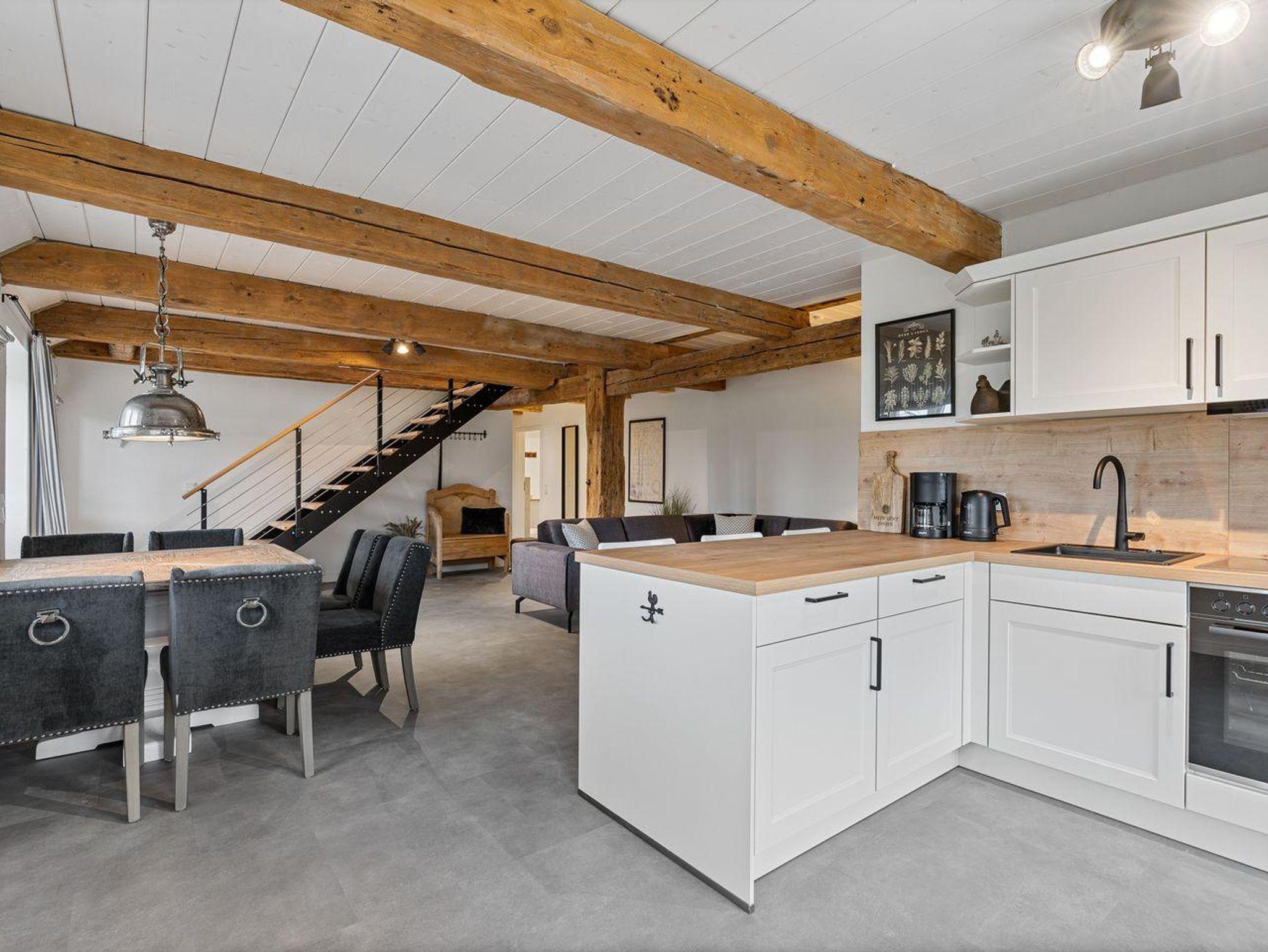 Die Ferienwohnung erstreckt sich über 2 Etagen und befindet sich im Erdgeschoss. Sie verfügt über ca. 135 m² Wohnfläche und ist wie folgt aufgeteilt: In der ersten Etage erwartet Sie ein geräumiger Wohnraum mit TV und einer wunderschönen Couchlandschaft, offener Küche mit Theke und gemütlichem Essbereich. Die Küche ist voll ausgestattet. Ein separates Duschbad bietet allen Komfort. Zudem befindet sich im Erdgeschoss ein Schlafraum mit einem Boxspringbett (1,8 x 2,0 m) und einem TV sowie eine Möglichkeit für Workcation mit einem historischen Schreibtisch.