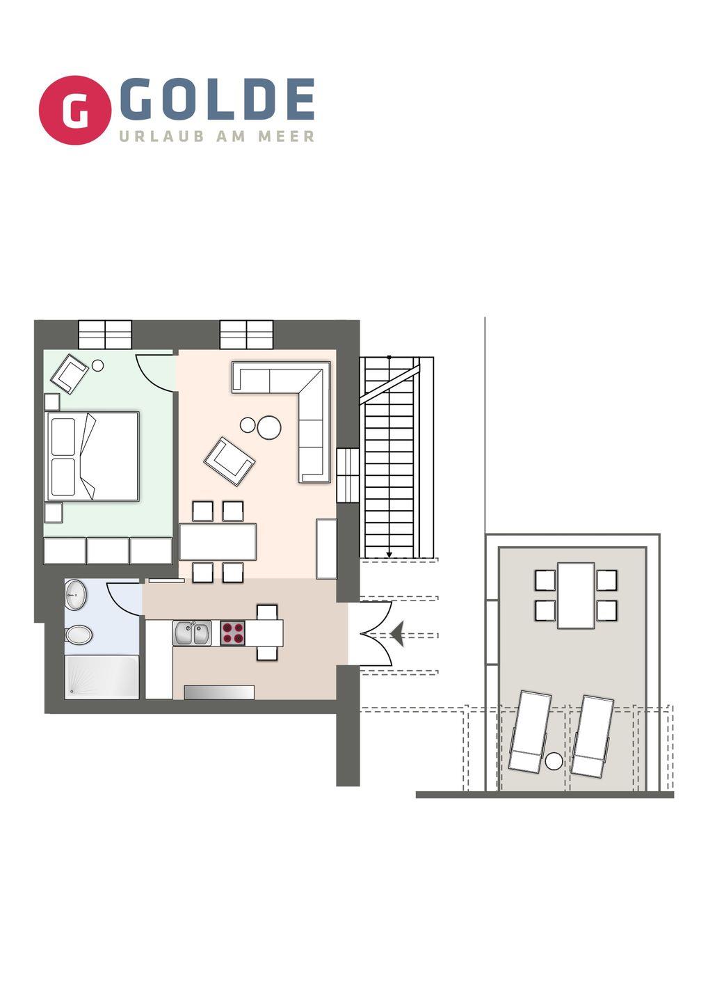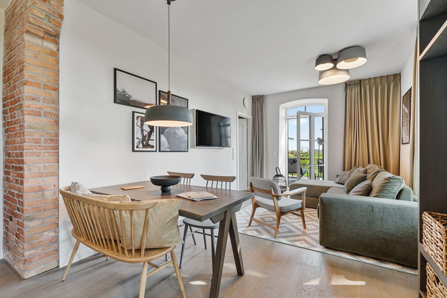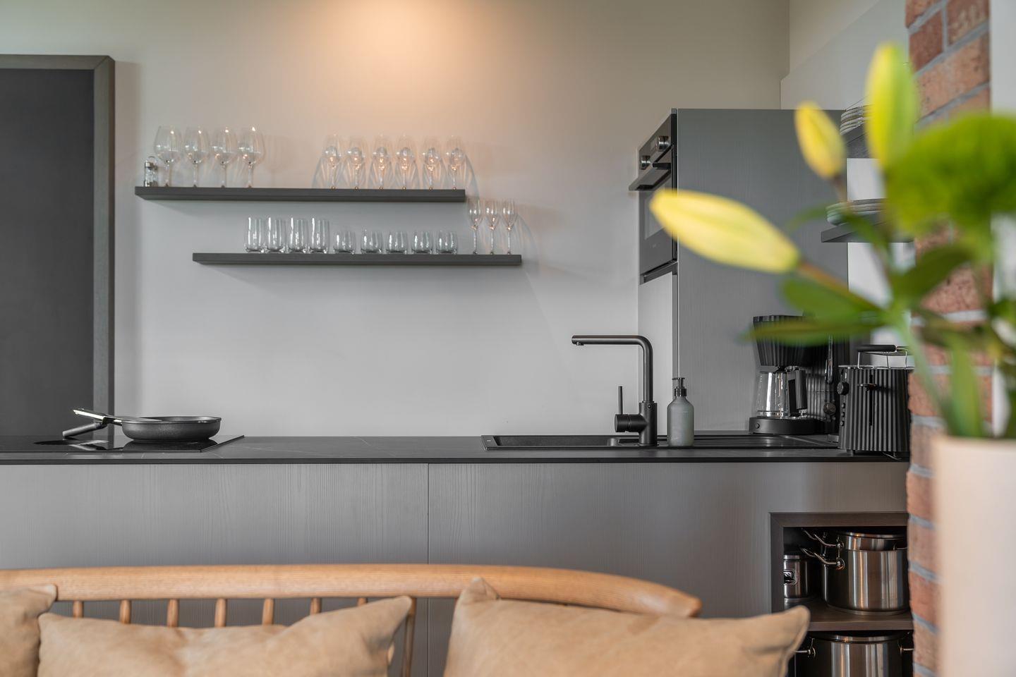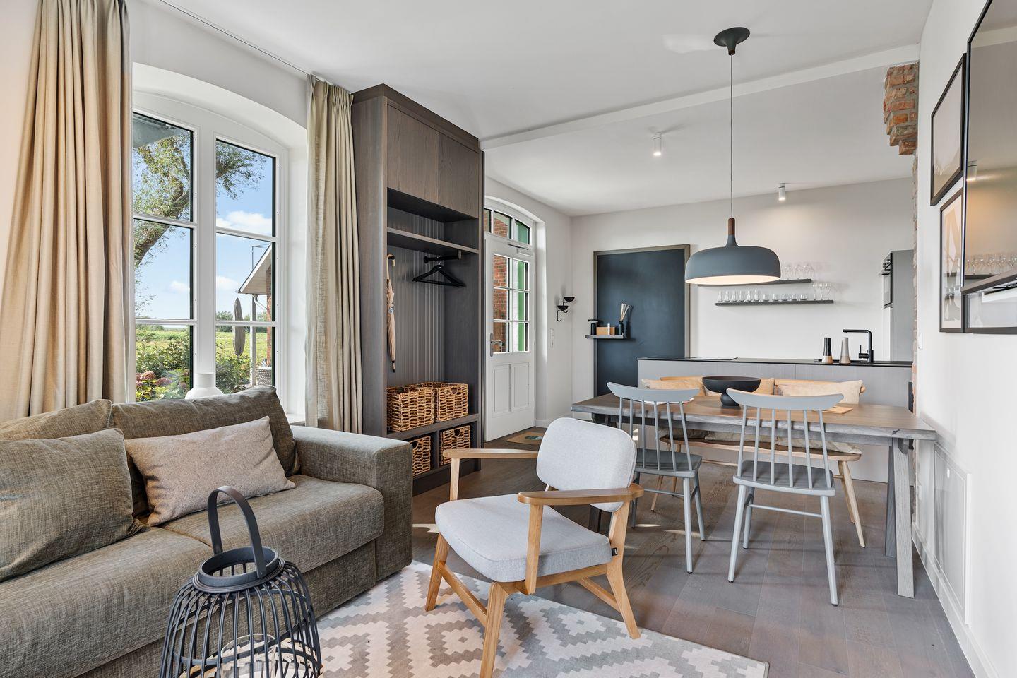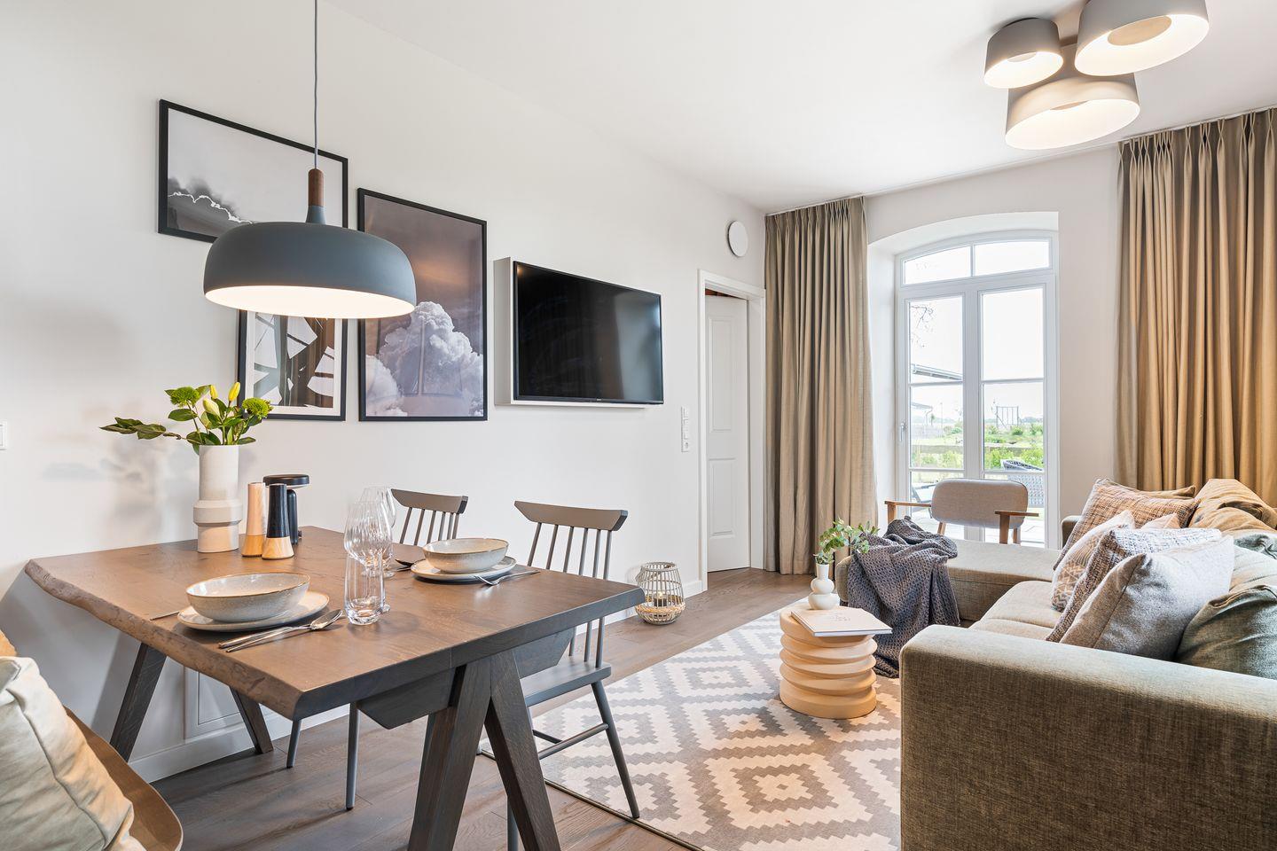 Die offene und exklusive Küche ist komplett ausgestattet und ideal für alle, die gerne selbst kochen. Hier finden Sie alle notwendigen Küchenutensilien sowie Hochwertige E-Geräte wie einen Induktionsherd, einen Backofen, eine Spülmaschine, eine Kaffeemaschine um Ihren Morgen mit einer Tasse frisch gebrühten Kaffee zu beginnen. Der eingerichtet Wohnbereich ist hell und exklusiv gestaltet und verbindet sich harmonisch mit der Küche. Gemütliche Abende können Sie beim Fernsehen verbringen; die Ferienwohnung ist mit zwei TV-Geräten ausgestattet, sodass Sie Ihre Lieblingssendungen in beiden Bereichen genießen können.
