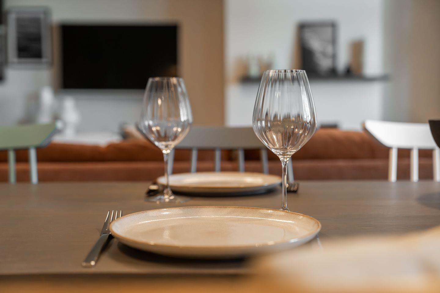 Die offene und exklusive Küche ist komplett ausgestattet und ideal für alle, die gerne selbst kochen. Hier finden Sie alle notwendigen Küchenutensilien sowie Hochwertige E-Geräte wie einen Induktionsherd, einen Backofen, eine Spülmaschine, eine Kaffeemaschine um Ihren Morgen mit einer Tasse frisch gebrühten Kaffee zu beginnen. Der eingerichtet Wohnbereich ist hell und exklusiv gestaltet und verbindet sich harmonisch mit der Küche. Gemütliche Abende können Sie beim Fernsehen verbringen; die Ferienwohnung ist mit zwei TV-Geräten ausgestattet, sodass Sie Ihre Lieblingssendungen in beiden Bereichen genießen können.
