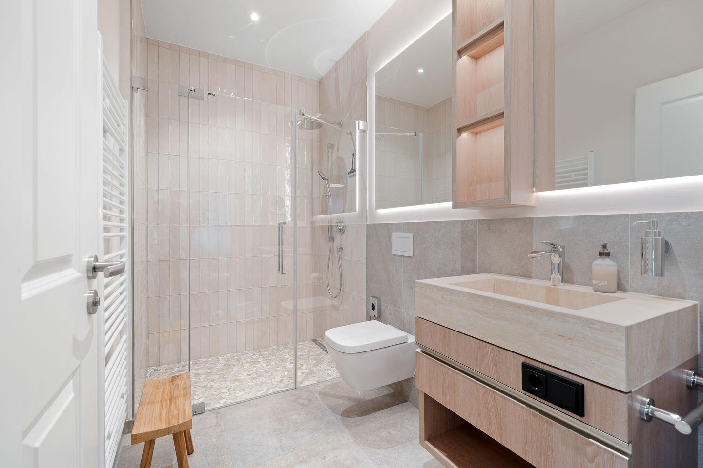Ein Highlight dieses Domizil ist die großzügige Terrasse, die mit einem Sichtschutz ausgestattet ist, um Ihnen Privatsphäre und Ruhe zu bieten. Hier können Sie die frische Luft bei einem Glas Wein genießen oder einfach die Seele baumeln lassen. Der private Parkplatz ermöglicht eine sichere An- und Abreise. Zudem befindet sich auch ein gesondertes Fahrradhaus auf Gelände, um Ihre E-Bikes sicher zu verstauen.