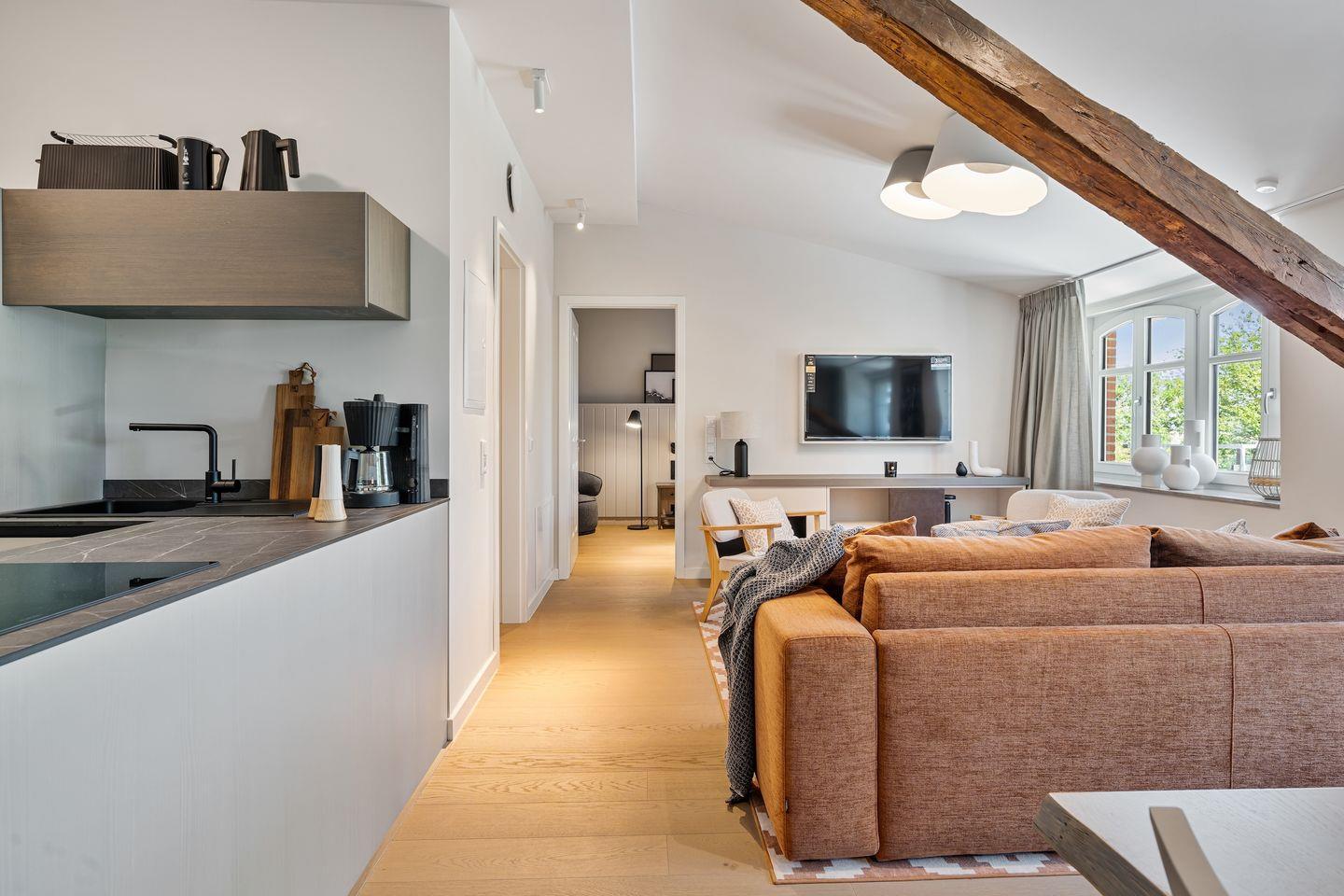 In der offenen und exklusiven Küche, die nahtlos in das Wohnzimmer übergeht - sind Sie bestens ausgestattet, um kulinarische Köstlichkeiten zuzubereiten. Die Küche ist mit hochwertigen E-Geräten ausgestattet, darunter ein Induktionsherd, ein Backofen, eine Spülmaschine, ein Kühlschrank mit Gefrierfach, sowie Mikrowelle, Toaster und Kaffeemaschine.