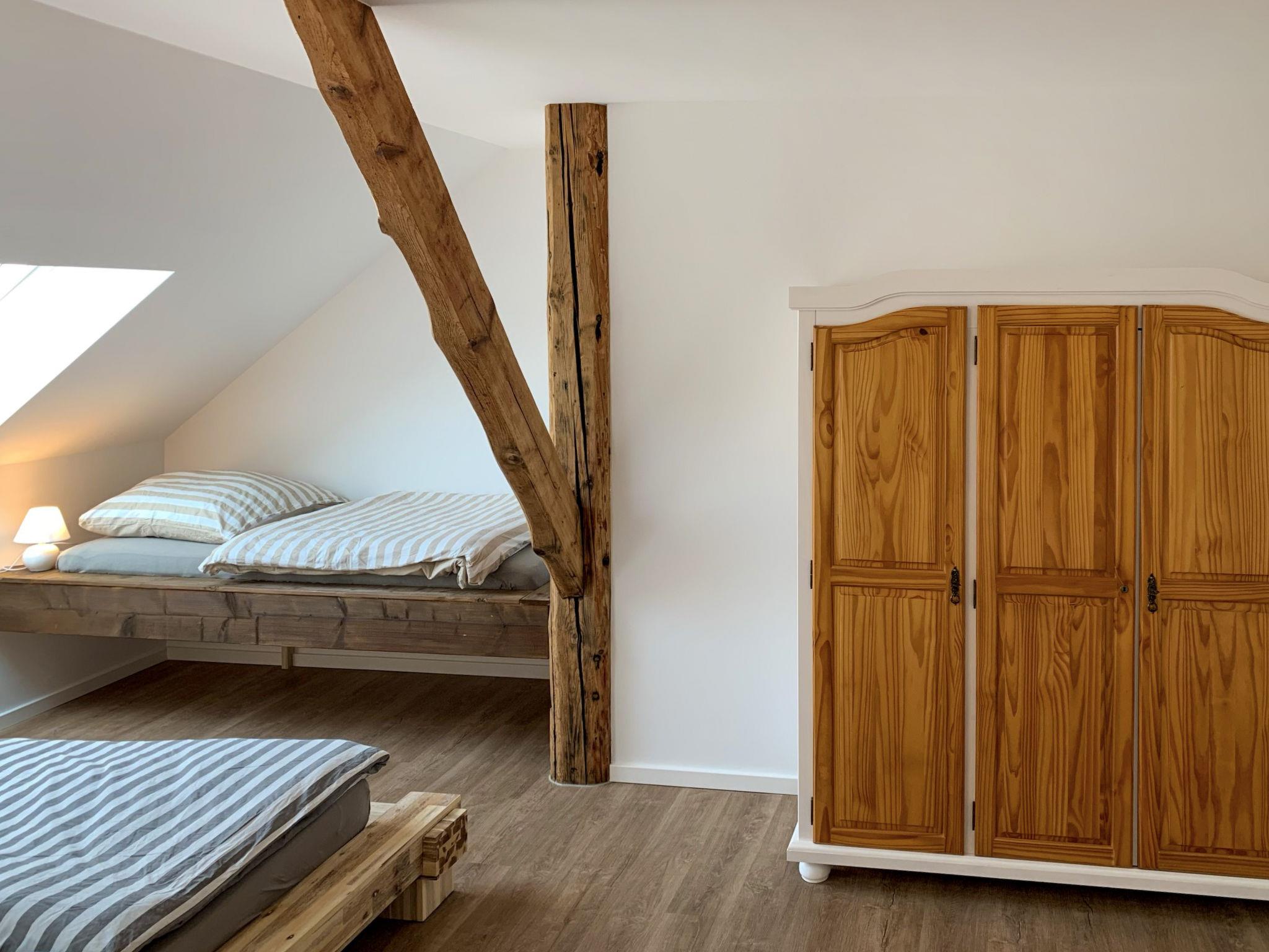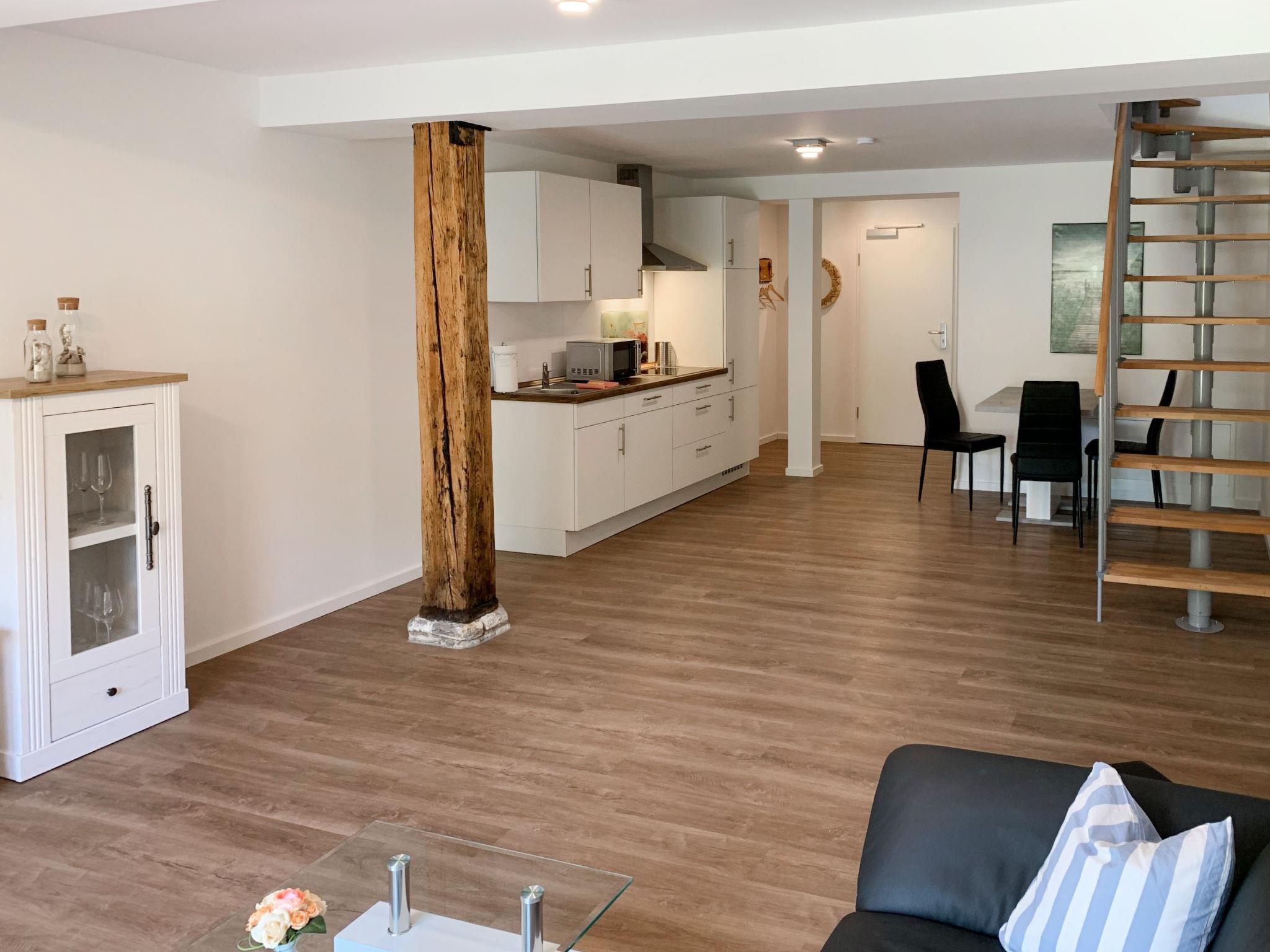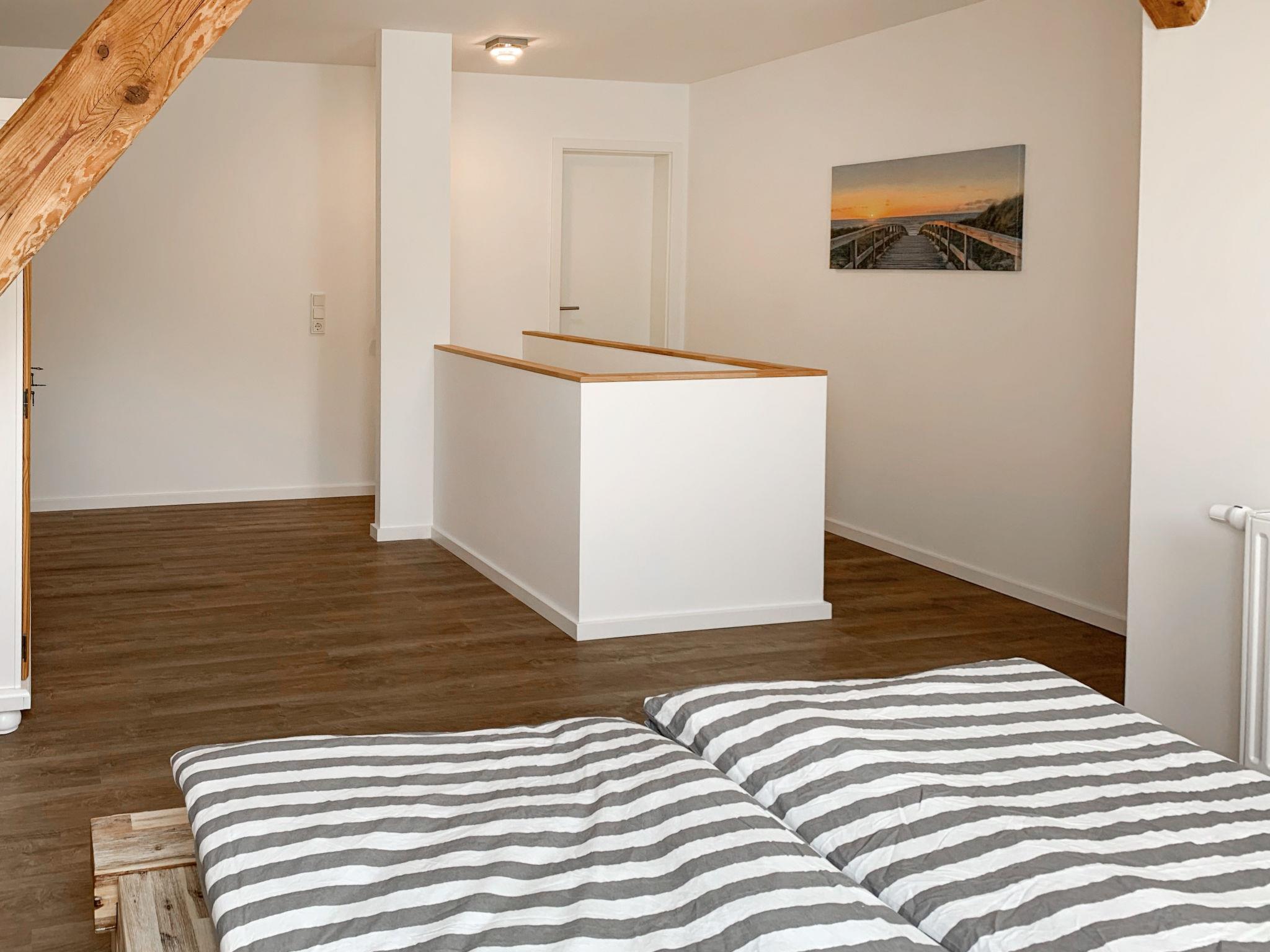 "Langeoog", 2-room apartment 70 m2 on 2 levels, on the ground floor. Tasteful and cosy furnishings: living/dining room with satellite TV (flat screen). Exit to the terrace. Kitchenette (dishwasher, 4 ceramic glass hob hotplates, toaster, kettle, microwave, electric coffee machine). Sep. WC. Upper floor: 1 open room with sloping ceilings with 1 bed (80 cm, length 200 cm), 1 double bed (2 x 90 cm, length 200 cm). Shower/WC. Terrace furniture. Facilities: children's high chair (extra). Internet (WiFi, free). Please note: non-smokers only. Maximum 1 small pet/ dog allowed. Smoke alarm.
