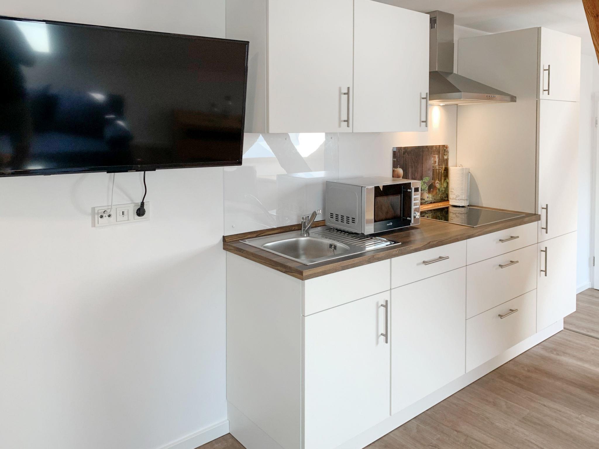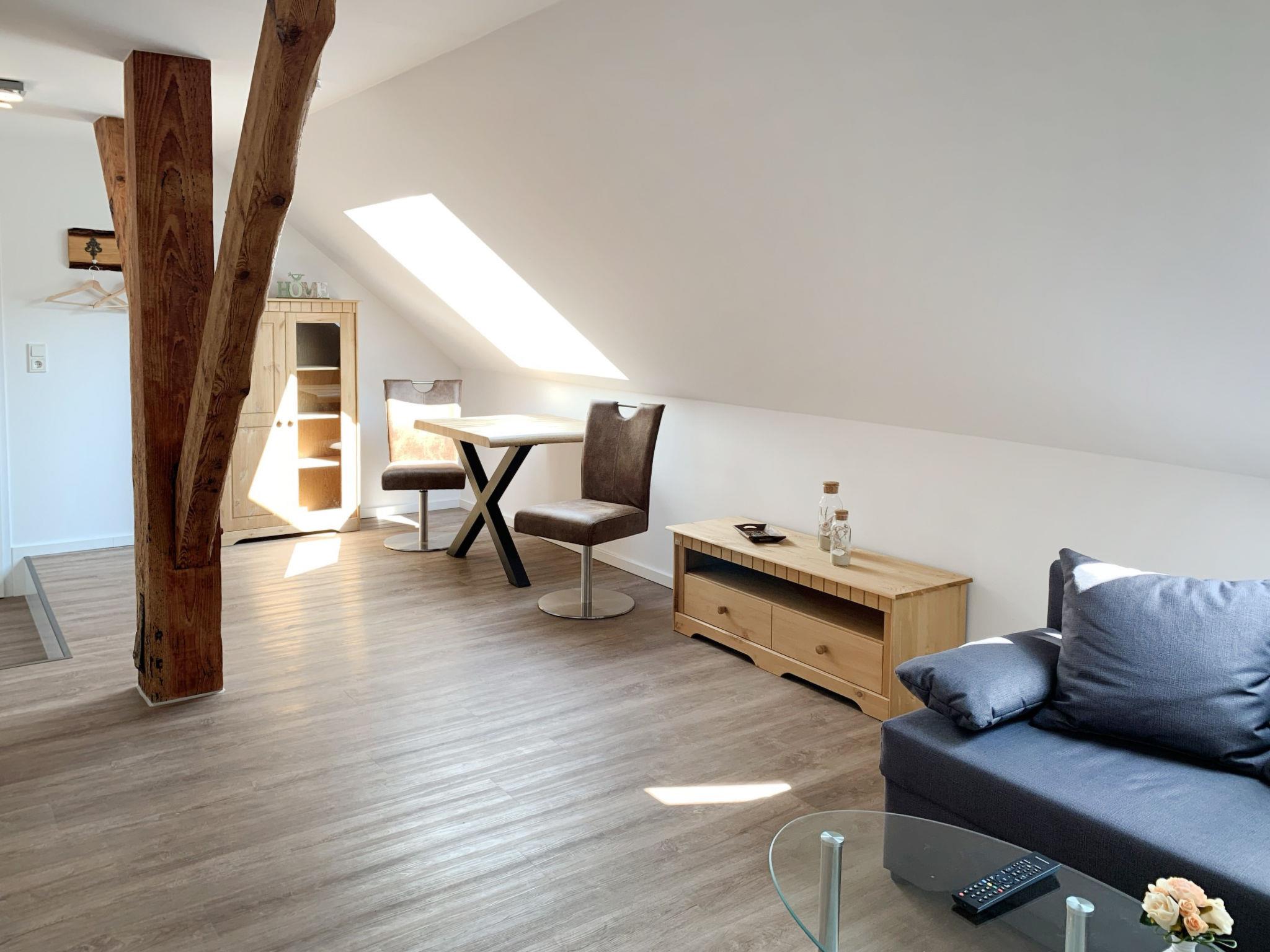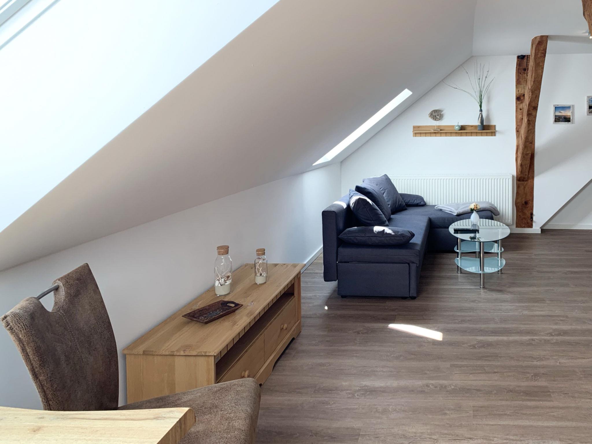"Baltrum", 2-room apartment 53 m2, on the upper floor. With sloping ceilings, tasteful and cosy furnishings: living/dining room with satellite TV (flat screen). 1 room with 1 double bed (2 x 90 cm, length 200 cm). Kitchenette (dishwasher, 4 ceramic glass hob hotplates, toaster, kettle, microwave, electric coffee machine). Shower/WC. Facilities: children's high chair (extra). Internet (WiFi, free). Please note: non-smokers only. Smoke alarm.