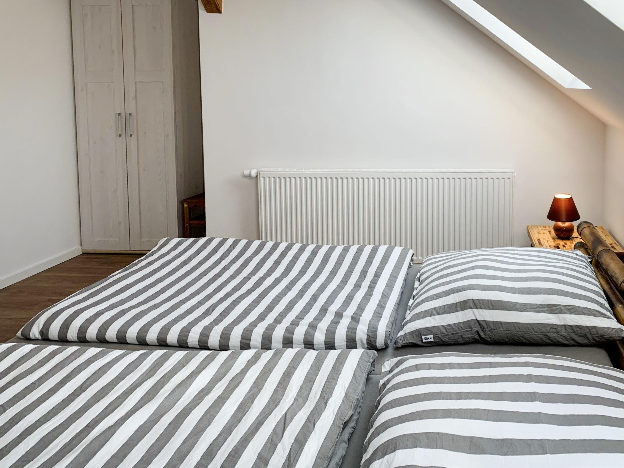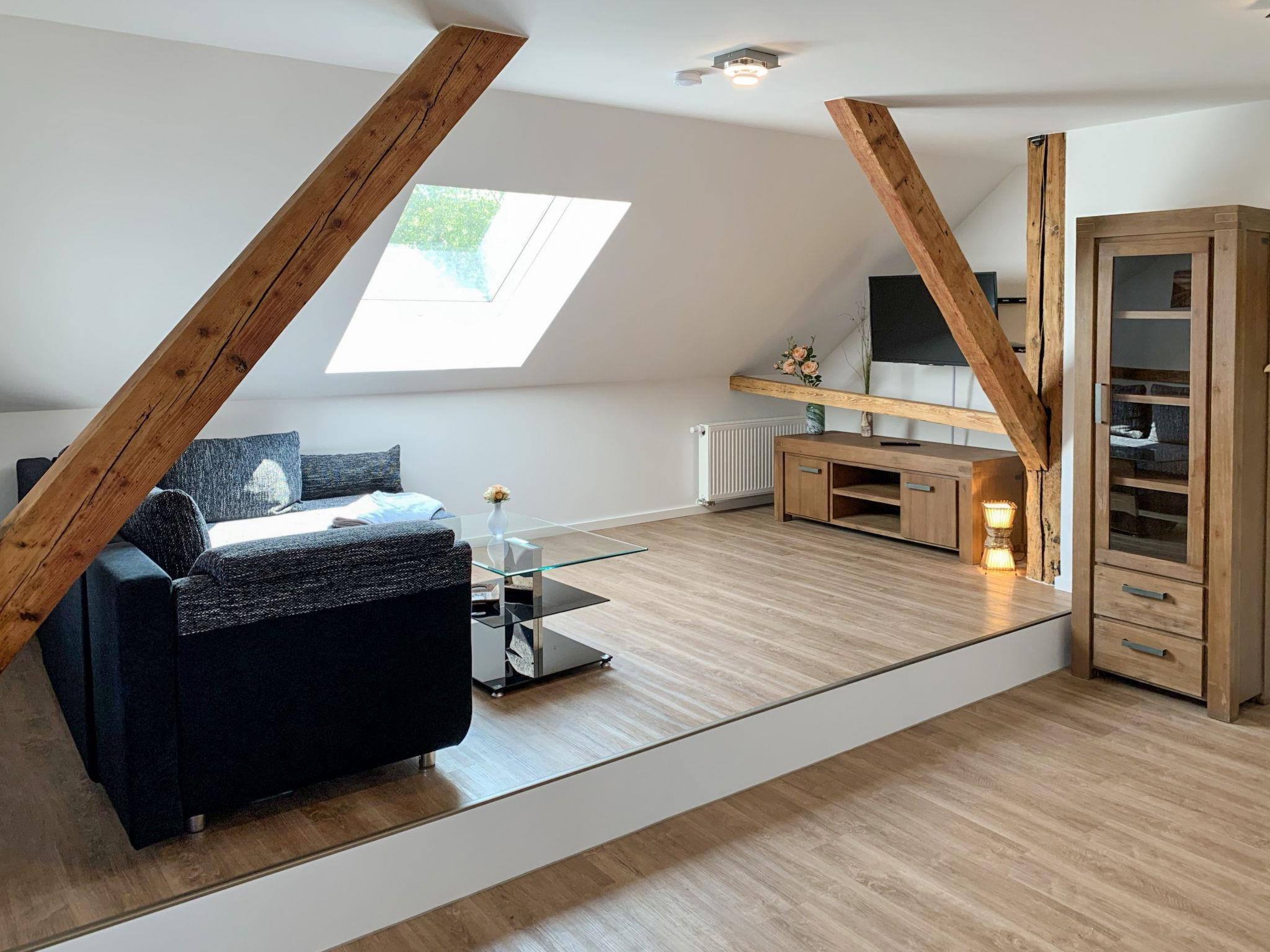 "Borkum", 4-room apartment 92 m2, on the upper floor. With sloping ceilings, tasteful and cosy furnishings: living/dining room with satellite TV (flat screen). 1 room with 1 double bed (2 x 90 cm, length 200 cm). 1 room with 1 double bed (2 x 80 cm, length 200 cm). 1 small room with 1 bed (90 cm, length 200 cm). Kitchenette (dishwasher, 4 ceramic glass hob hotplates, toaster, kettle, microwave, electric coffee machine). Shower/WC. Facilities: children's high chair (extra). Internet (WiFi, free). Please note: non-smokers only. Maximum 1 small pet/ dog allowed. Smoke alarm.
