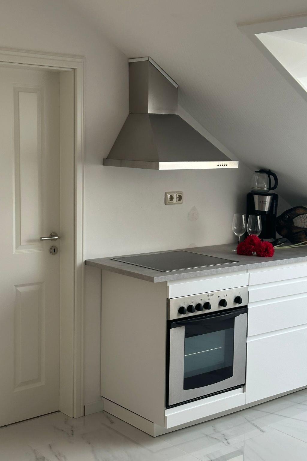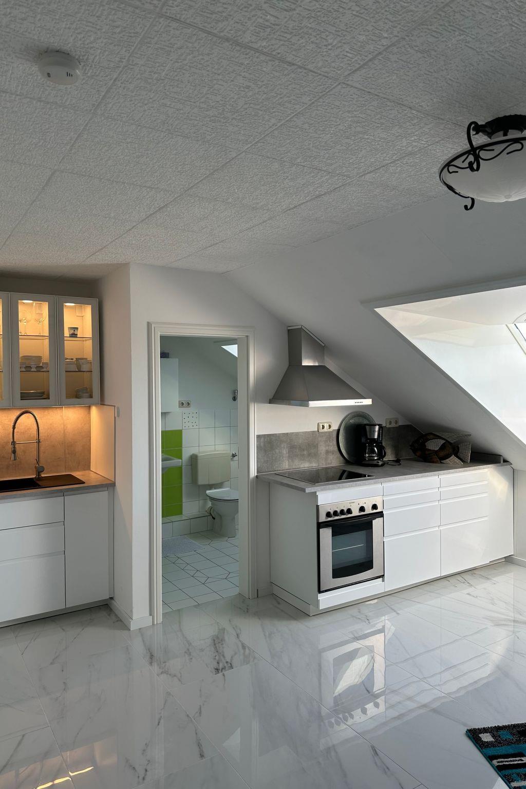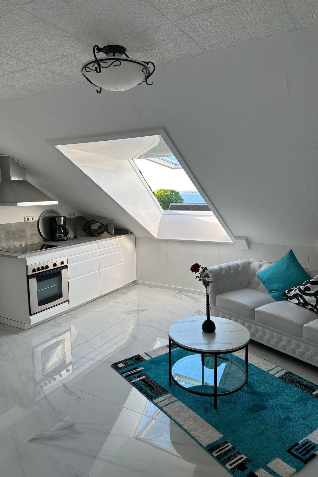 Inside, you will find a perfectly equipped flat that combines modern comfort with a cosy ambience. The kitchen is equipped with everything your heart desires, including a coffee machine and kettle for cosy mornings. The living and dining area is the ideal place to enjoy meals together or simply relax. The bedroom with a comfortable double bed promises restful nights. The highlight: underfloor heating throughout the flat provides cosy warmth. The modern shower room also leaves nothing to be desired.