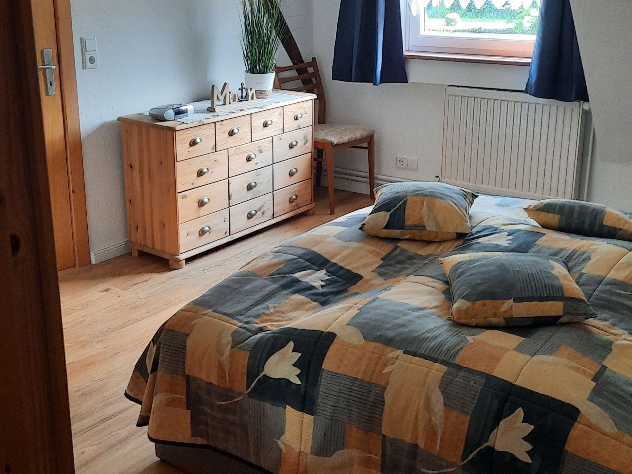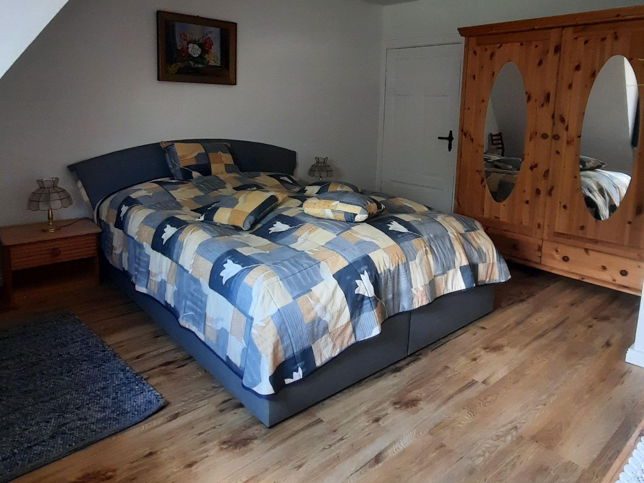 Das Schlafzimmer ist mit einem Doppelbett, einem Kleiderschrank und einer Kommode eingerichtet.