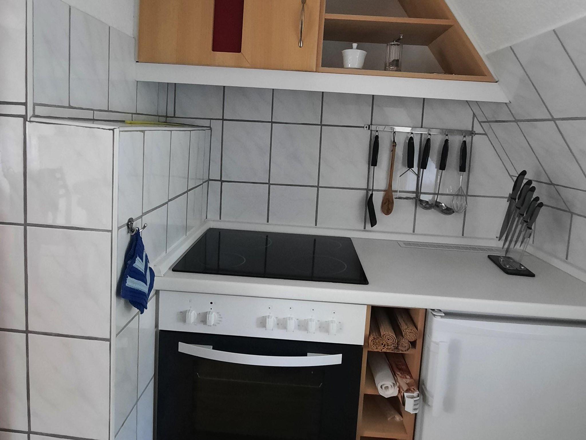 Die Wohnküche sorgt für einen gemütlichen Flair. Sie ist ausgestattet mit einem Herd, einem Backofen, einem Kühlschrank mit Gefrierfach sowie einer Kaffeemaschine, einem Toaster und einem Wasserkocher.