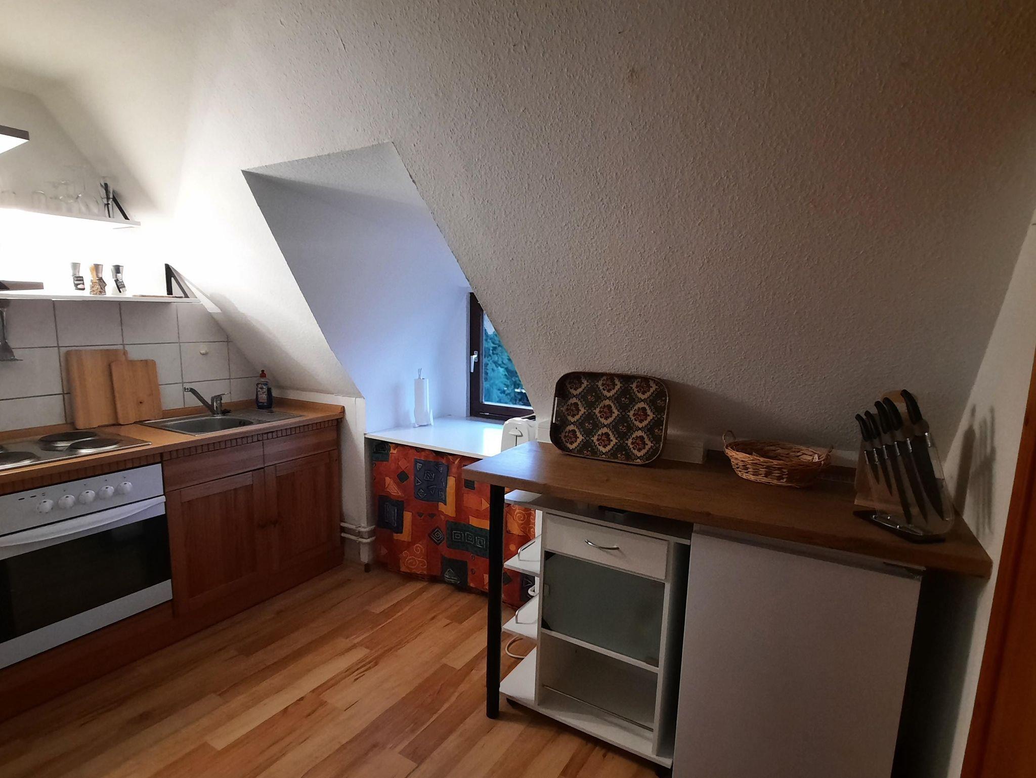Die Wohnküche sorgt für einen gemütlichen Flair. Sie ist ausgestattet mit einem Herd, einem Backofen, einem Kühlschrank mit Gefrierfach sowie einer Kaffeemaschine, einem Toaster und einem Wasserkocher.