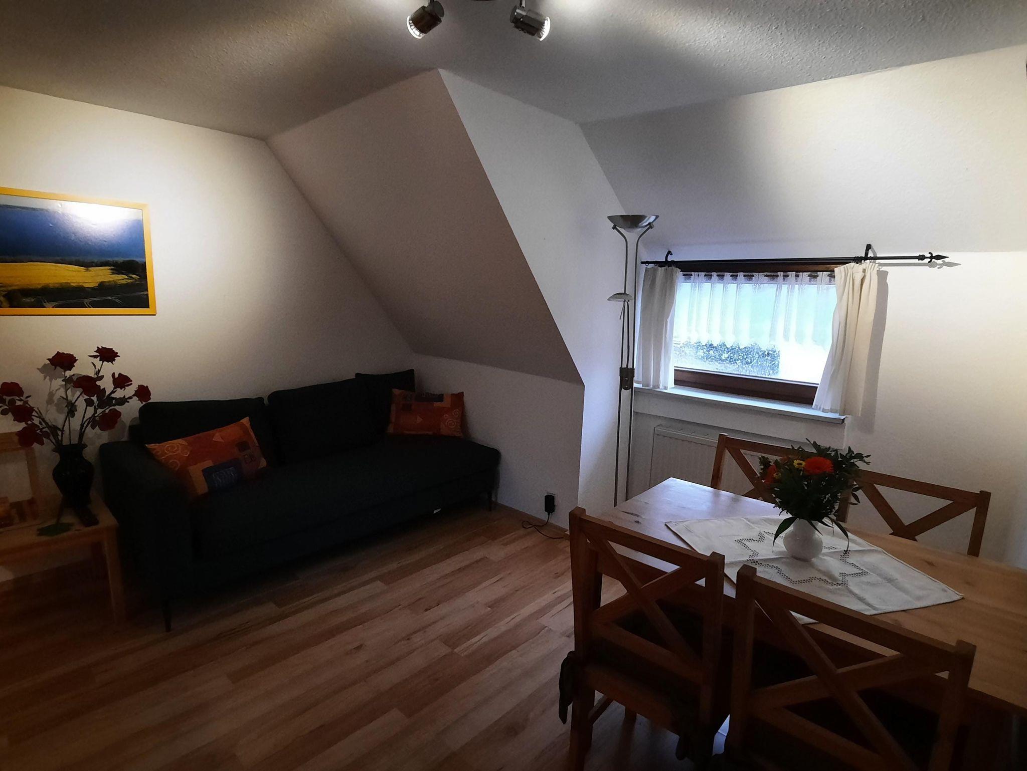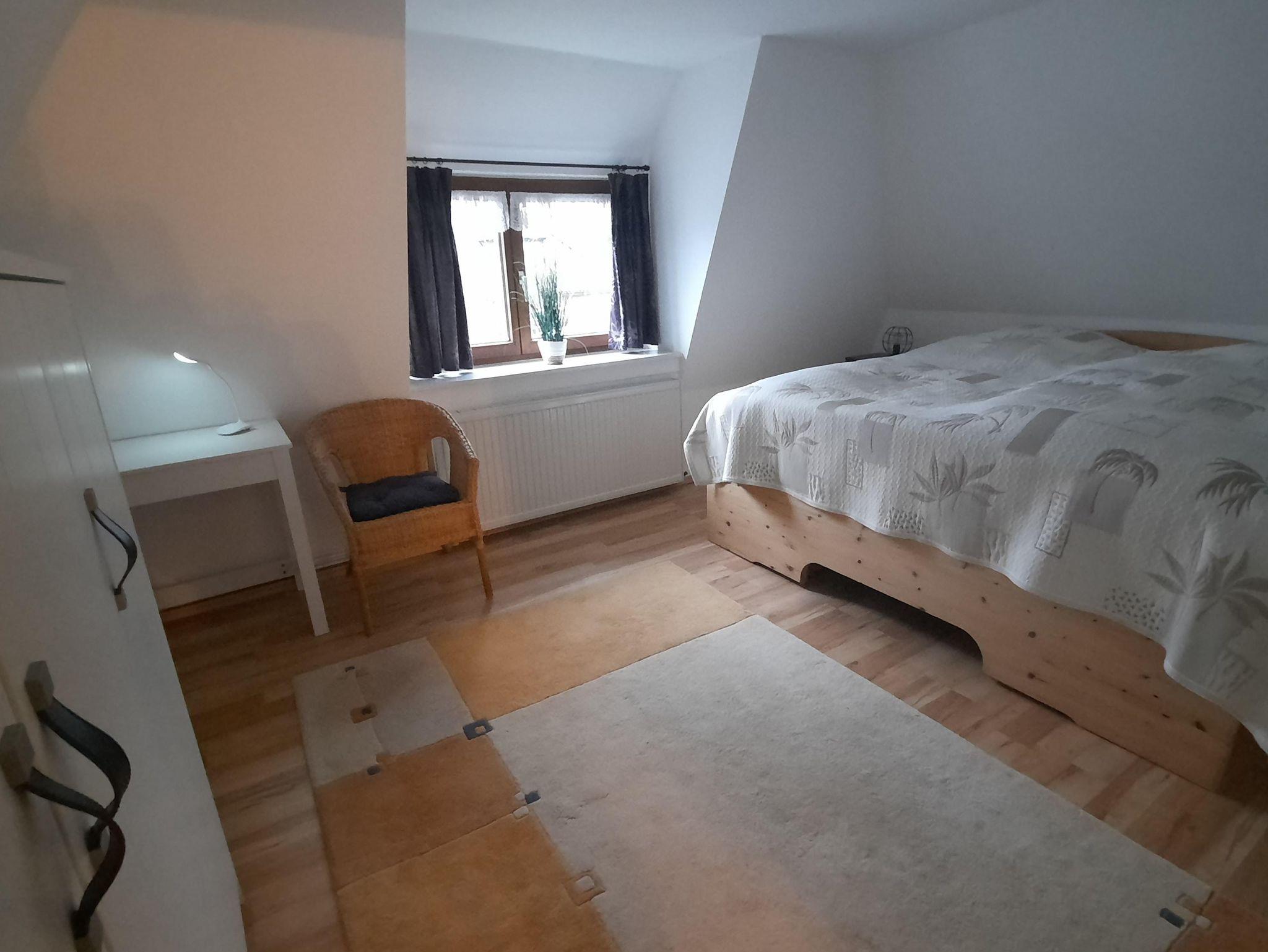 Das Schlafzimmer ist mit einem Doppelbett, einem Einbau-Kleiderschrank sowie einem Schreibtisch eingerichtet. Im Wohnzimmer befinden sich 1 Couch (die auch als Schlafgelegenheit genutzt werden kann) ein Esstissch mit 4 Stühlen sowie eine Kommode.