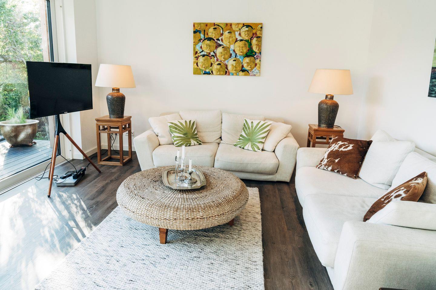 Dieses charmante Ferienhaus „House Kowloon“ bietet auf 89 m², Platz für bis zu 4 Personen. Es erwarten Sie offene, lichtdurchflutete Räumlichkeiten, in einem modernen Stil. Von dem großzügigen Wohn-/ Essbereich mit integrierter vollausgestatteter Küche, gelangt man auf die sonnenreiche Terrasse, die Ihnen einen Weber-Grill bietet. Beide Schlafzimmer sind hochwertig eingerichtet, eines mit einem Doppelbett & eines mit 2 Einzelbetten. Das moderne Badezimmer verfügt über eine ebenerdige Dusche.