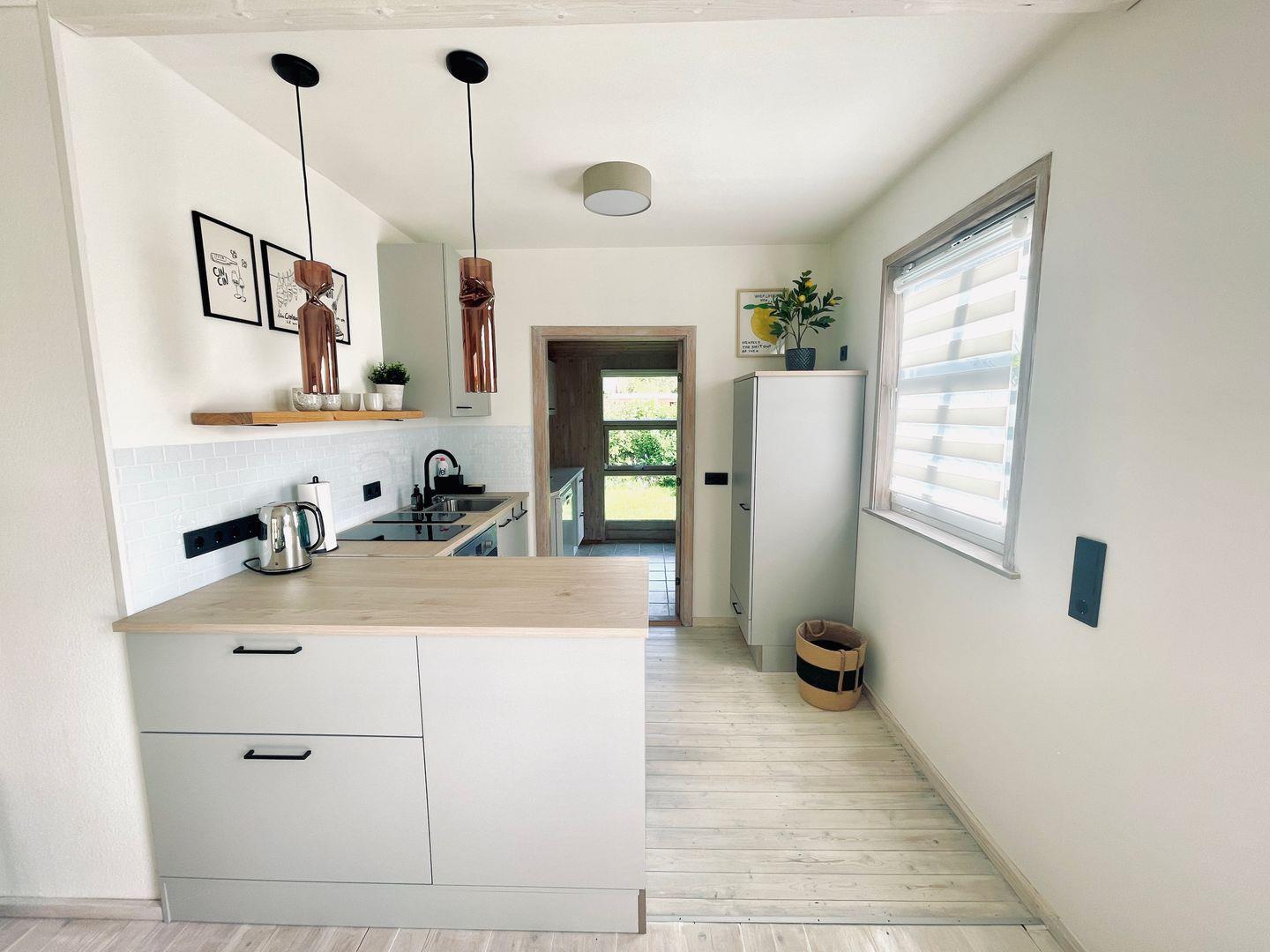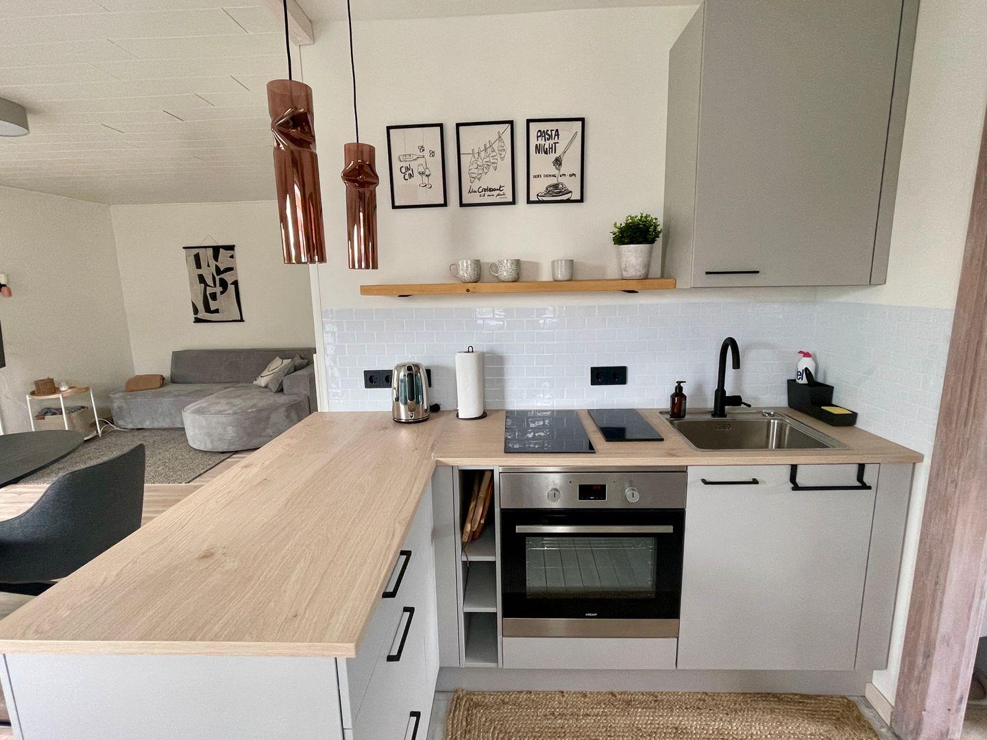 • Offene Küche mit diversen Geräten (u. a. Nespresso, FilterKaffeemaschine, Waschtrockner, Geschirrspüler)