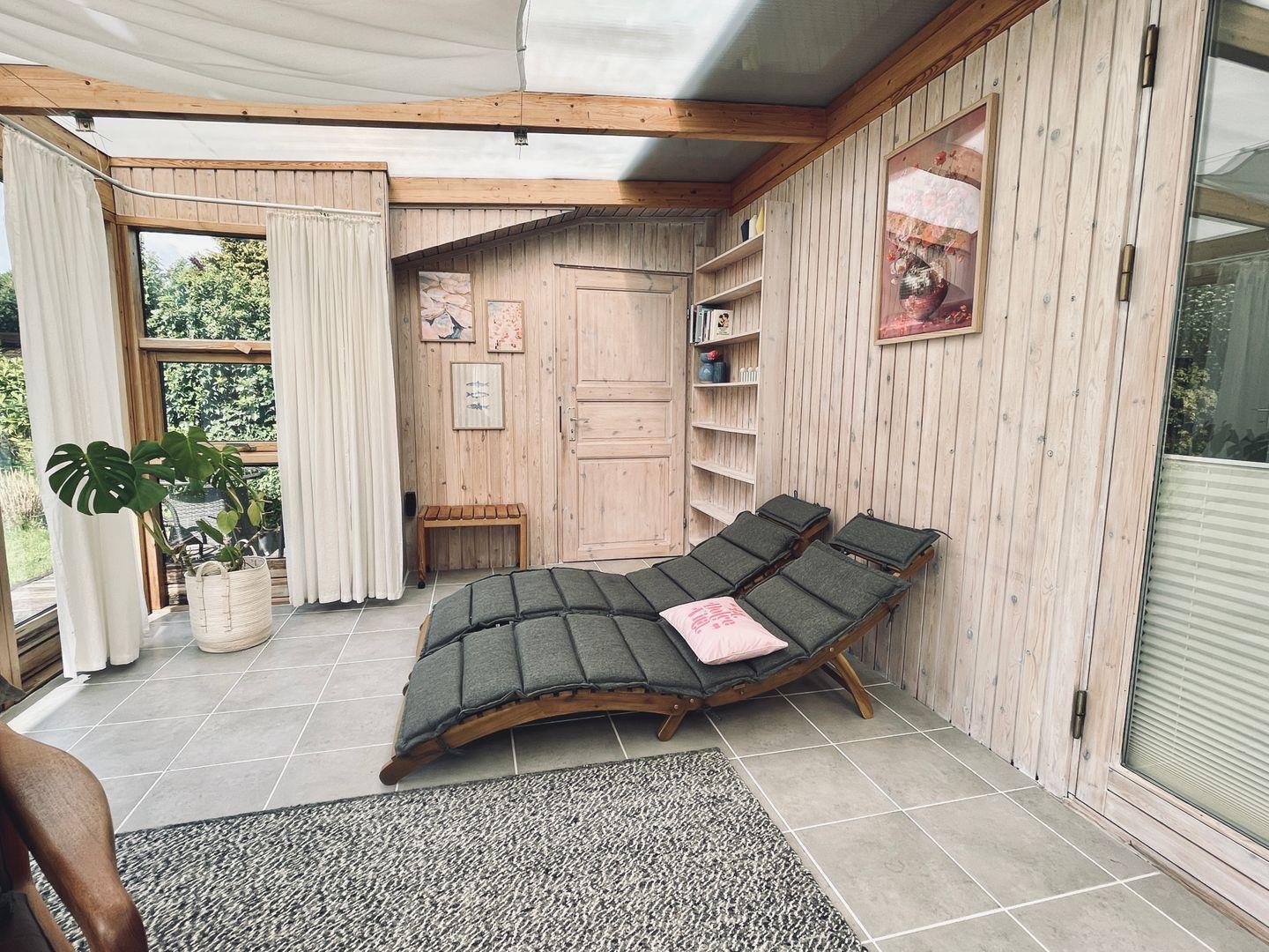 • Wintergarten mit finnischer Sauna, Relaxliegen, Bücherauswahl