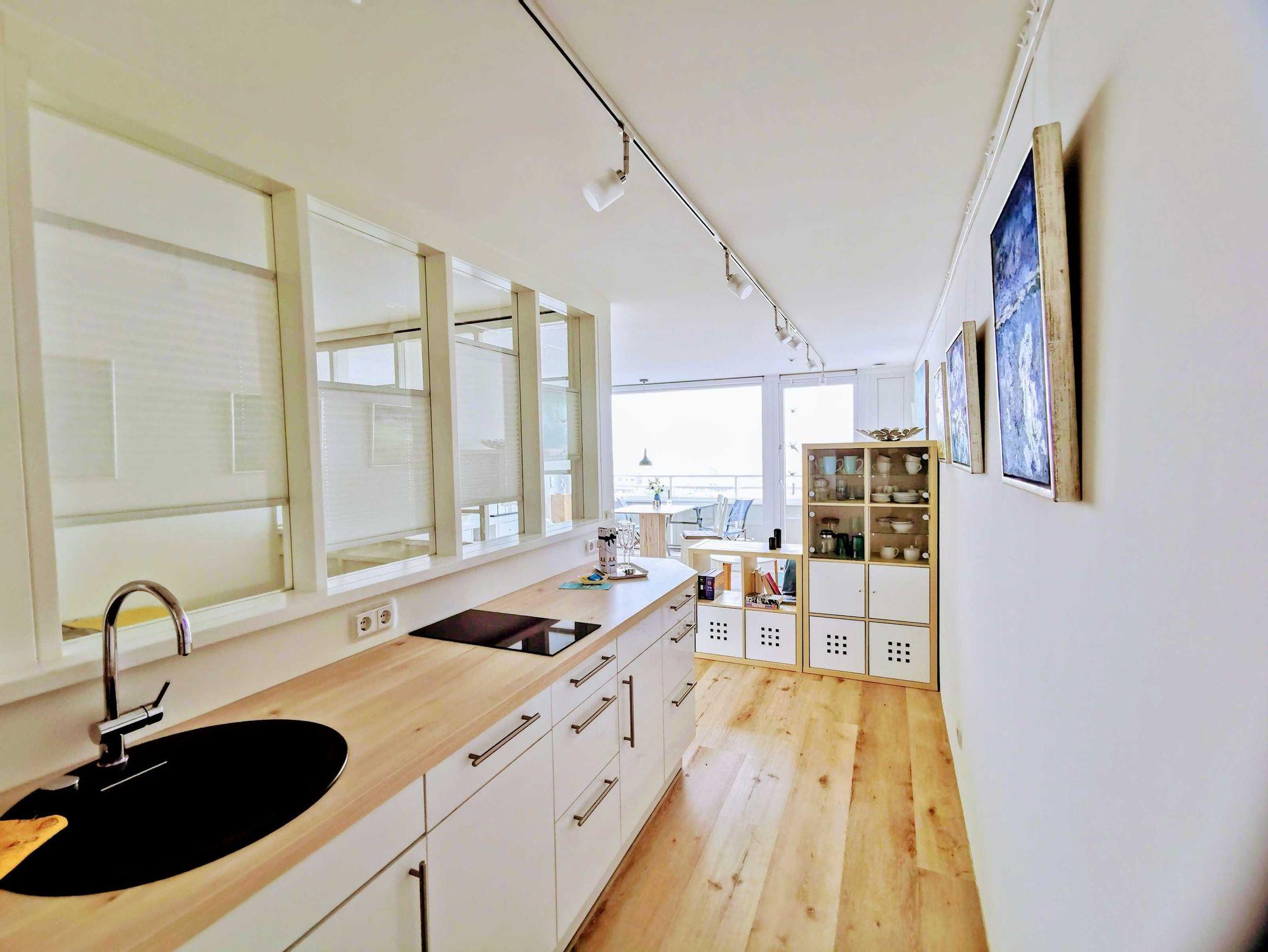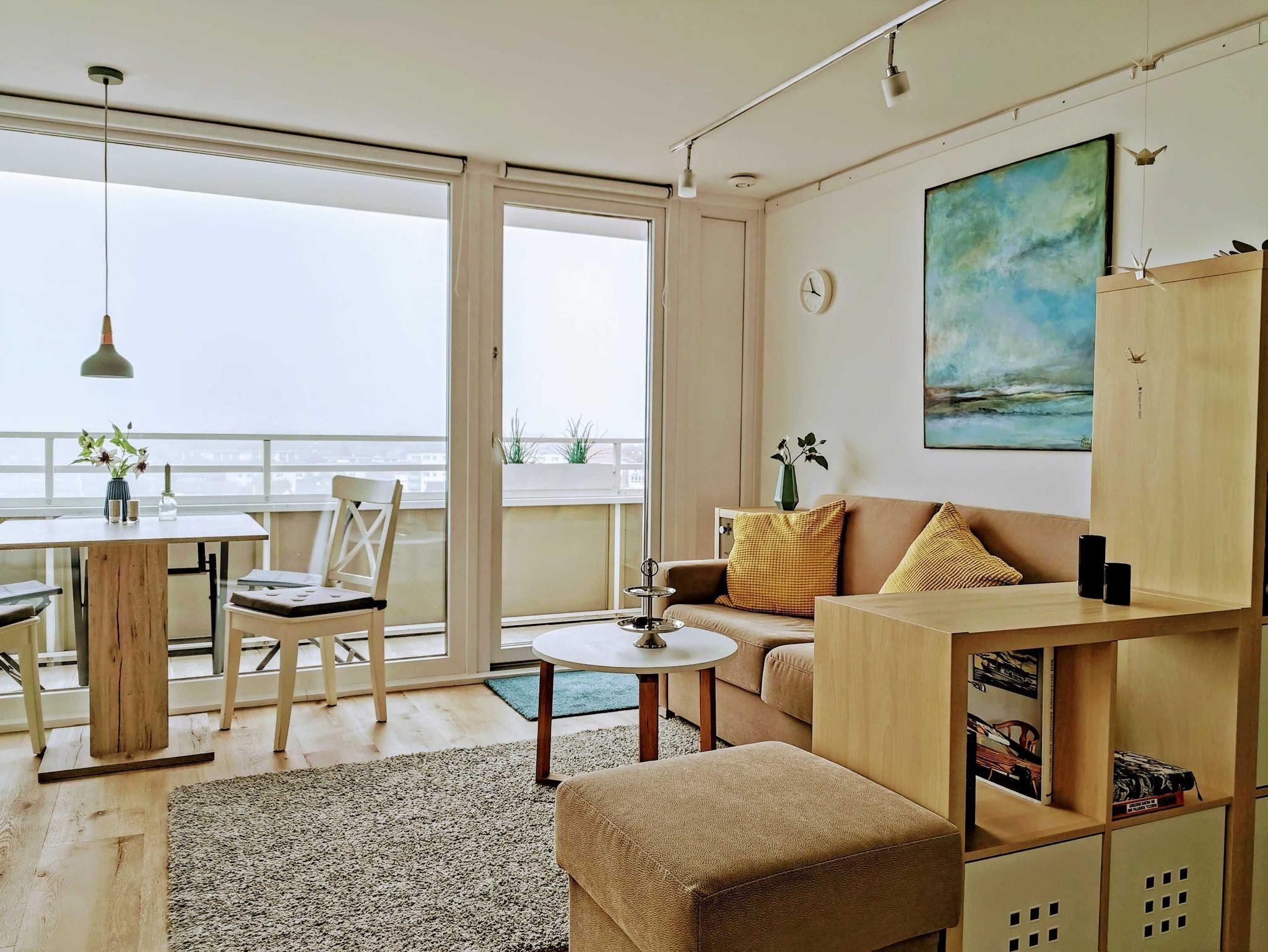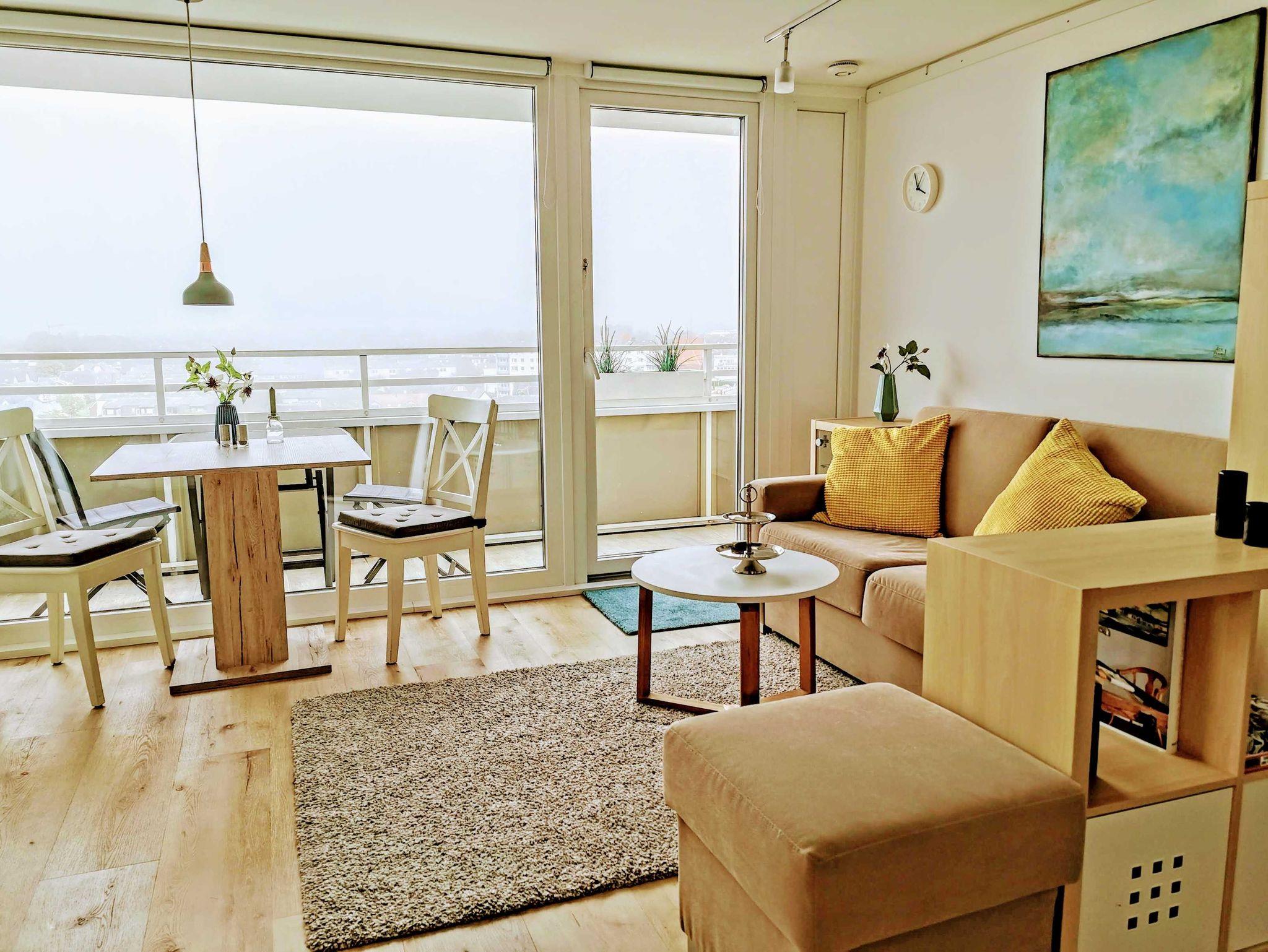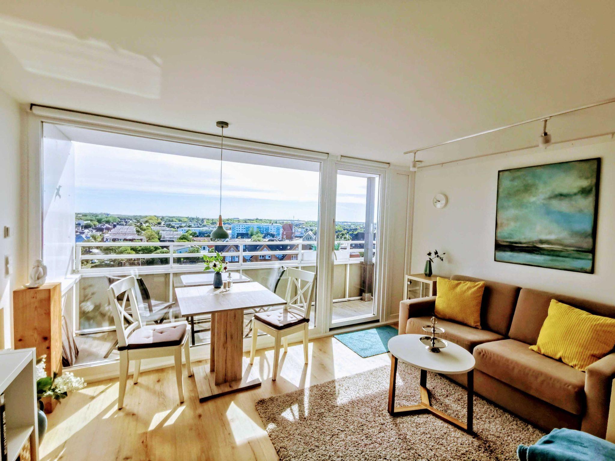 Dieses helle und freundliche neue Appartment überrascht Sie mit einem einmaligen Blick über die Insel Sylt. Hoch oben im höchsten Stockwerk (8.Stock!) vom Balkon im Hanseatenhaus blicken Sie über die Dächer von Westerland bis zum Meer. Aufgrund der Höhe ein ruhiges Appartment und dennoch mitten im Zentrum zwischen Strand und Bahnhof gelegen. Hell und modern eingerichtet mit einem Schlafraum mit Doppelbett sowie einer hochwertigen Schlafcoach bietet die 1,5-Zimmerwohnung Schlafmöglichkeit für 1- 3 Personen. In der von Grund auf frisch renovierten Ferienwohnung mit Liebe zum Detail fühlen Sie sich bei uns zu Hause. Die neue Küchenzeile ausgestattet mit einer Mikrowelle/Backofen, 2-Platten Carankochfeld, Toaster, Kaffeemaschine, Wasserkocher und Geschirr für den täglichen Bedarf. Und natürlich das separate, moderne Bad mit einer großen Dusche mit Rainshower, WC, Waschtisch, Handtuchwärmer und Haartrockner.
