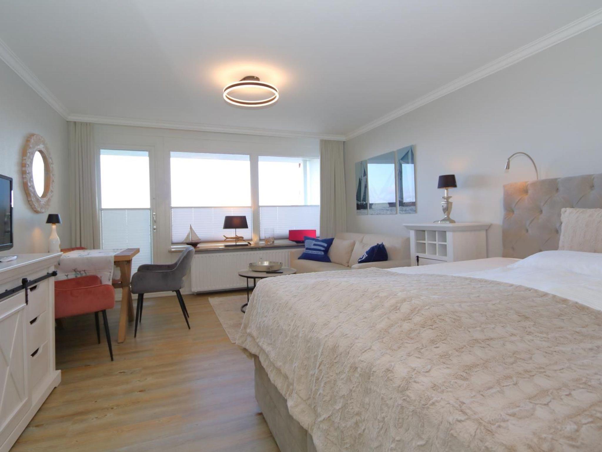 Das Appartement ist großzügig ausgestattet mit u.a. einem festen Boxspringbett, und Westbalkon, moderner Küchenzeile im Flur und ein Badezimmer mit Dusche.