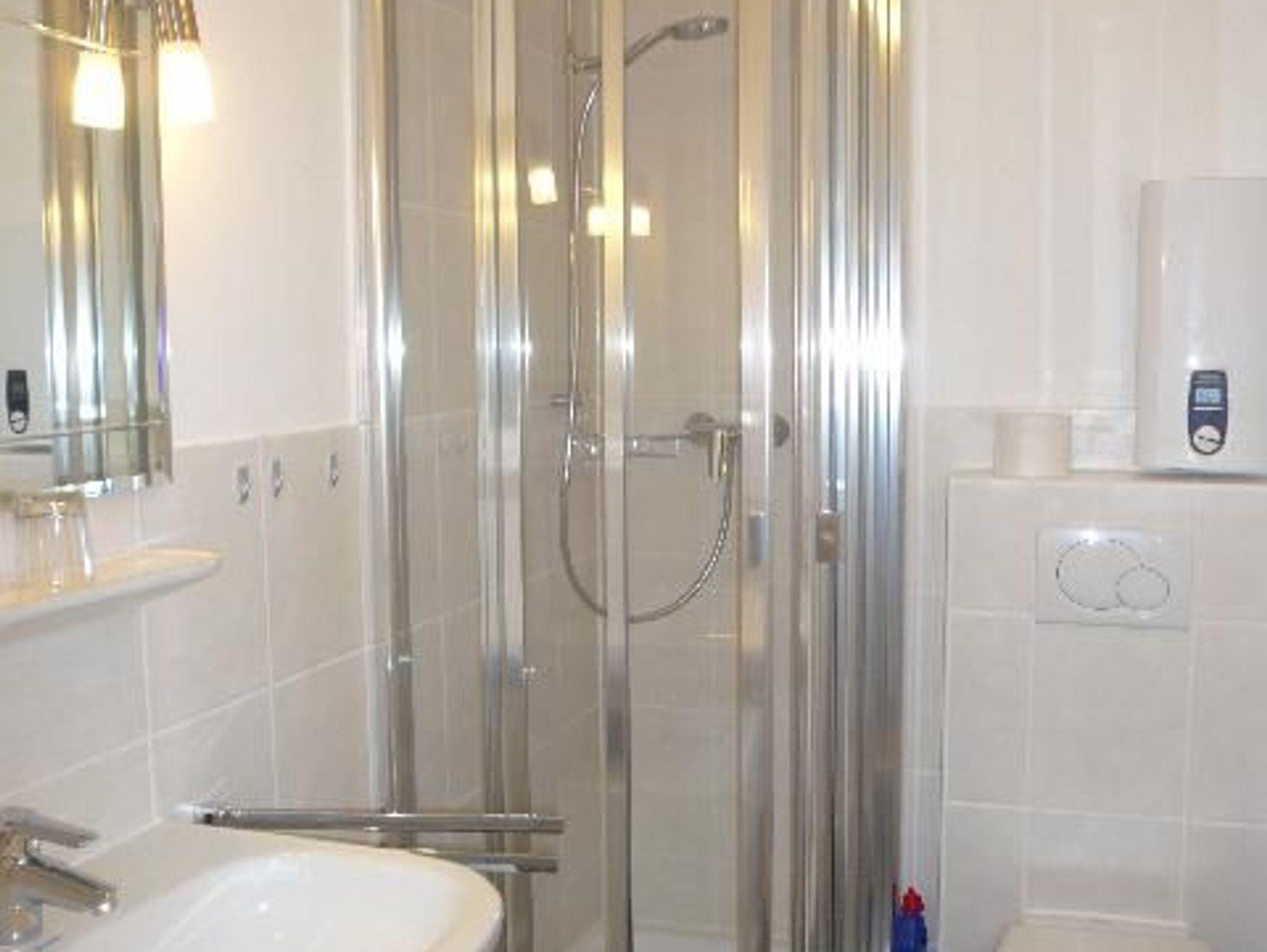 Im Wohnzimmer steht die neue Sitzgarnitur mit 2 Sesseln und bequemer Couch. Flachbild-TV und Kompaktanlage sind vorhanden. Am Südbalkon steht der Essplatz, daneben ist in einer Nische die neue Küche mit Geschirrspüler, 4er-Ceranfeld und Backofen untergebracht. Zwei Schlafzimmer sind vorhanden. In dem großen Schlafzimmer steht ein Doppelbett, in dem kleineren ein Etagenbett, in dem auch Erwachsene schlafen können. Das Bad hat eine großzügige Dusche.