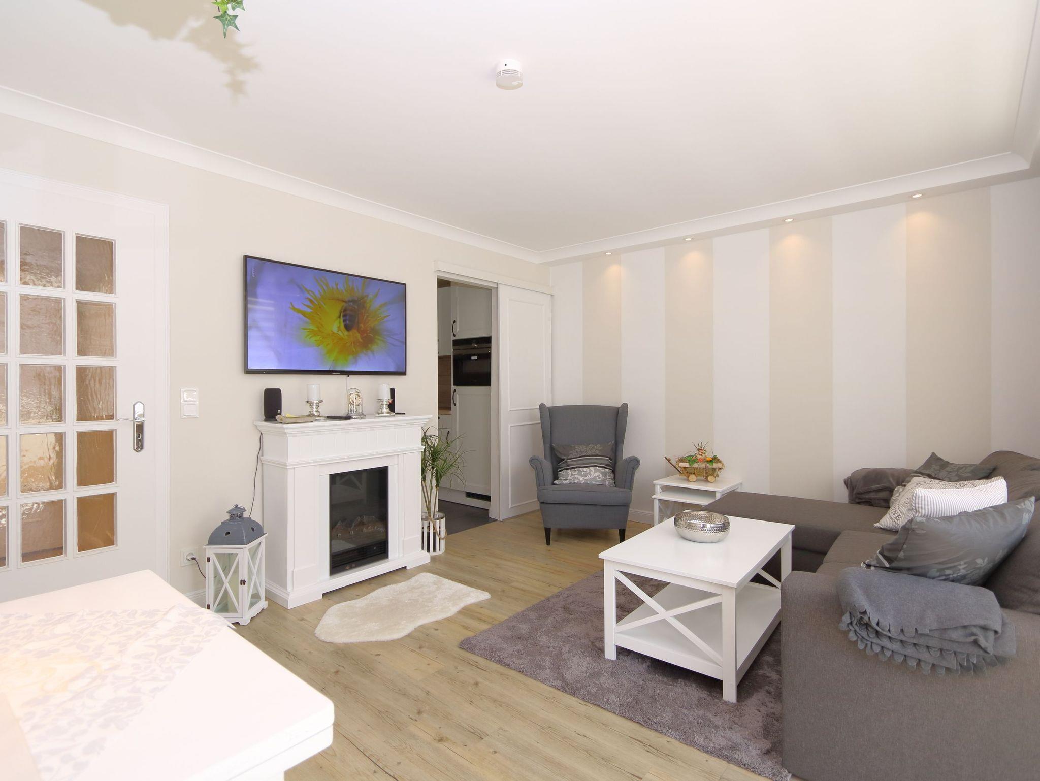 Im Wohnzimmer laden der Essbereich, eine gemütliche Sitzecke, welche man zum Doppelbett umbauen kann und ein Flachbildfernseher mit allen Zugängen für Netflix, Amazon und vielen mehr sowie ein Elektro-Kamin zum Verweilen ein.